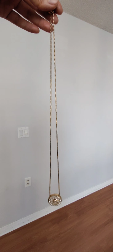 Selling a lovely gold-tone necklace with a starburst pendant! The pendant is circular and encrusted with clear stones around the edge and a star design in the centre. It's in great condition and would make a beautiful addition to any outfit. Check out my other listing. There may be something else you're also interested.