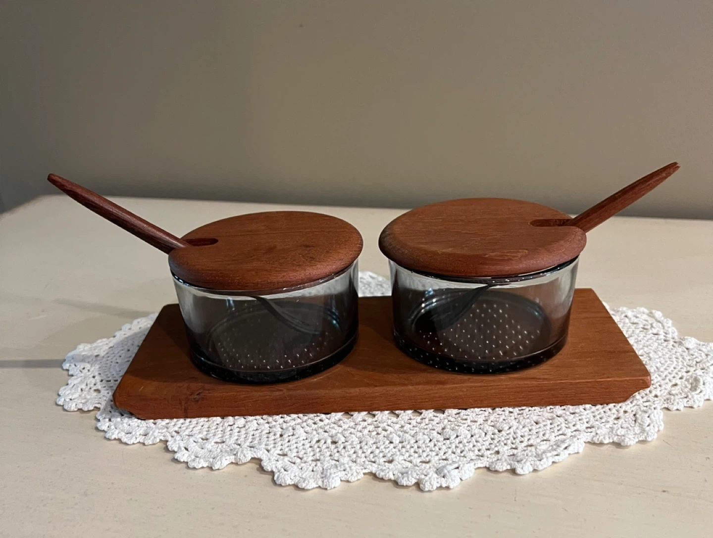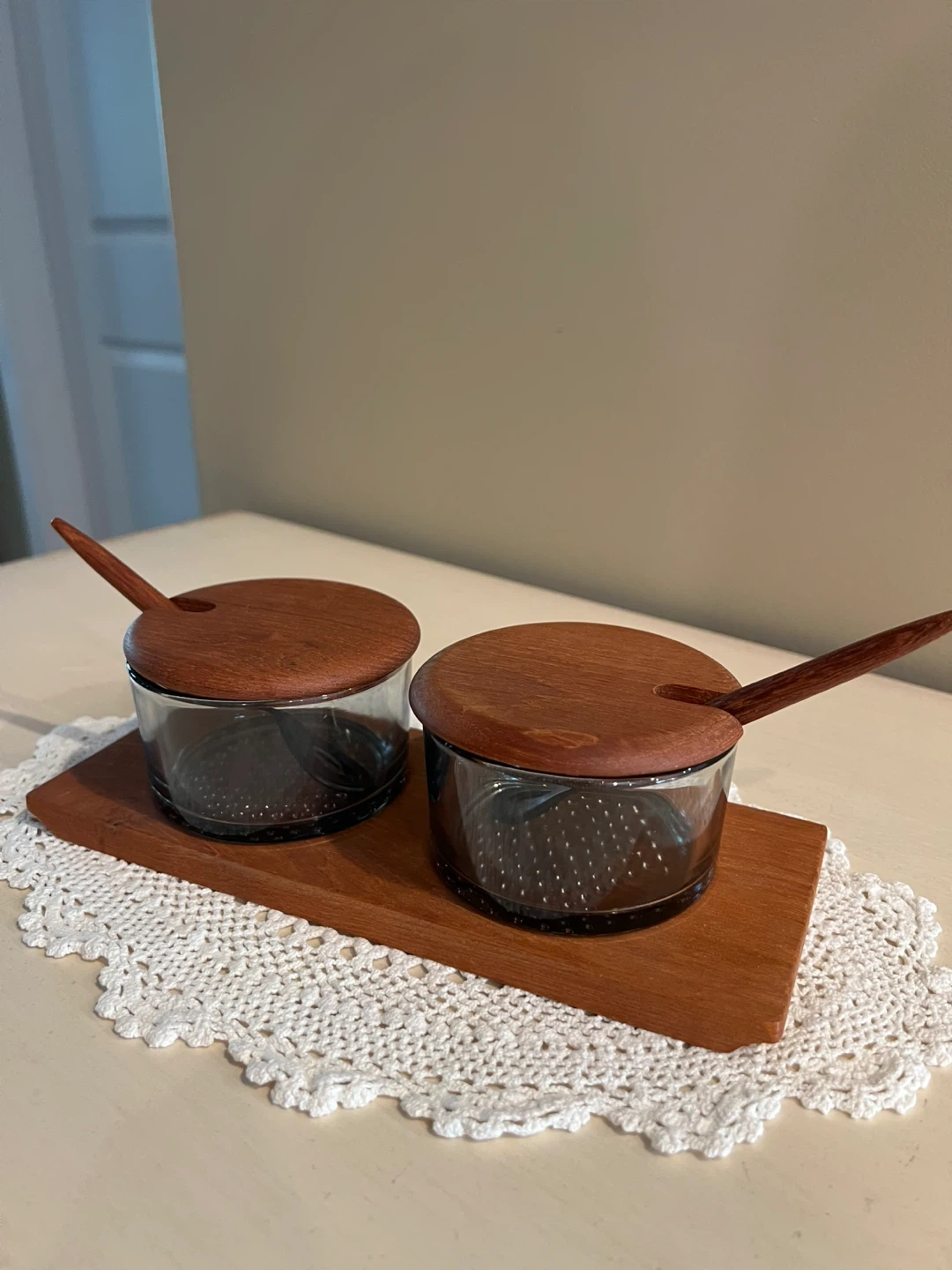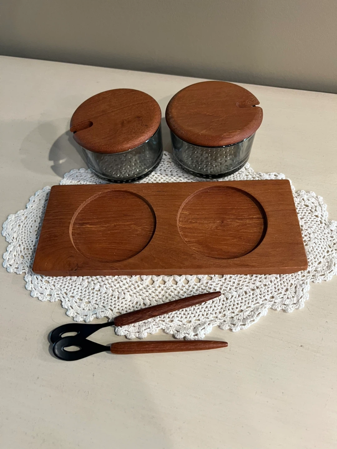 Gorgeous teak! Prestine condition! Smoke glass/ hobnail bottoms glass jars with teak lids, serving spoons with teak handles and a matching teak wood tray Crafted in Denmark by Lüthje Wood All pieces are original Measurements: Jars - 3.5” across and 2” tall Spoons - 5.75” long Tray - 9.5” long and 3.75” wide True Mid Century Modern charm for table setting or kitchen decor!! Asking $40 Message me and please check my other listings…
