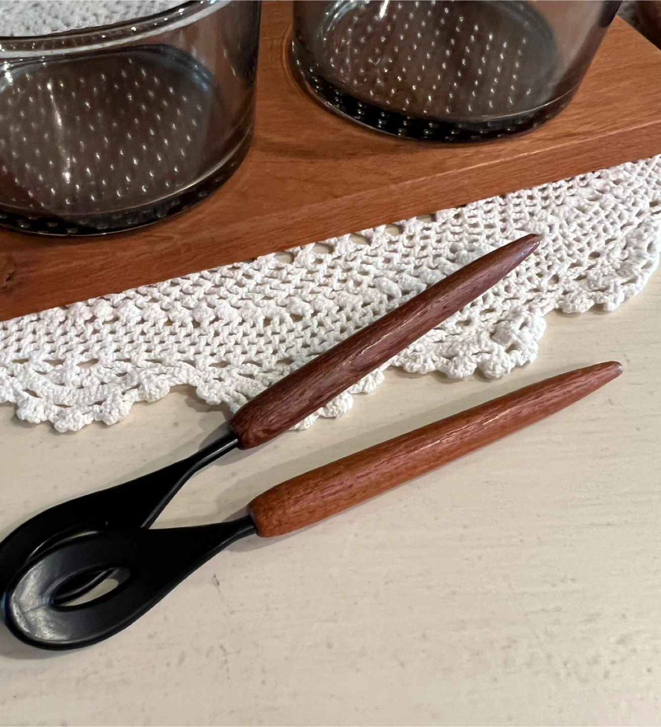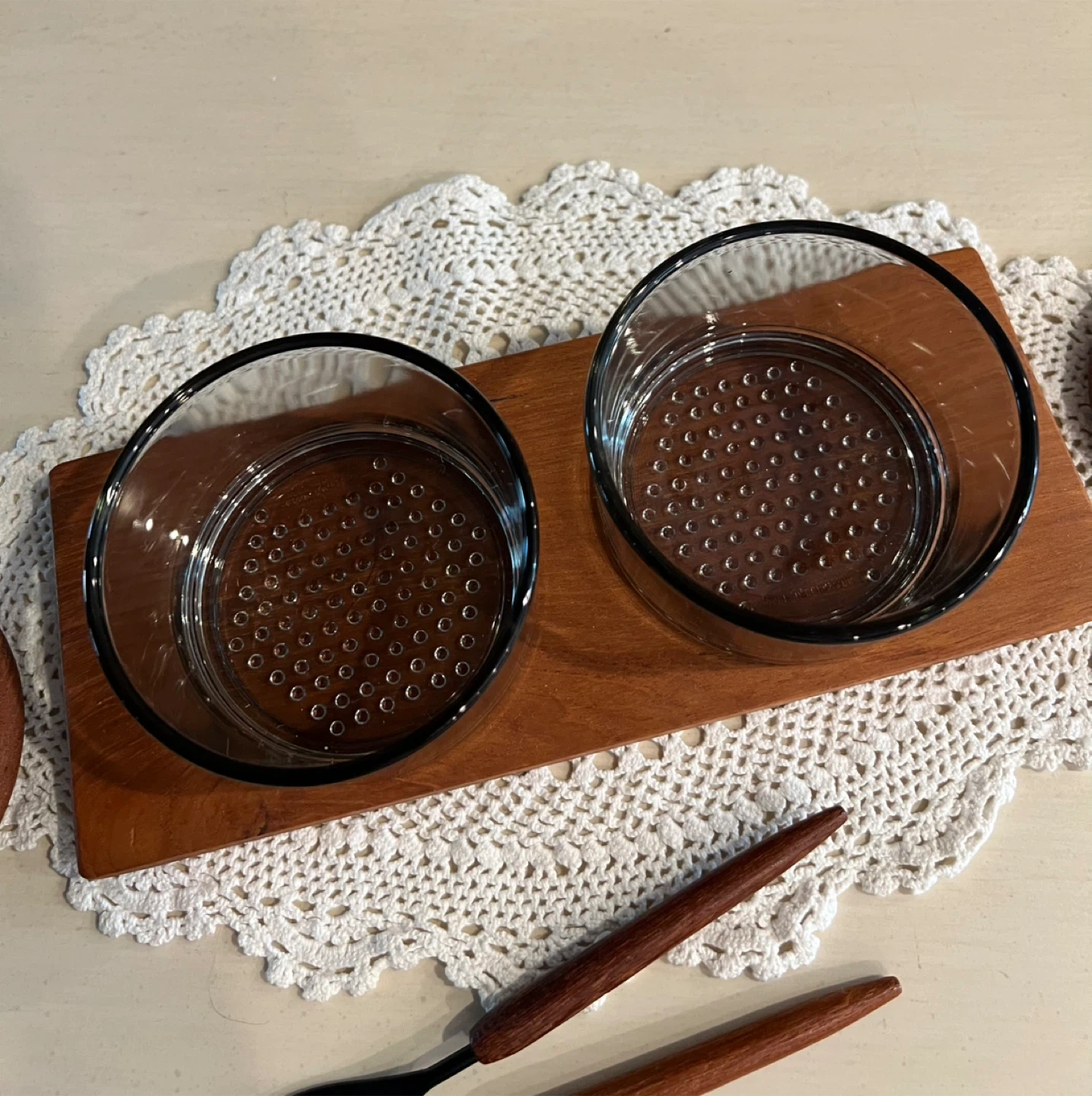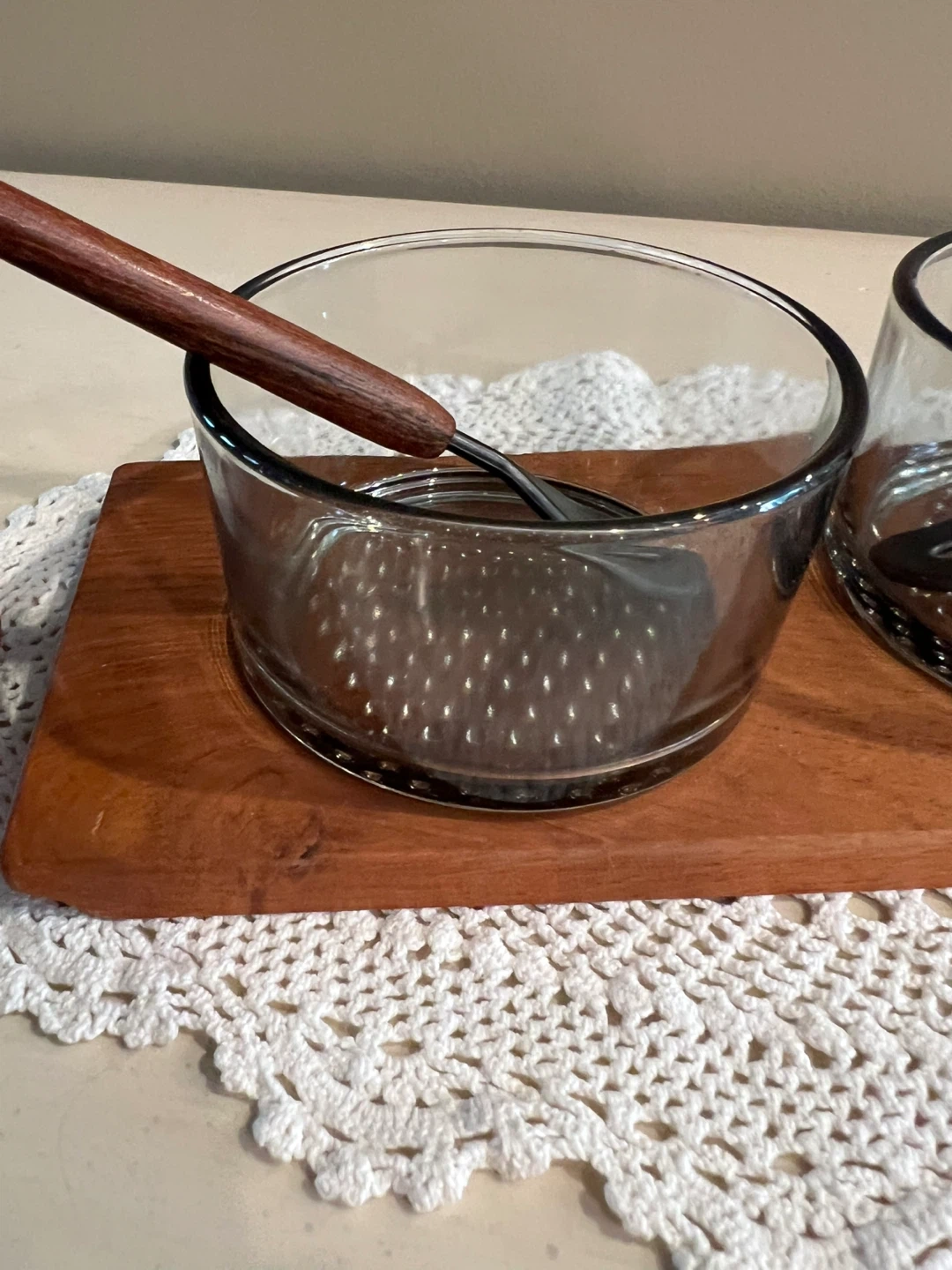 Gorgeous teak! Prestine condition! Smoke glass/ hobnail bottoms glass jars with teak lids, serving spoons with teak handles and a matching teak wood tray Crafted in Denmark by Lüthje Wood All pieces are original Measurements: Jars - 3.5” across and 2” tall Spoons - 5.75” long Tray - 9.5” long and 3.75” wide True Mid Century Modern charm for table setting or kitchen decor!! Asking $40 Message me and please check my other listings…