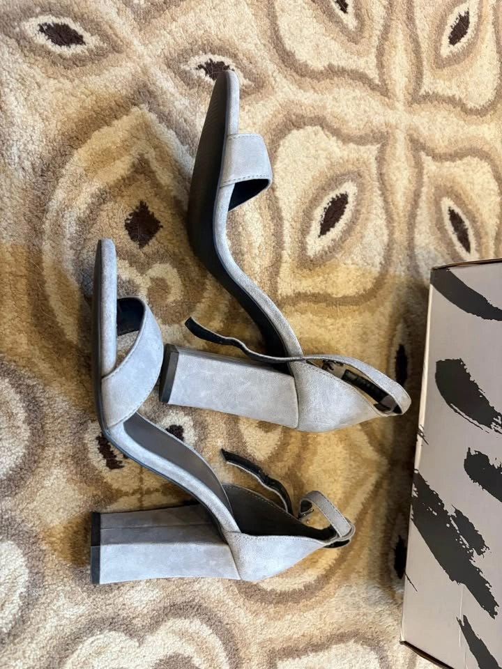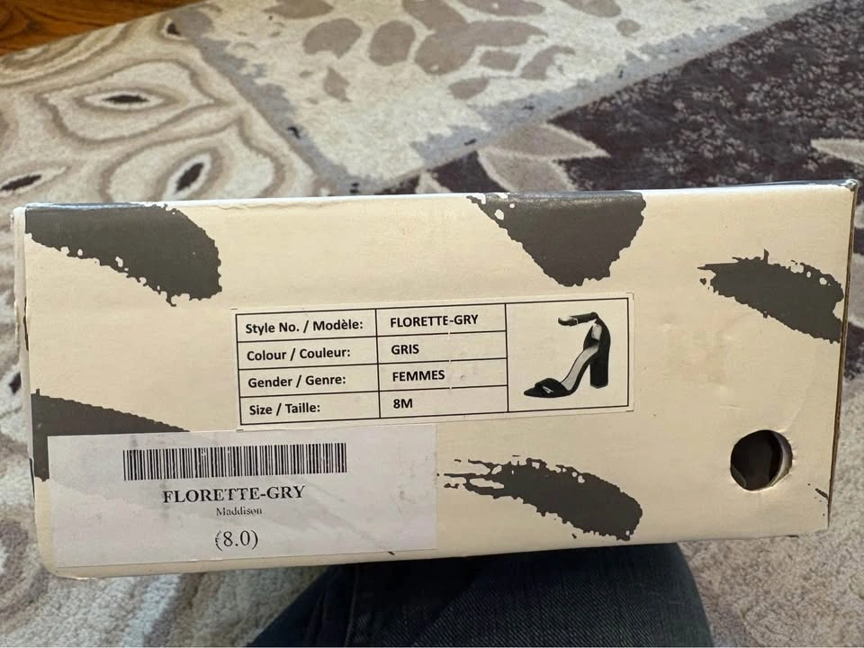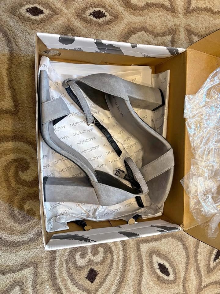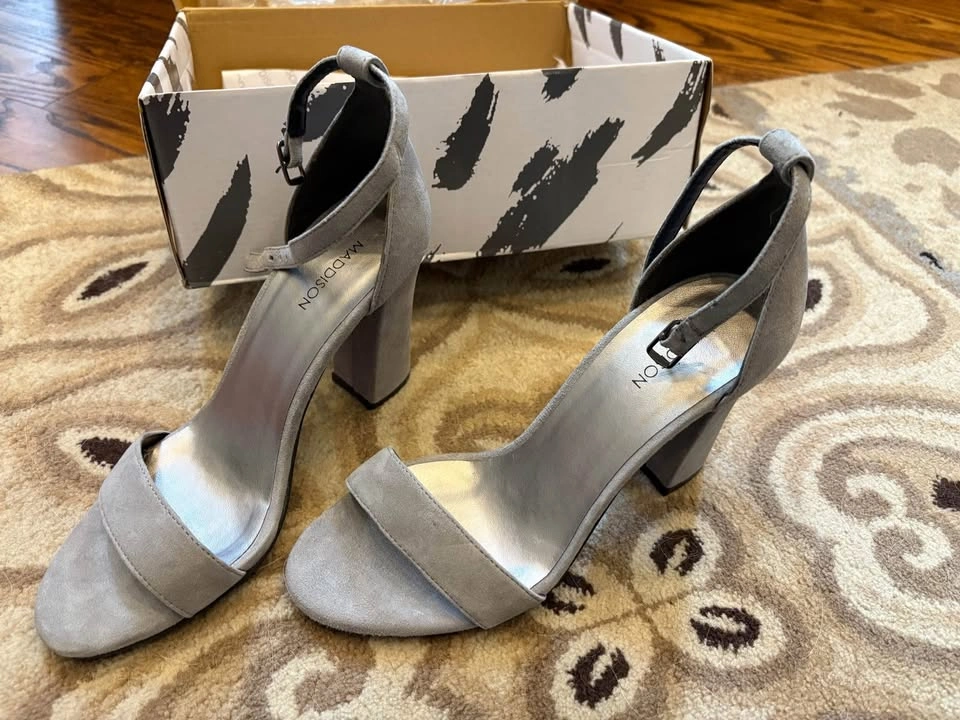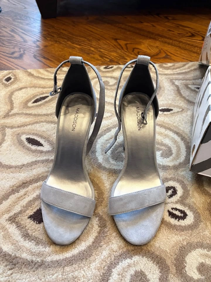 Brand new in box, never worn. Brand: Maddison Style: “Florette-GRY” — sleek open-toe heels with ankle strap Color: Soft grey (Gris) – a perfect neutral Size: 8M (US Women’s Medium) Features: ✔️ Elegant suede-look finish ✔️ Adjustable ankle strap ✔️ Sturdy block heel for comfort ✔️ Great for dressing up or pairing with jeans