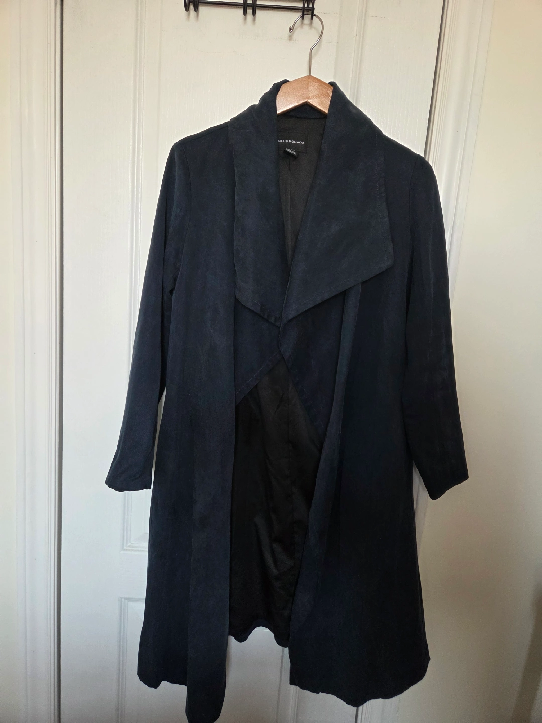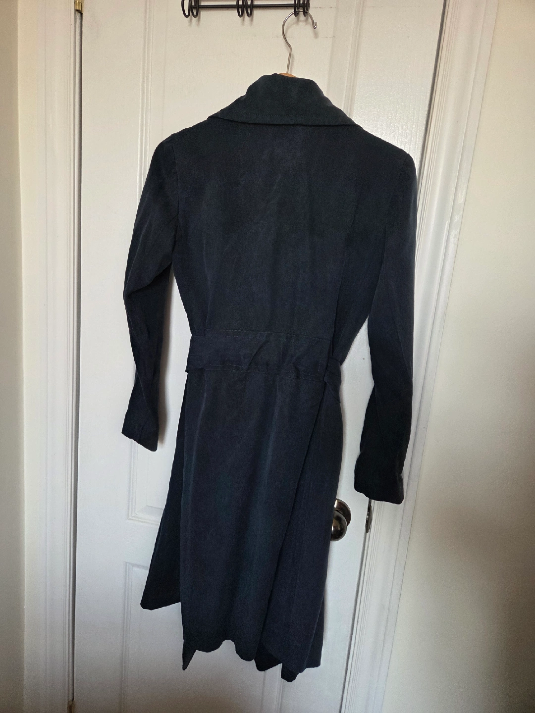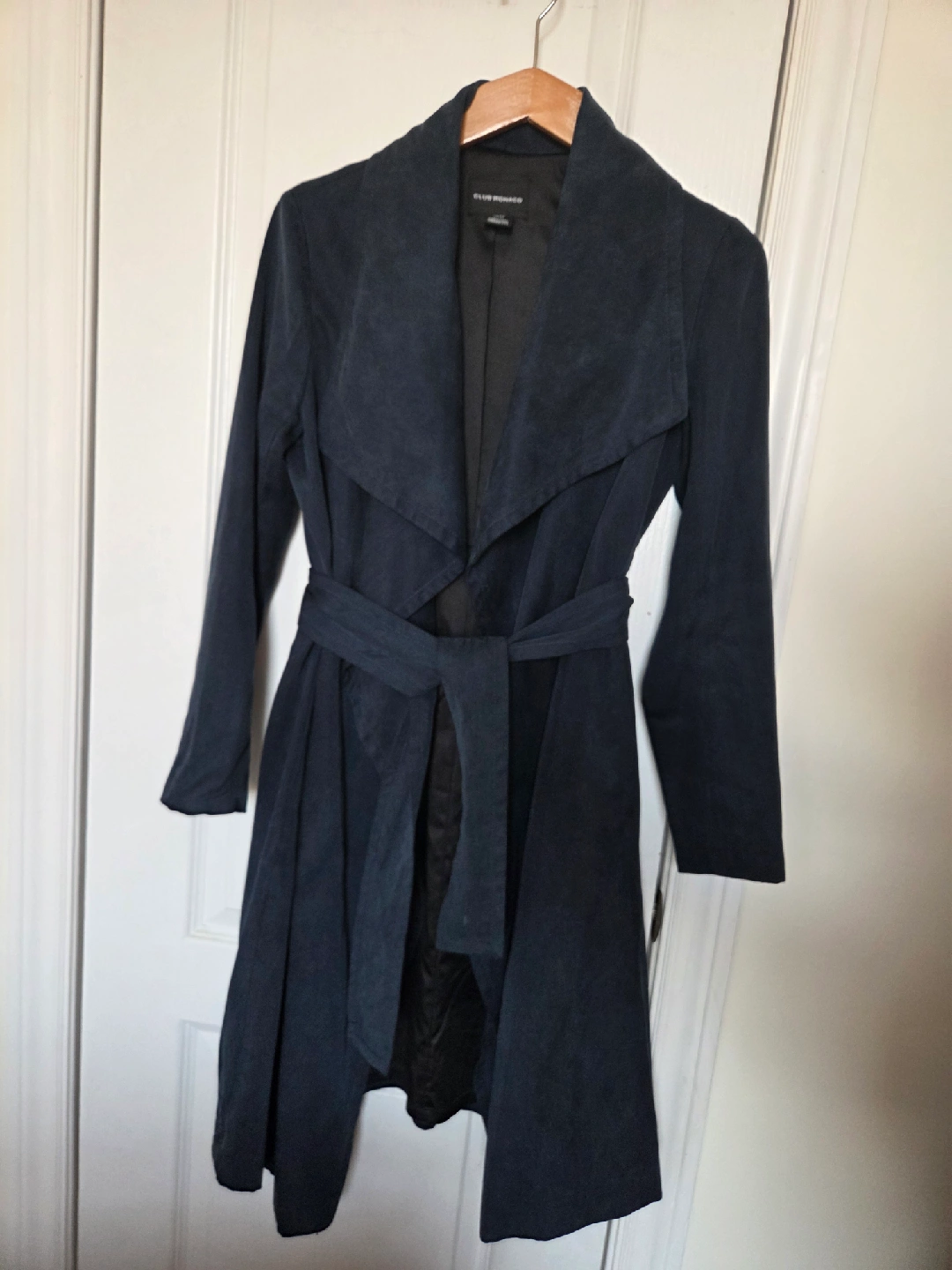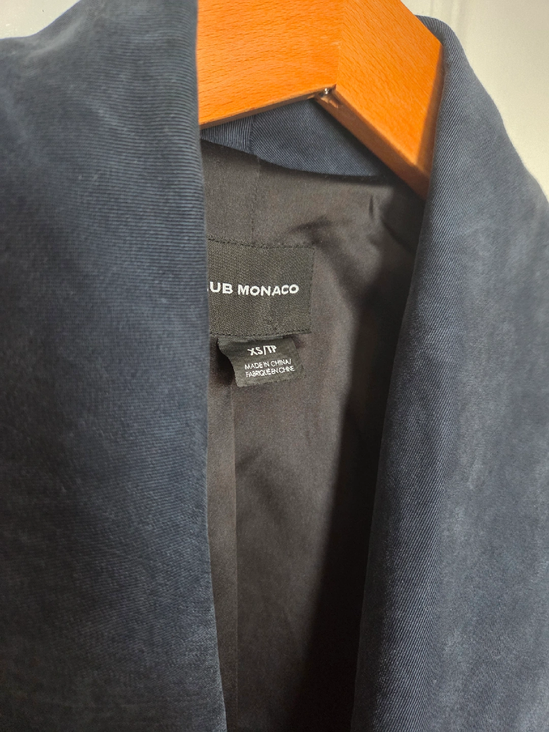 Club Monaco Gideon trench coat in navy color and size XS, it has slight sheen. I love this coat, but I'm selling because it does not fit me anymore. It features a belt to wrap around the waist, very flattering and stylish. Perfect for layering in the fall. Sells on eBay and Poshmark for over USD$70. Happy to offer discounts for bundled items!