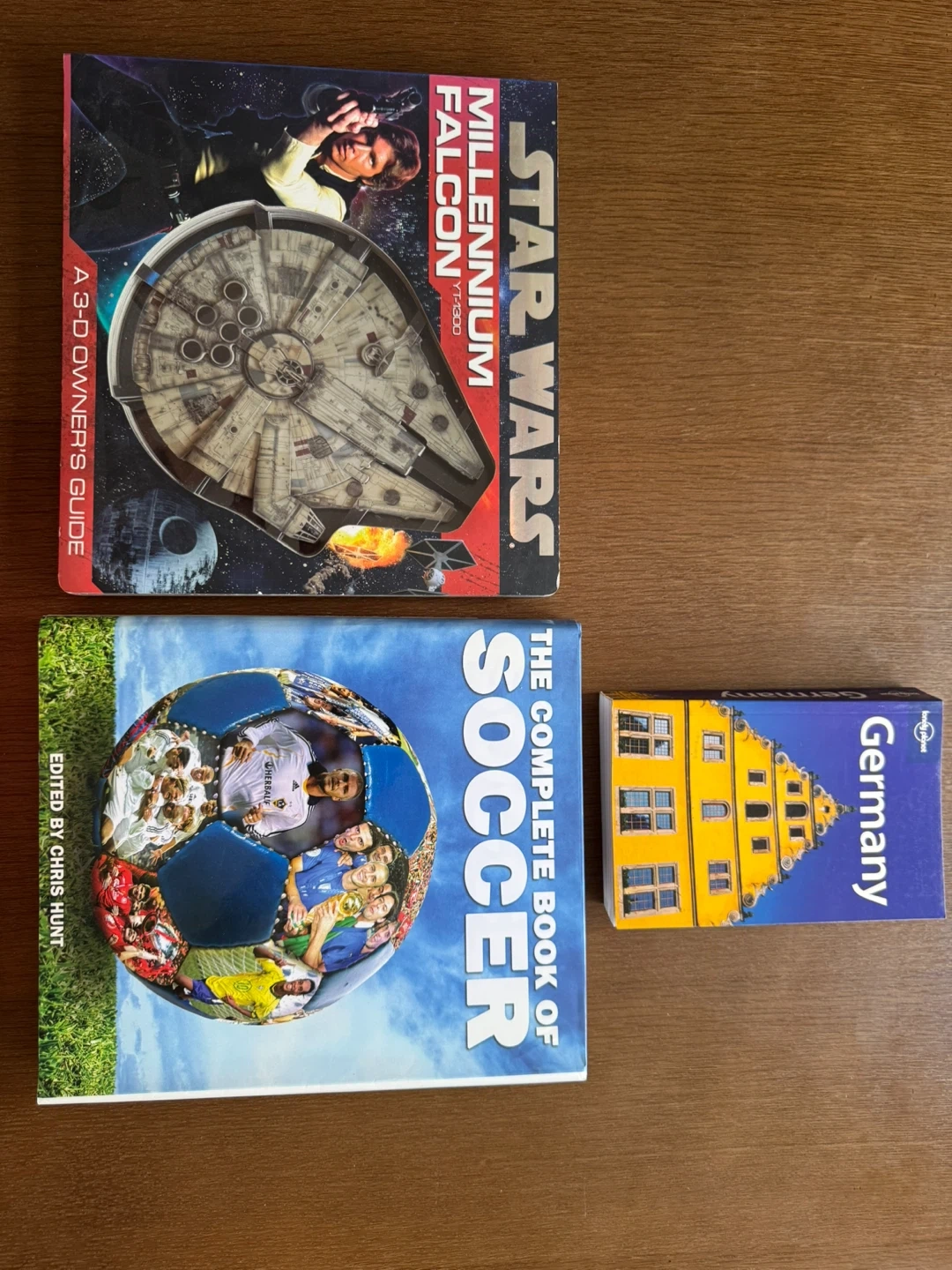Selling a Star Wars Millennium Falcon A 3-D Owner's Guide book and The Complete Book of Soccer edited by Chris Hunt and Germany guide book. $15 each book