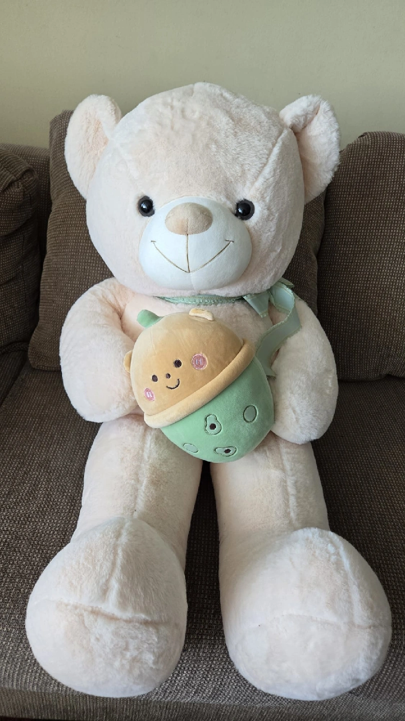 Selling this giant teddy bear! It's in great condition and super cuddly. It comes with an adorable acorn plushie. The teddy bear measures approximately 32 inches long.