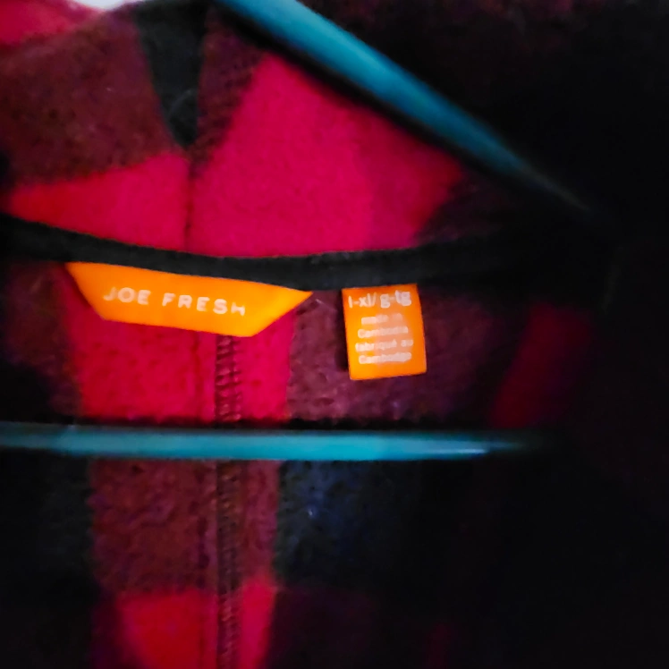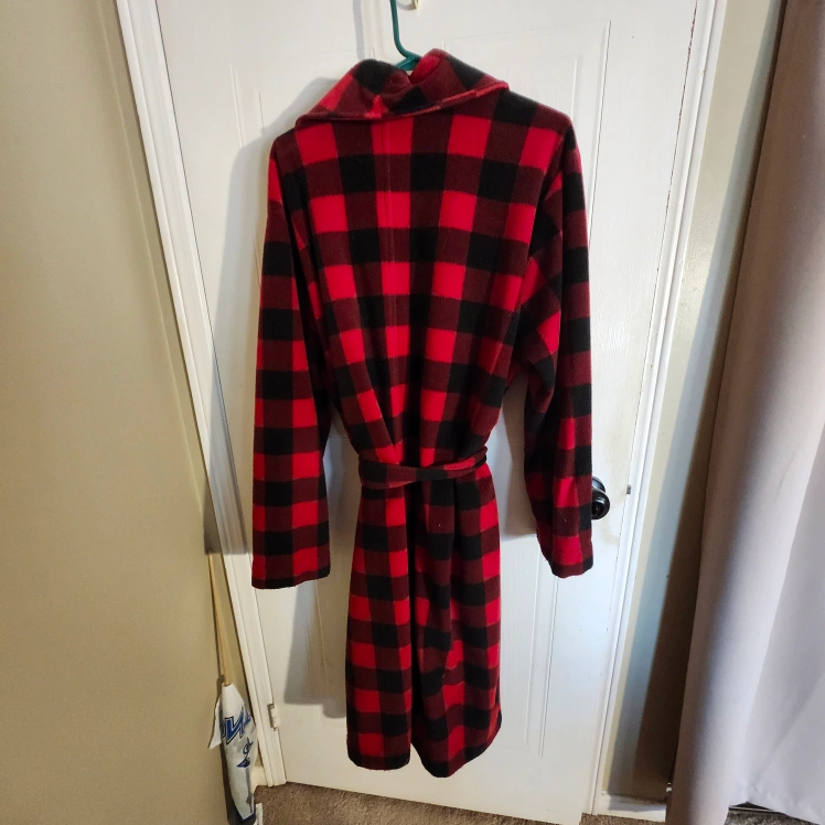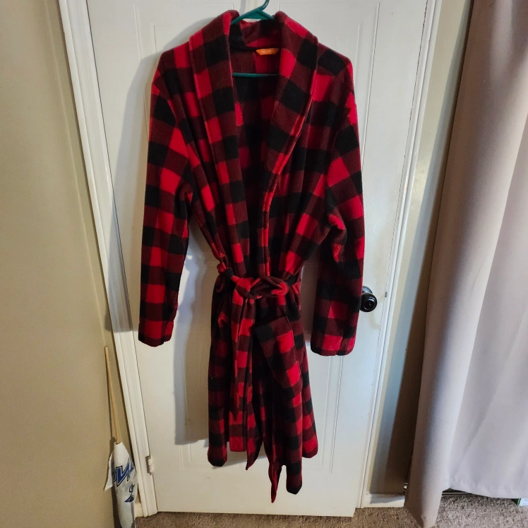 Cozy up in this Joe Fresh robe! It features a classic red and black plaid pattern. This robe is a size L/XL and is perfect for lounging around the house on chilly days. Barley worn and I no longer need.