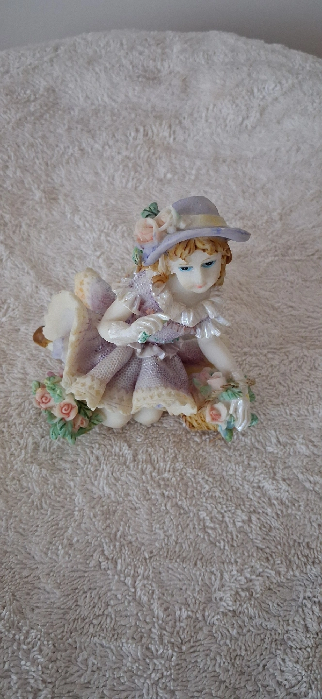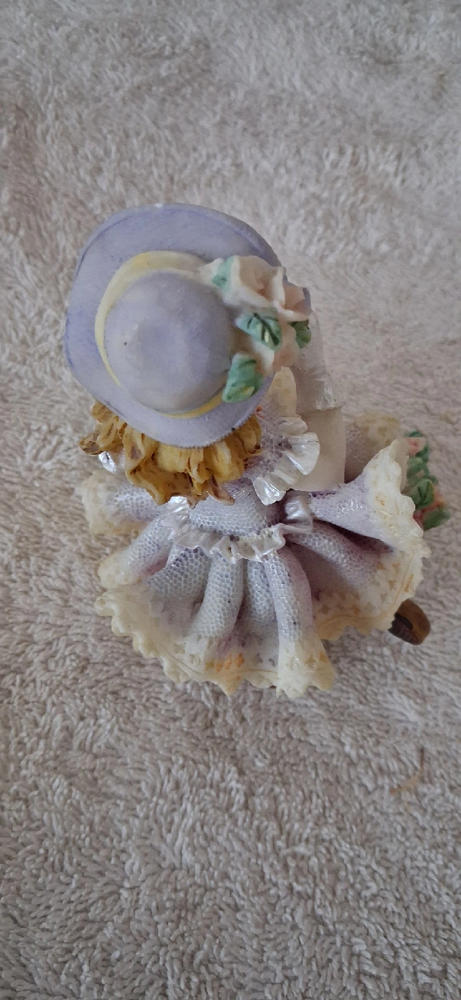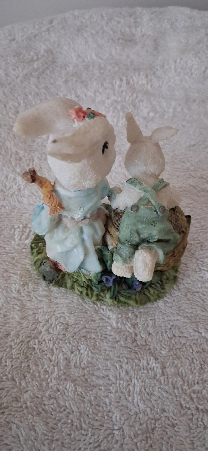 A cute Easter bunny figurine in excellent condition. It features two bunnies, one with a floral headband and the other with overalls, sitting on a basket. Perfect for adding a touch of spring to your home!
