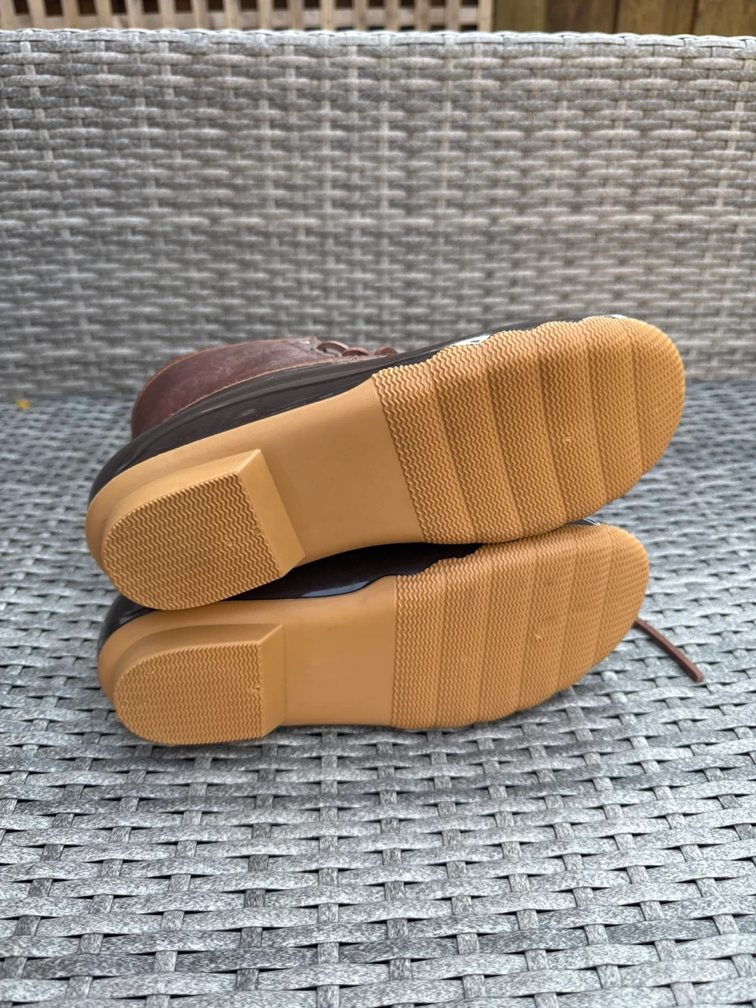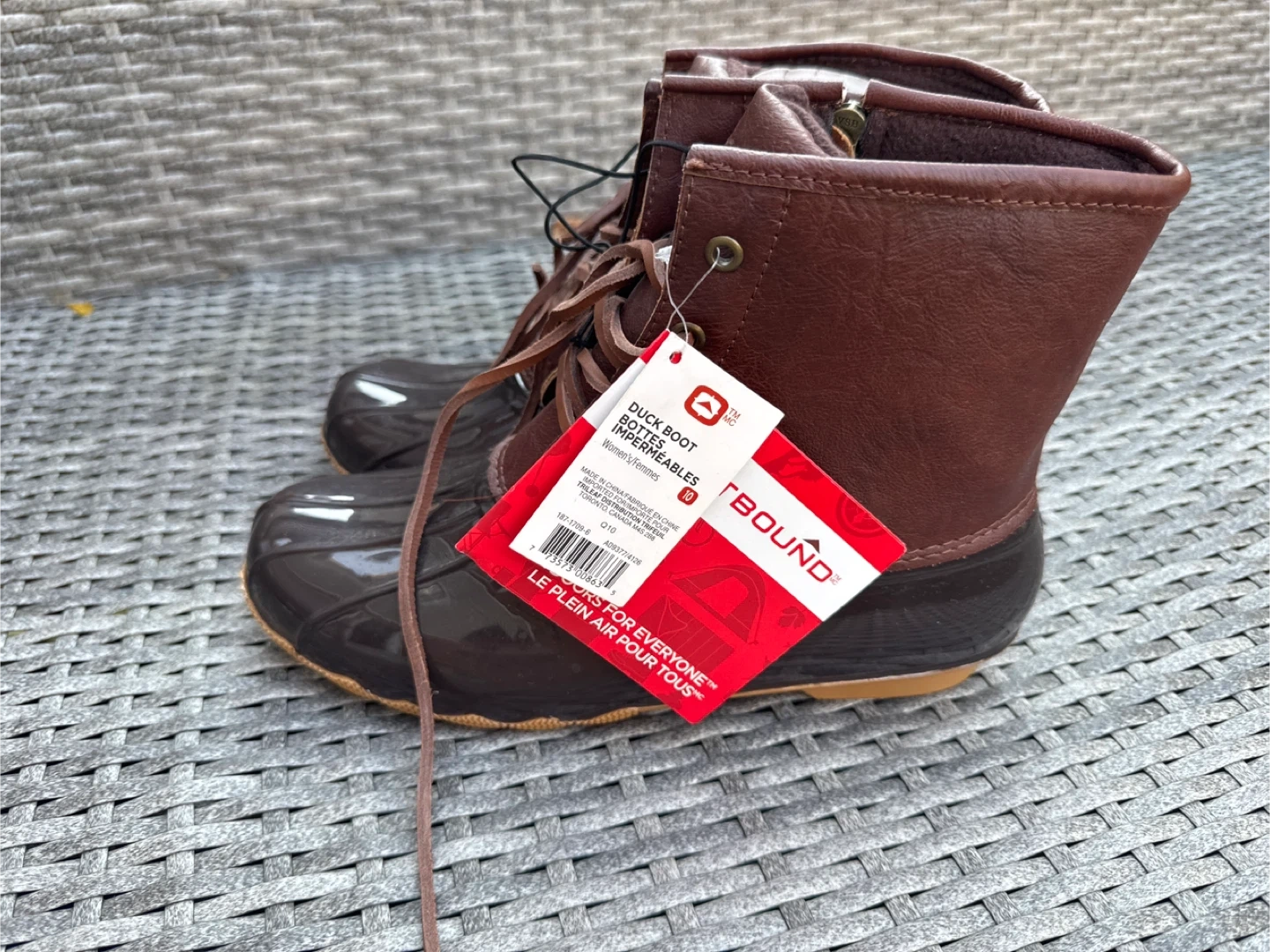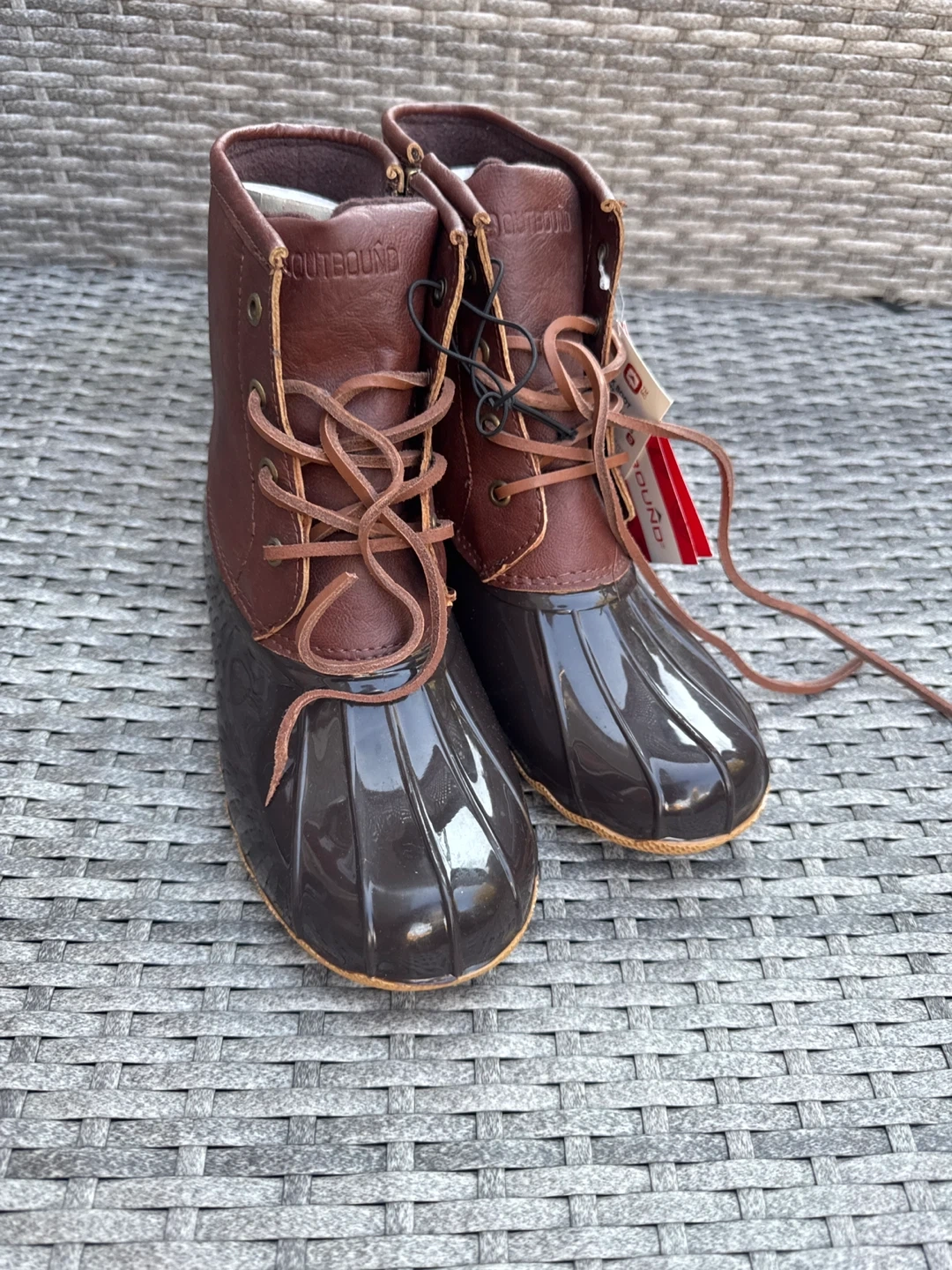 These Outbound duck boots are brand new with tags! They're a size 10 and ready for all your outdoor adventures. The upper is manmade synthetic fibre. NWT