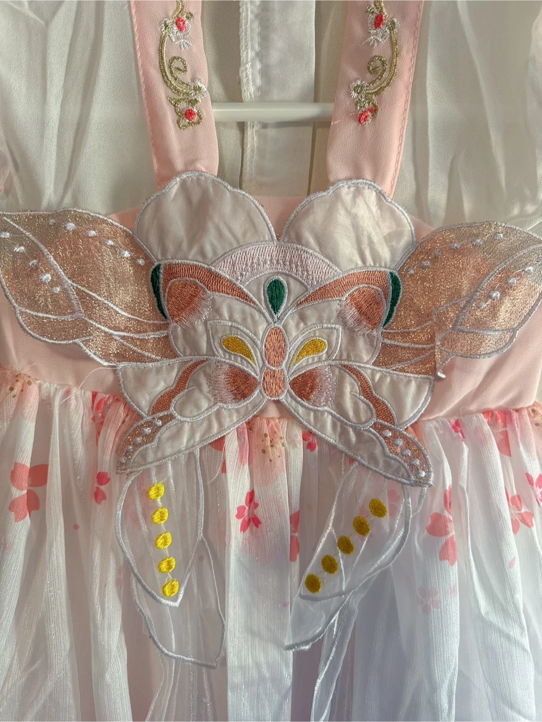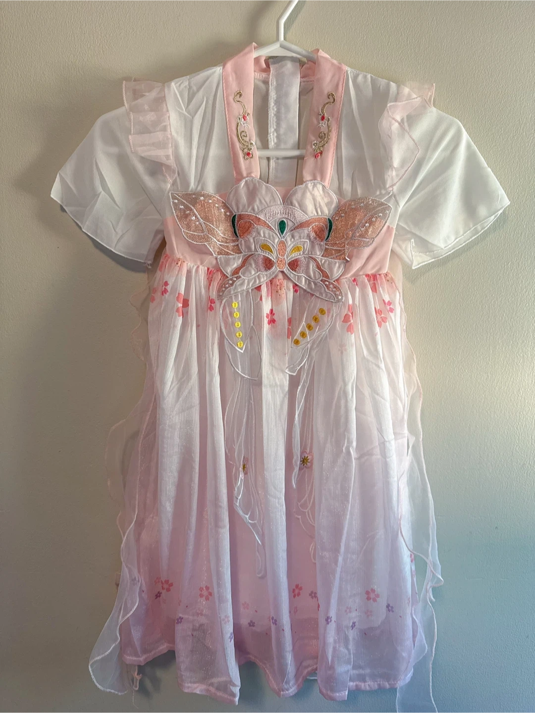 It's in great condition and perfect for a special occasion or just for fun! The dress features delicate floral patterns and a lovely butterfly design on the bodice.