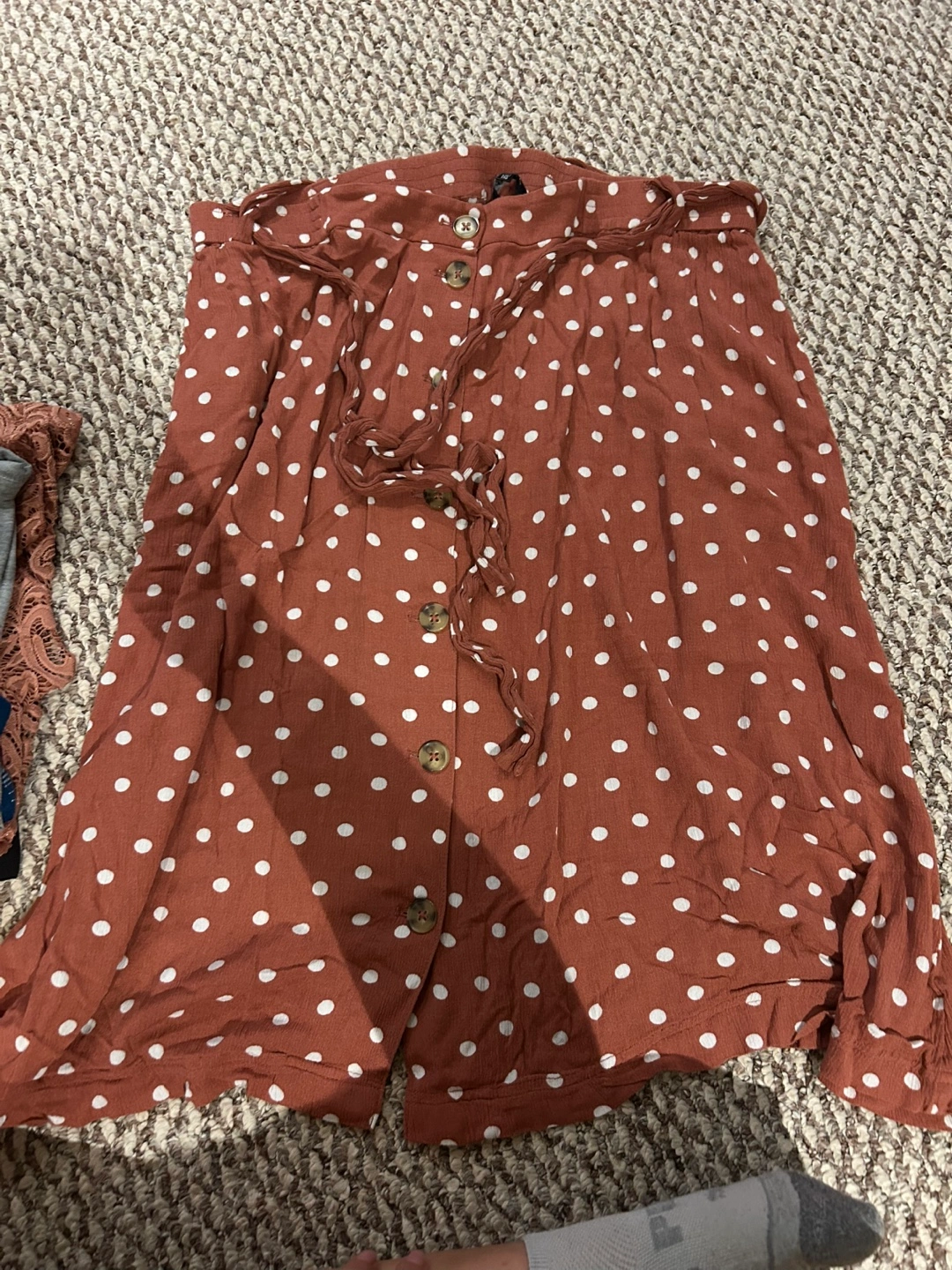 Selling a cute rust red skirt from George in size XXL! It features a charming polka dot pattern and a comfortable fit. Perfect for a casual day out or dressing up for a special occasion