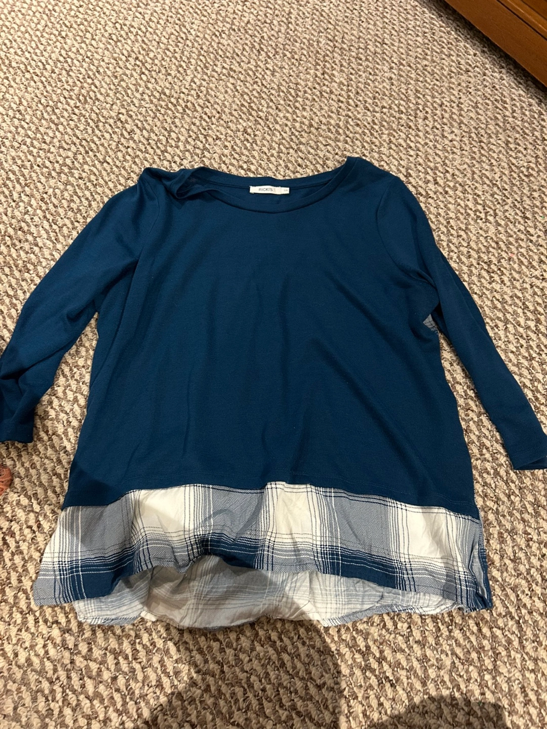 Selling a Ricki's tunic in size L/G. It's a beautiful blue colour with a stylish plaid pattern at the bottom. Perfect for adding a touch of casual flair to your wardrobe!