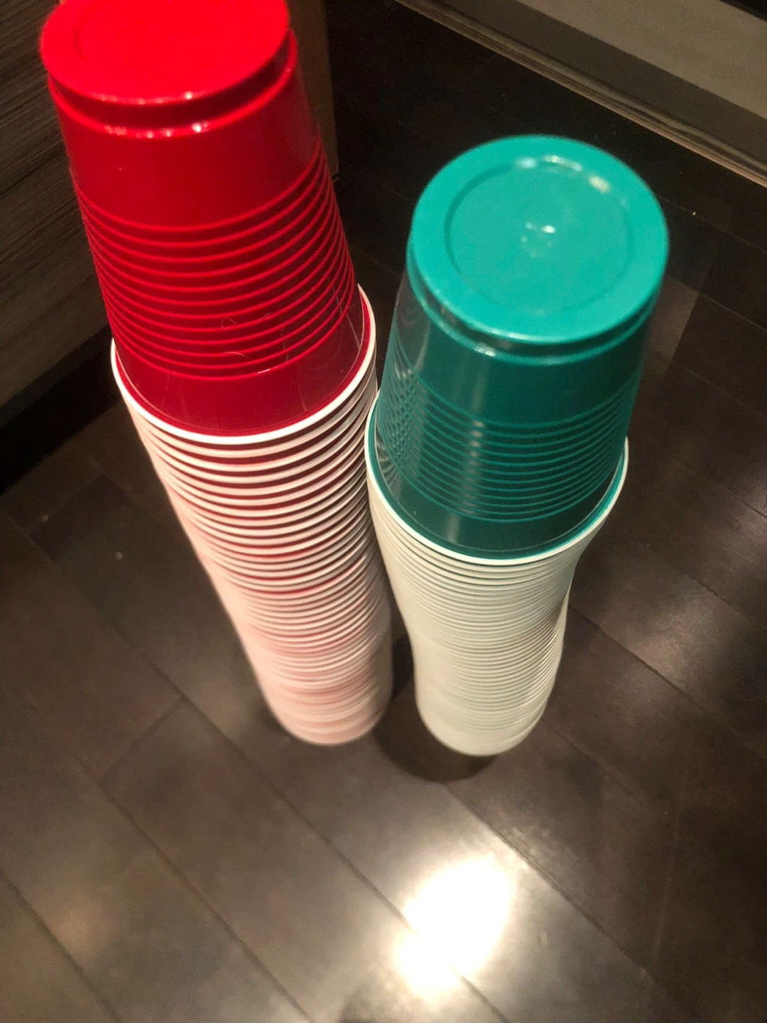 Selling a stack of red and green plastic cups! Perfect for parties, picnics, or any gathering where you need disposable drinkware. They're in great condition and ready for a new home