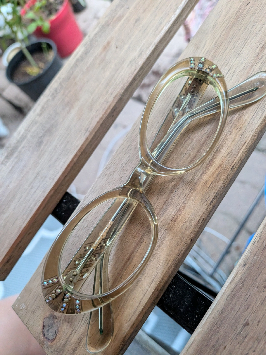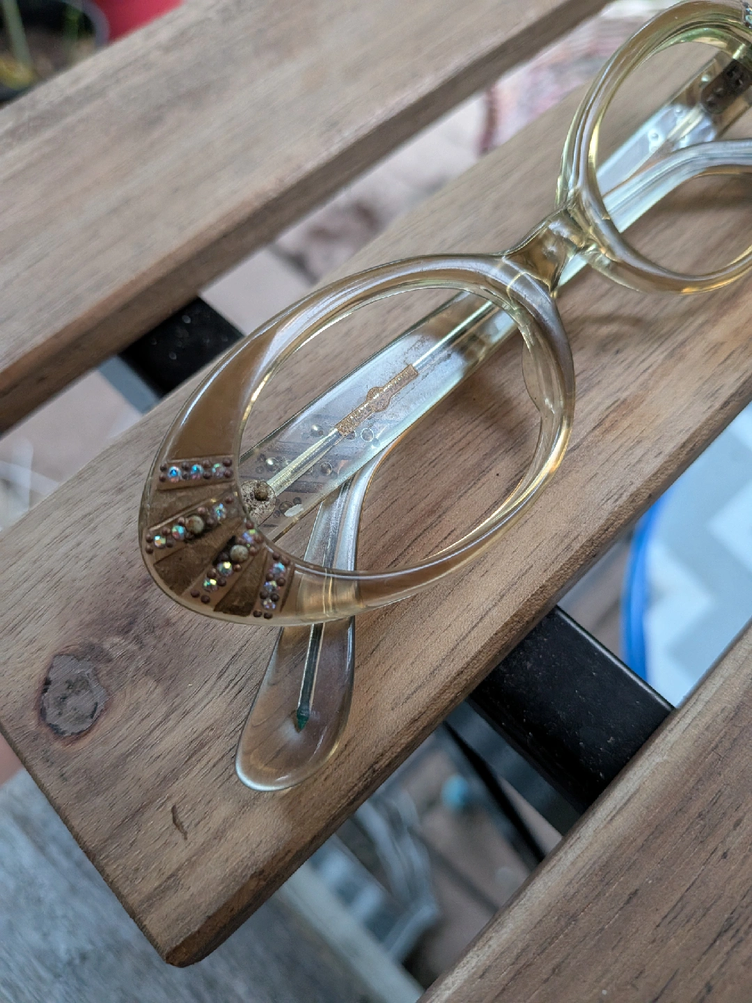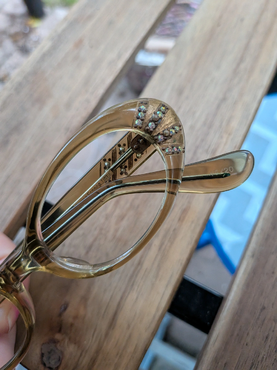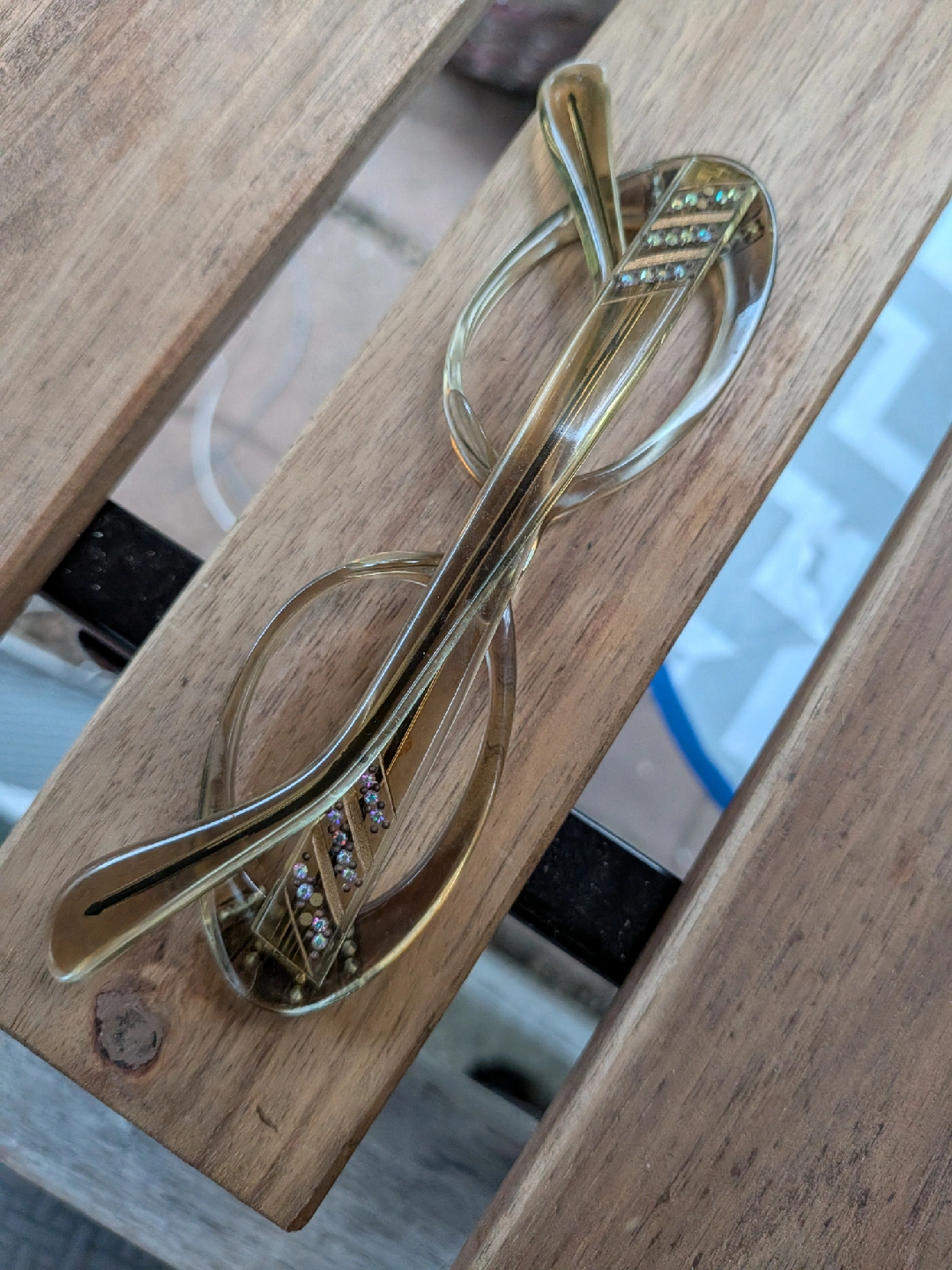 Selling a pair of vintage glasses frames with rhinestone embellishments. They have a unique, retro look and are in good condition despite their age Made in France Vintage eyeglasses from the 50's - 60's era Made in France These are quite unique, they are clear gold toned plastic with gorgeous tiny rhinestones on the sides of lense frames and arms. Good condition and not worn. By Hinges have a hint of oxidization, not too bad despite their age ** Small fit, narrow, oval shape ** Purchased from an optometrists' shop that went out of business decades ago. New old stock and WITHOUT lenses. Label: Frame France ** No lenses ** Cash only, no etransfers Meet up in Etobicoke. Rathburn & Renforth dr