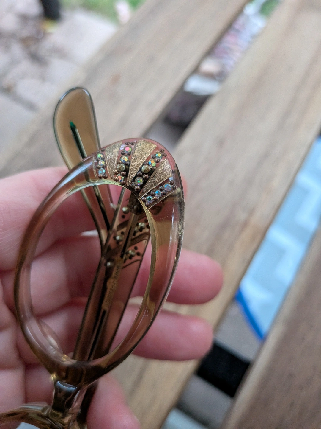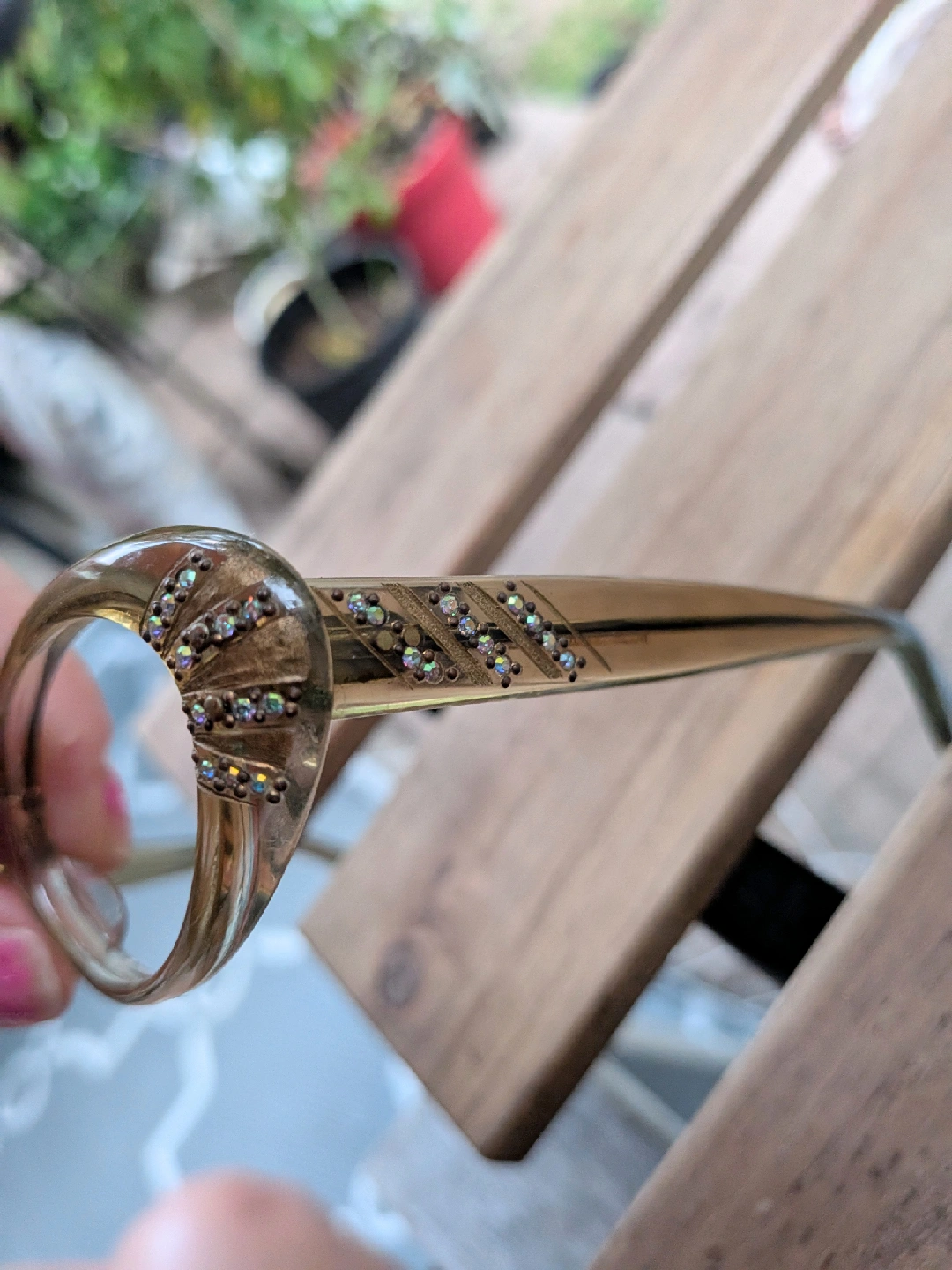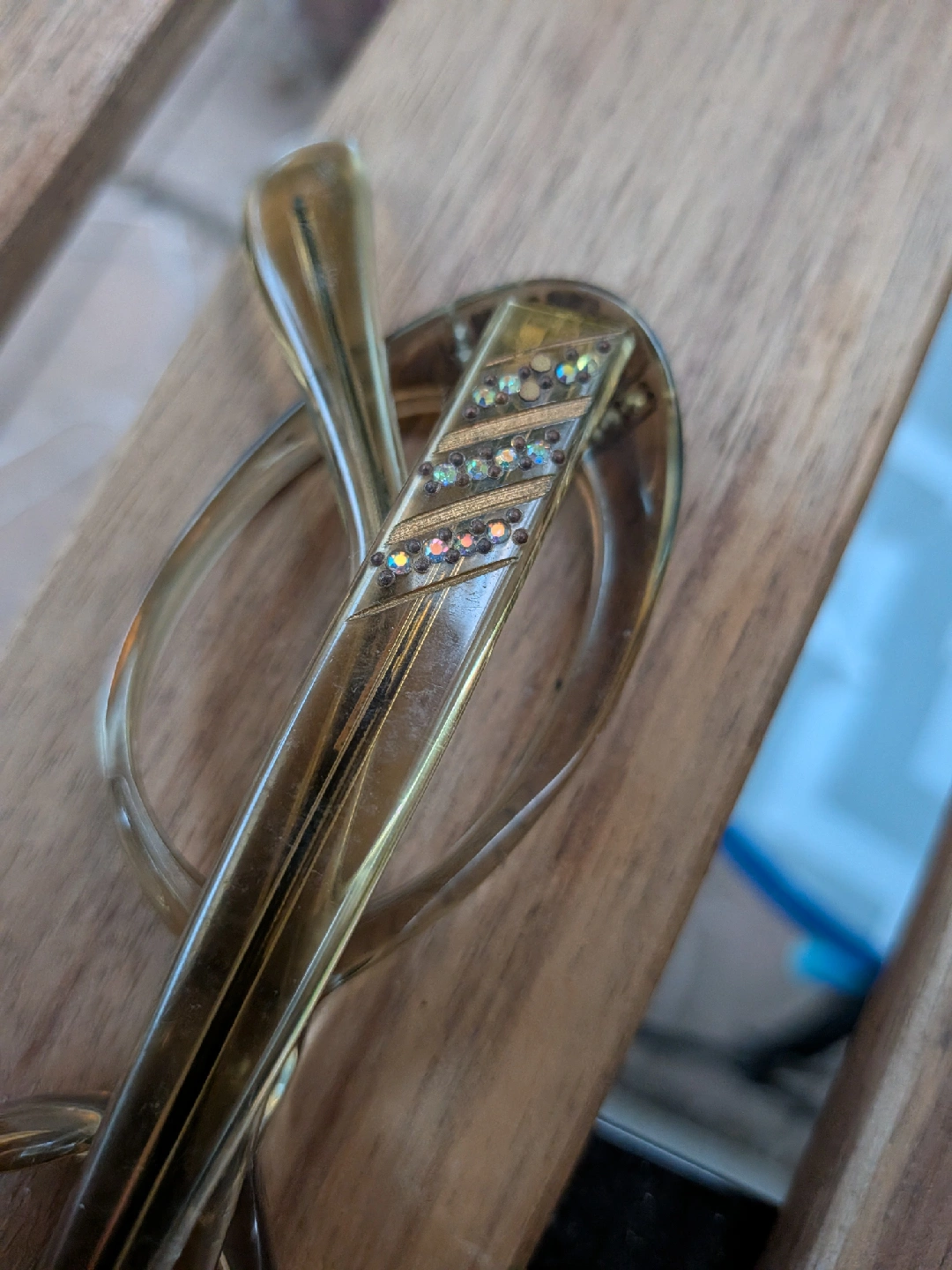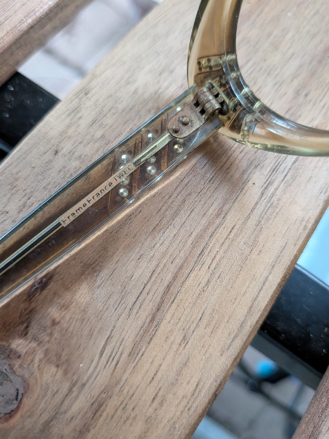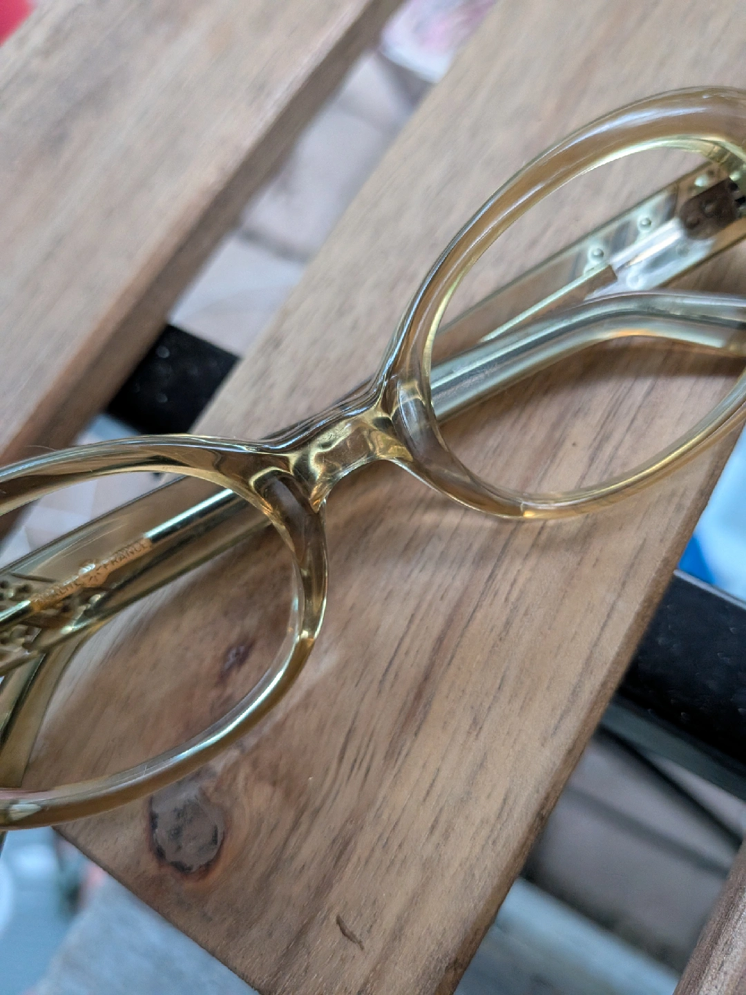 Selling a pair of vintage glasses frames with rhinestone embellishments. They have a unique, retro look and are in good condition despite their age Made in France Vintage eyeglasses from the 50's - 60's era Made in France These are quite unique, they are clear gold toned plastic with gorgeous tiny rhinestones on the sides of lense frames and arms. Good condition and not worn. By Hinges have a hint of oxidization, not too bad despite their age ** Small fit, narrow, oval shape ** Purchased from an optometrists' shop that went out of business decades ago. New old stock and WITHOUT lenses. Label: Frame France ** No lenses ** Cash only, no etransfers Meet up in Etobicoke. Rathburn & Renforth dr