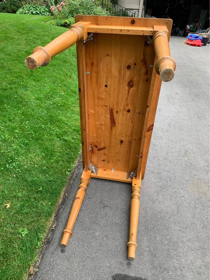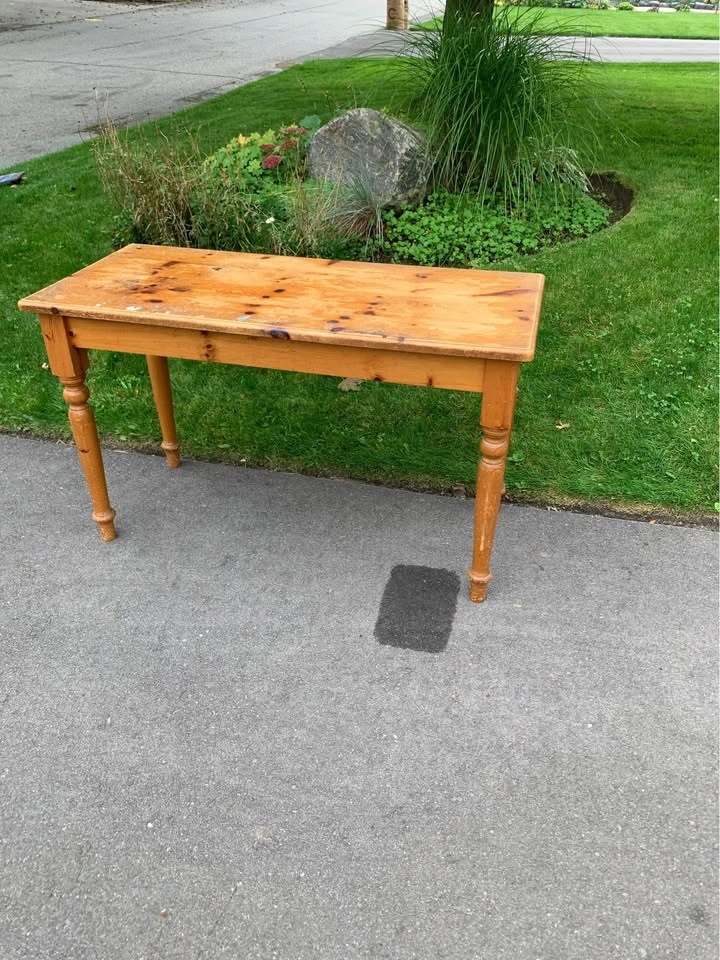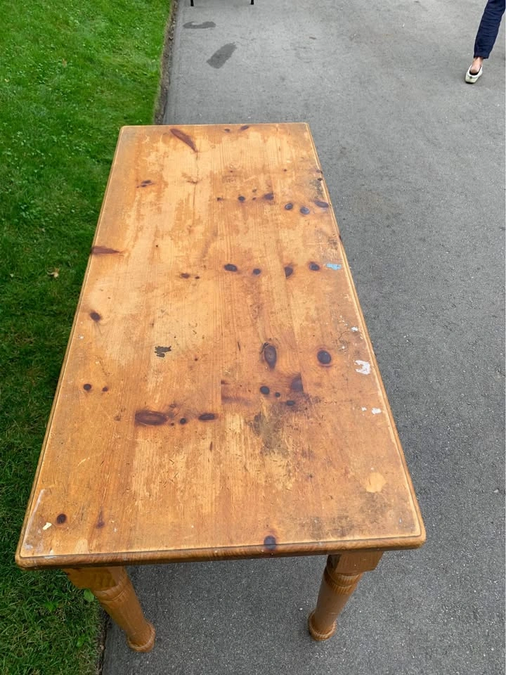 This is a sturdy, used pine table perfect for a variety of uses. It has some wear and tear, which gives it a rustic, vintage charm. Keep it as it is or refinish the top. This a a solid well made table. Here are some details: * Material: Solid Pine * Style: Farmhouse/Rustic * Finish: Natural * Condition: Shows signs of use, adding to its character Why not add a bit of rustic charm to your place? If the ad is up, the table is available!