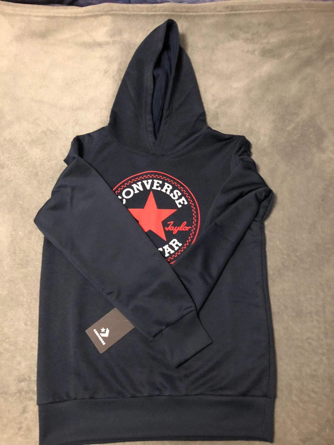 This is a brand new Converse pullover hoodie! It's an obsidian heather colour and a size large. The tag shows a suggested retail price of $45.00