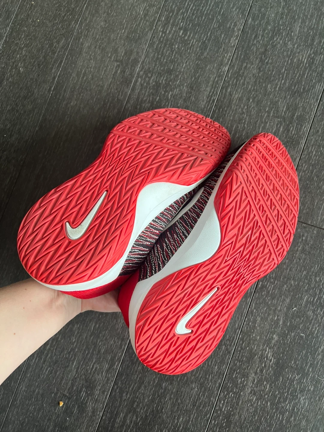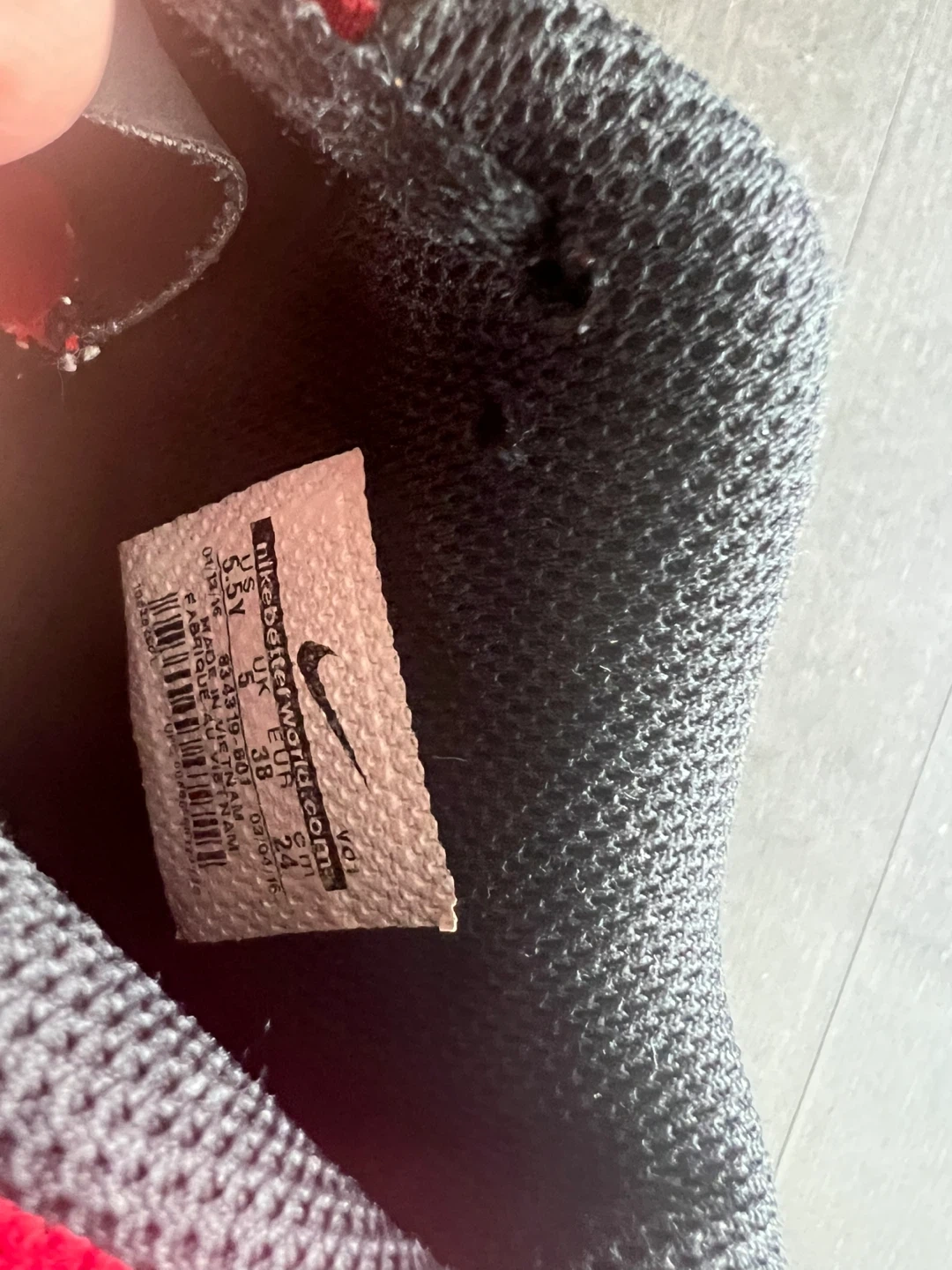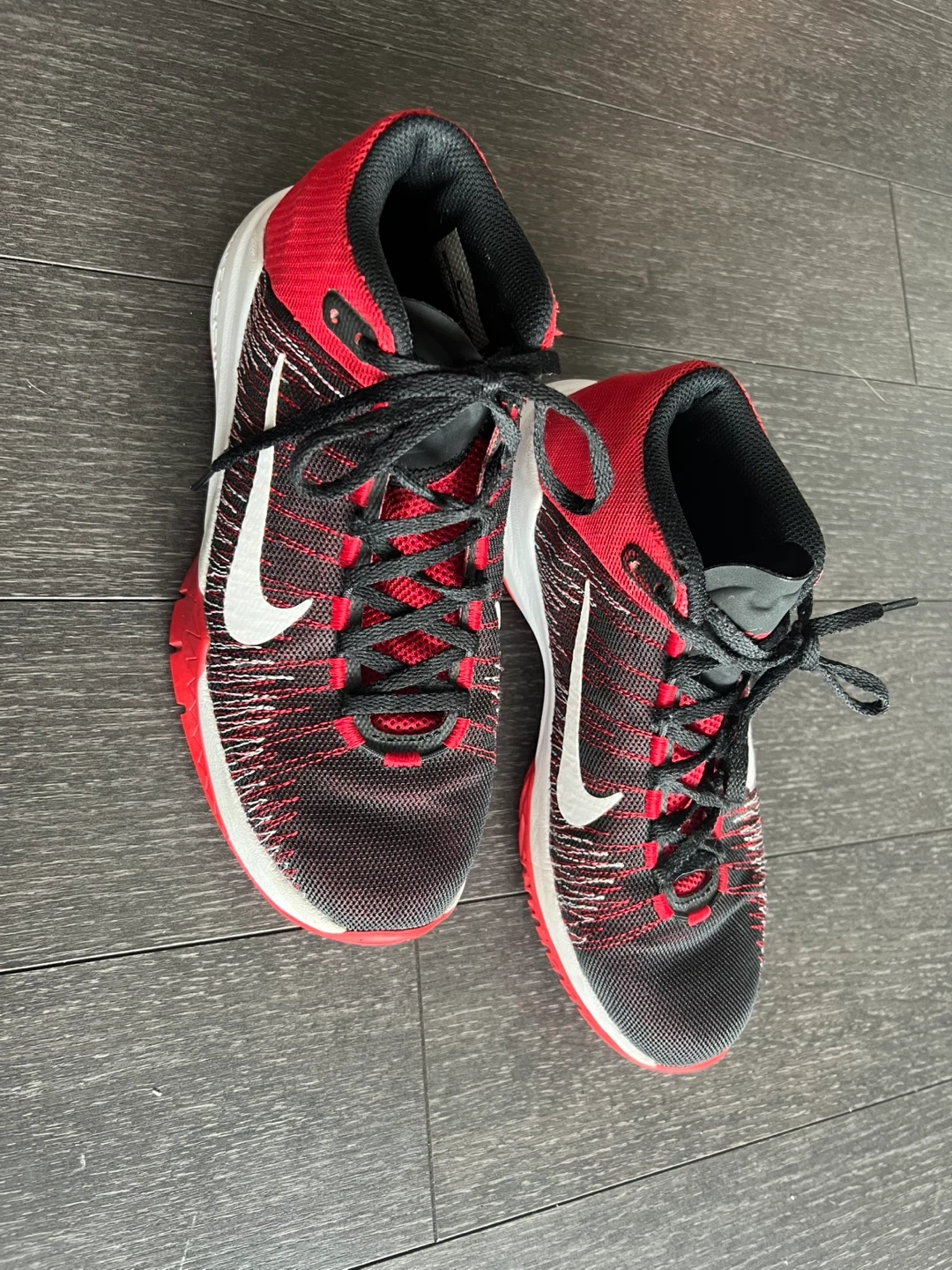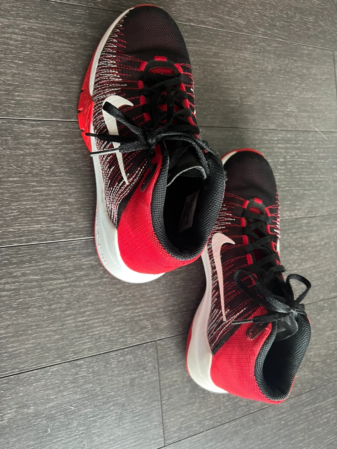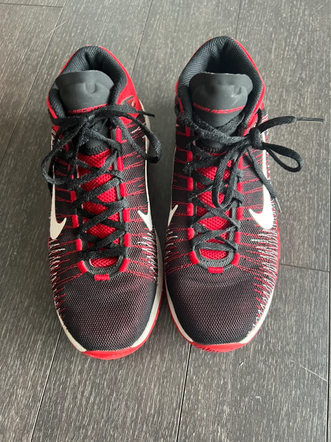 Selling a pair of Nike Zoom Rev 2017 shoes in youth size 5.5. The shoes are red, black, and white. They are in good condition with some signs of wear. Perfect for basketball or everyday wear!