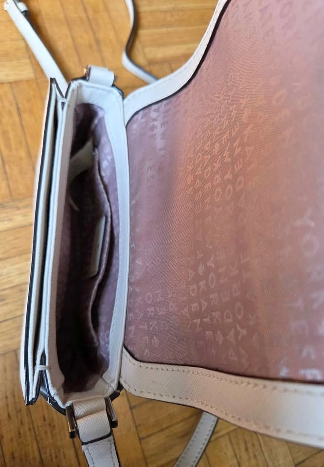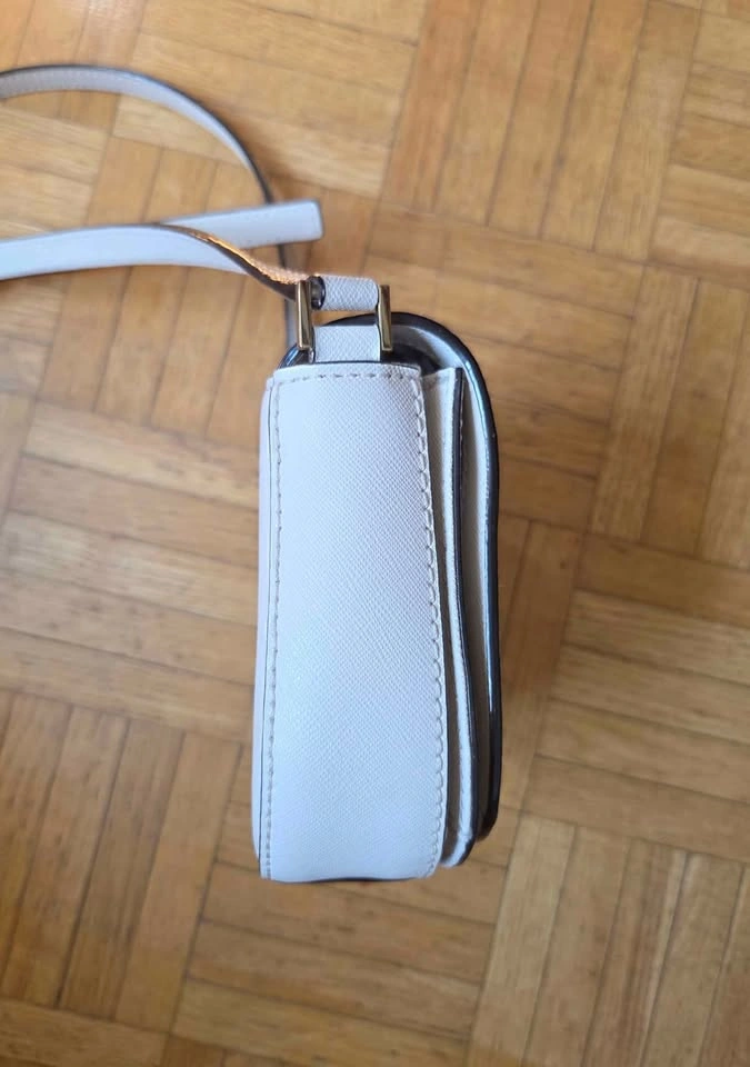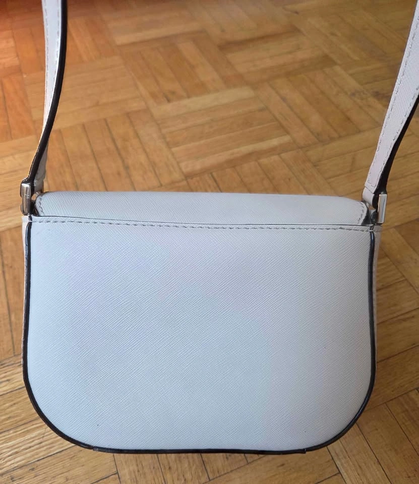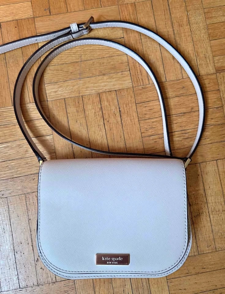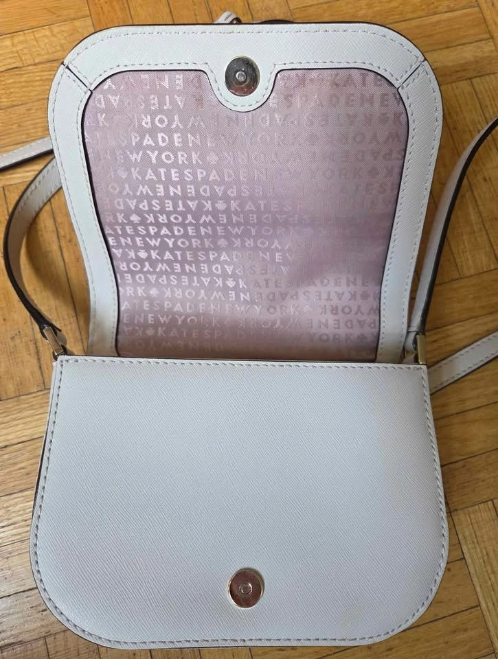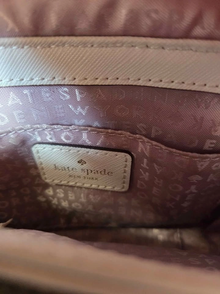 Elegant shoulder and crossbody leather handbag by Kate Spade (6.5 x 4.5 inches). Perfect for any occasion. Saffiano finished leather. Gold tone logo detail. Interior lined in pink Kate logo fabric. Single adjustable leather strap has a drop ranging from 20 to 22.5 inches.