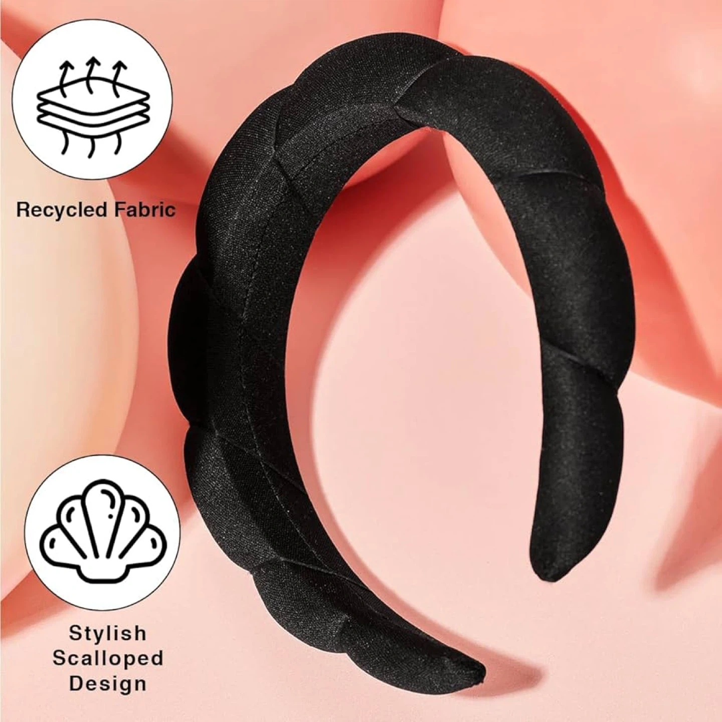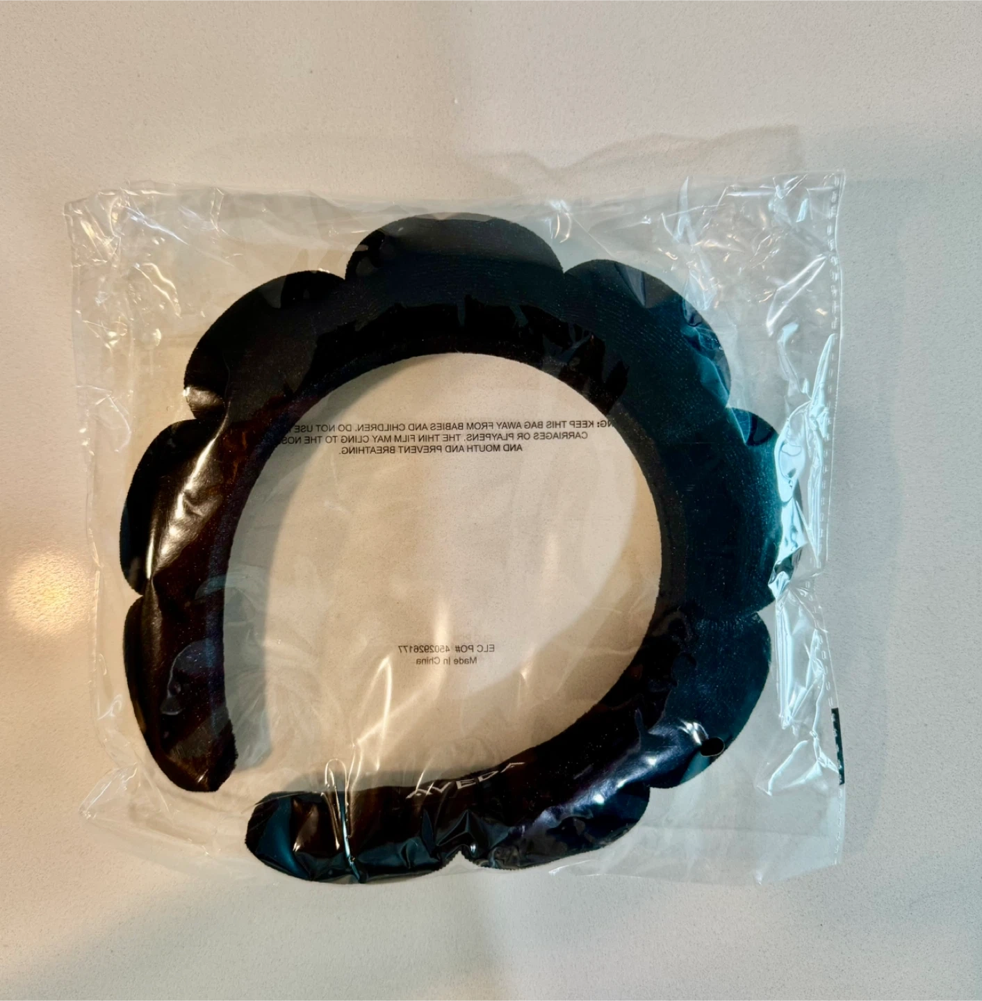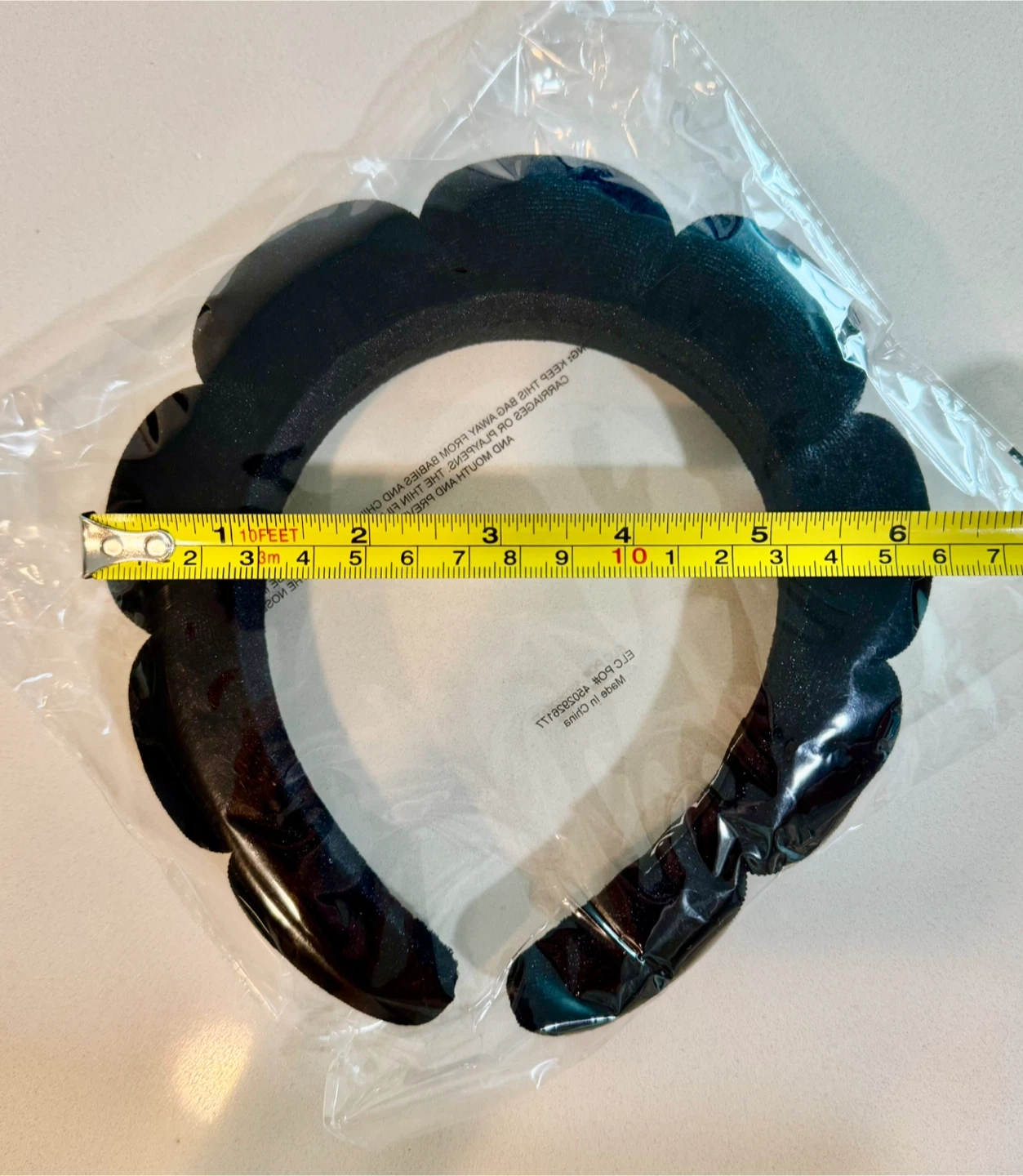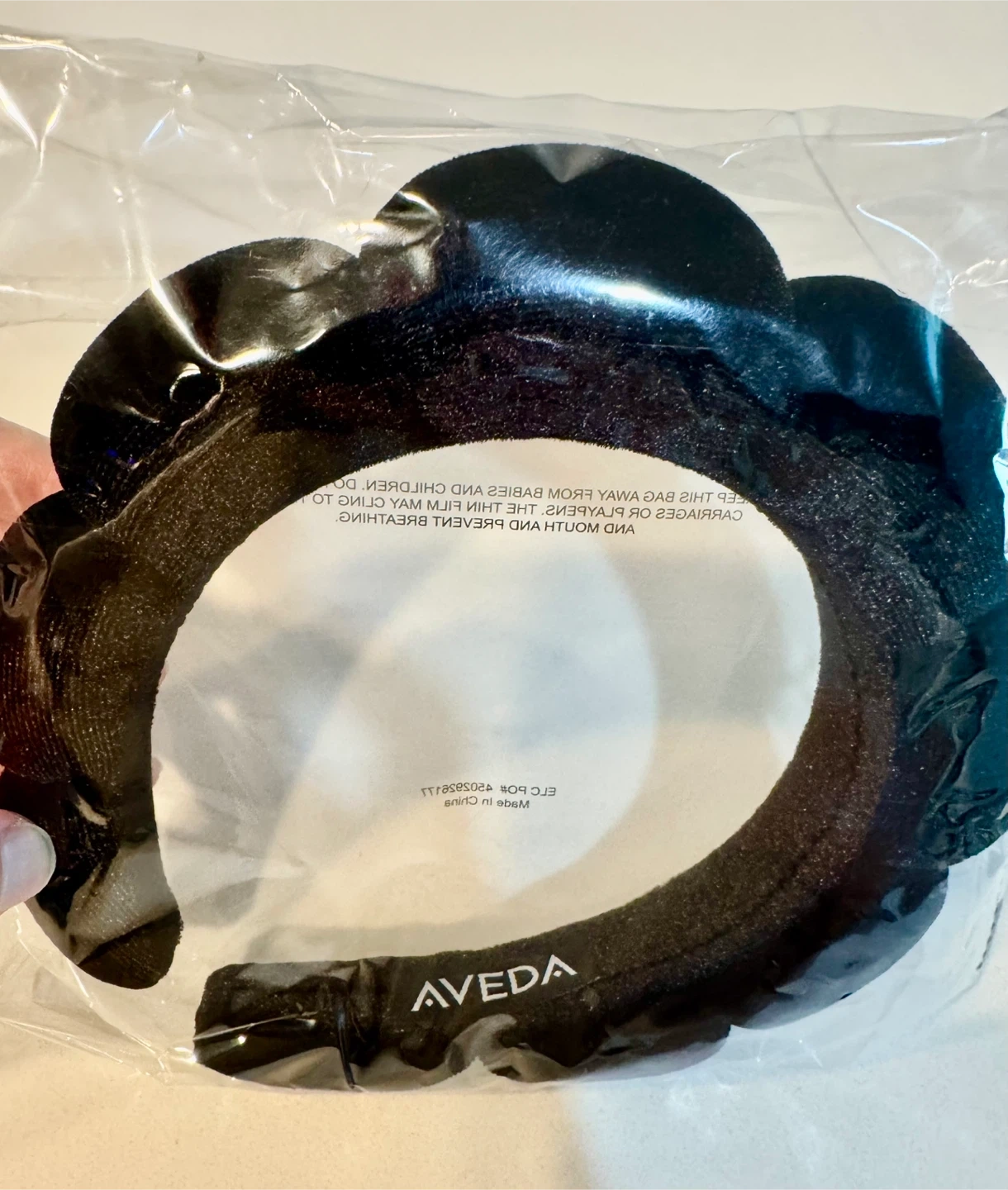 AVEDA Black Fabric Headband Add a touch of style to any hairstyle with this AVEDA headband! It features a stylish scalloped design and is made of fabric. The headband is black and measures approximately 6.8 inches in height and 6.5 inches in width