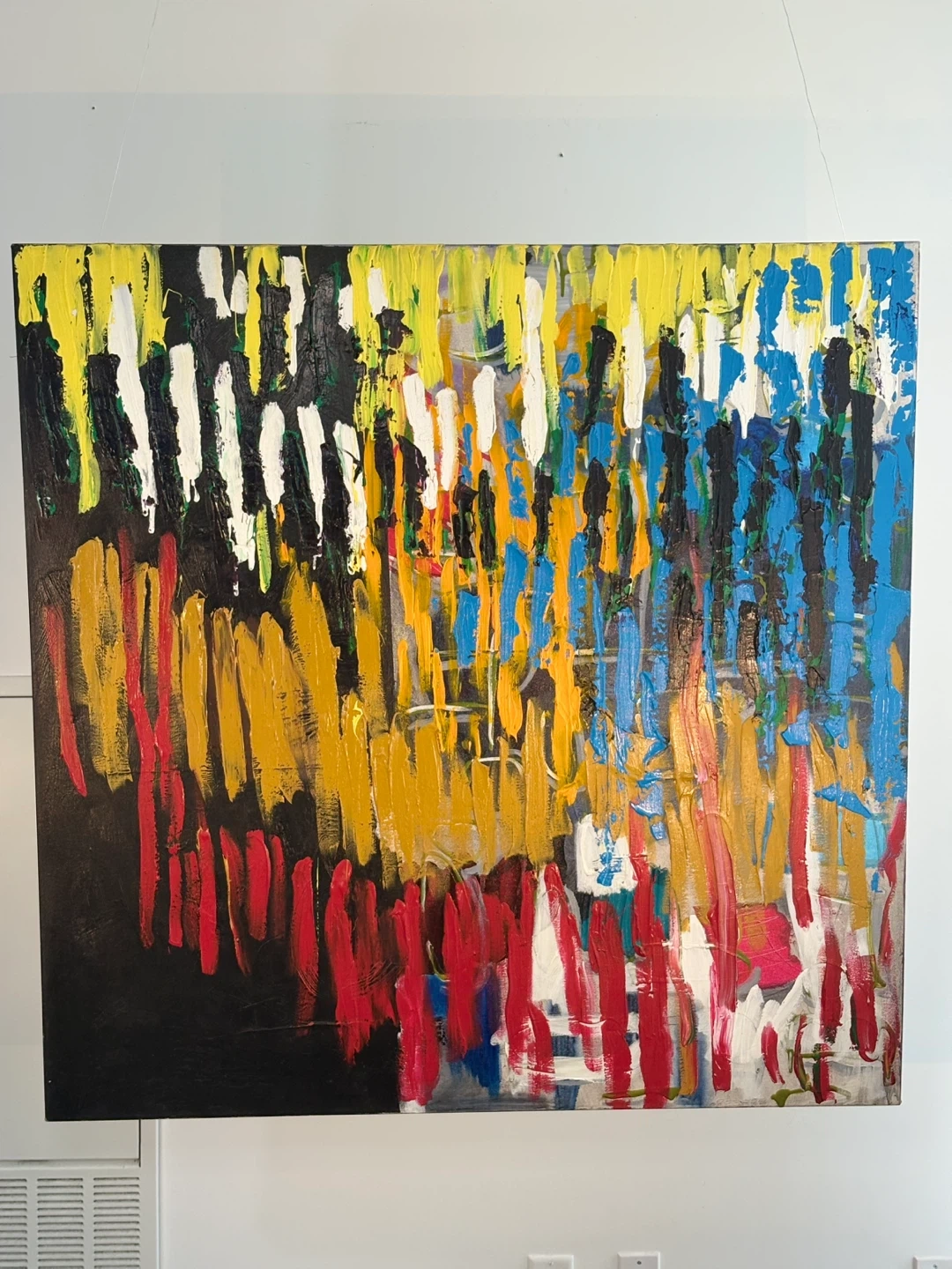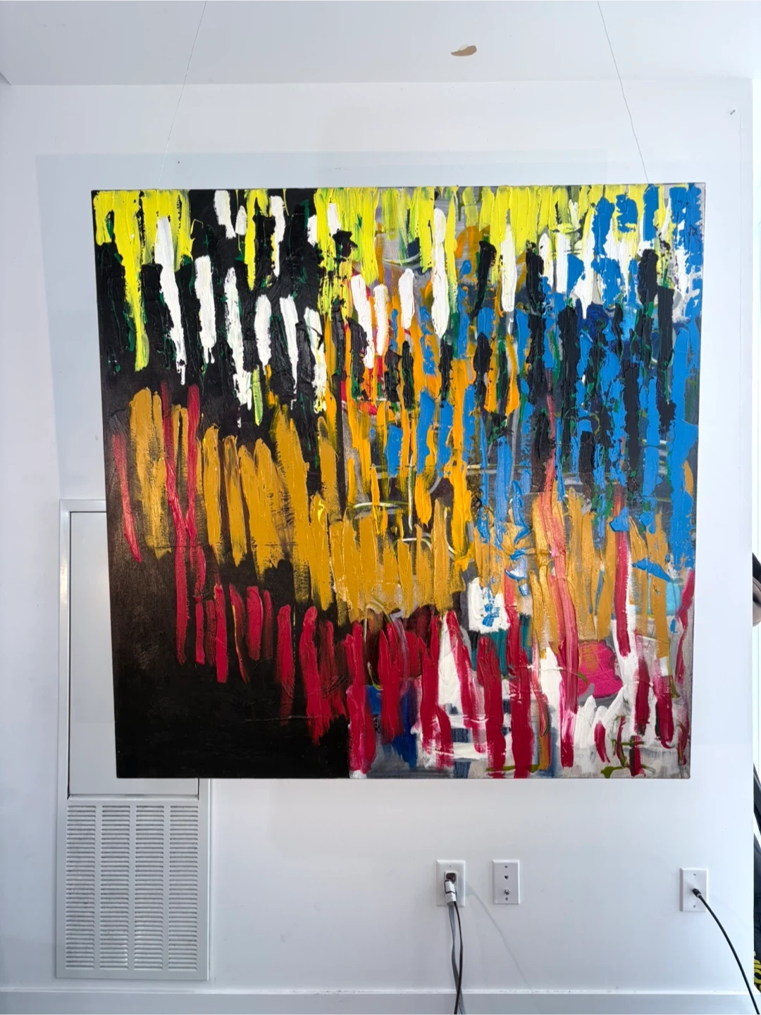 Original abstract expressionist painting by Alex Smith, painted in August 2005 and later featured on the set of the television series Robin Hood. This one-of-a-kind 48” x 48” oil on canvas masterpiece is an investment-grade statement piece that commands attention with its bold, energetic strokes and rich color palette. *Used on Robin Hood TV Show