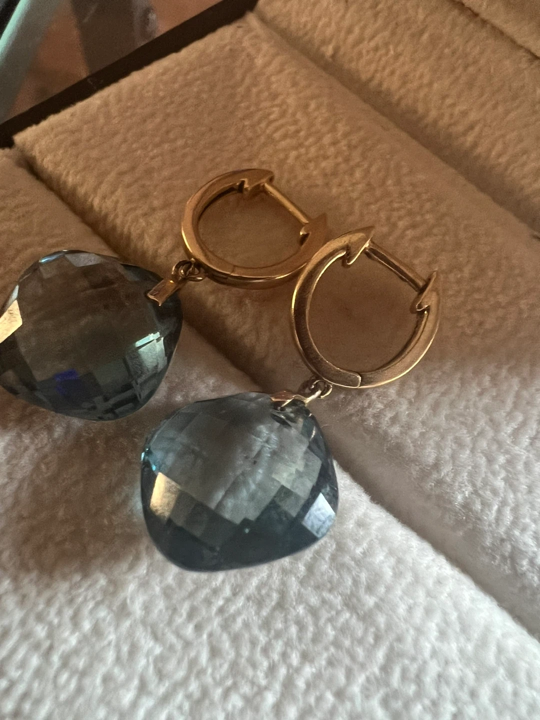 Beautiful pair of drop 14 k yellow gold earrings featuring blue topaz stones and gold settings! They're in great condition and ready to add a touch of elegance to any outfit Weight : 4.7 grams