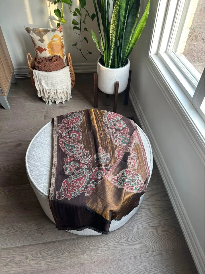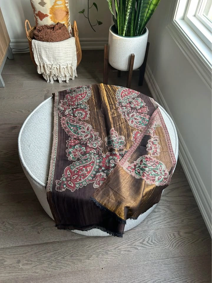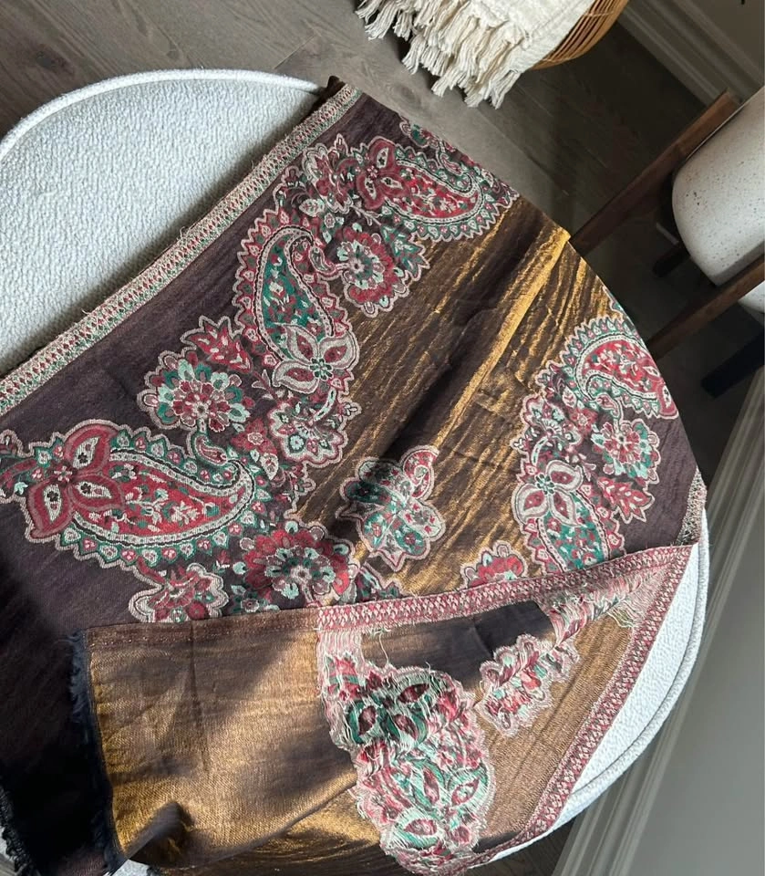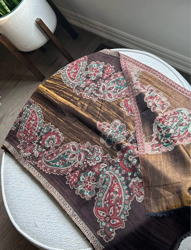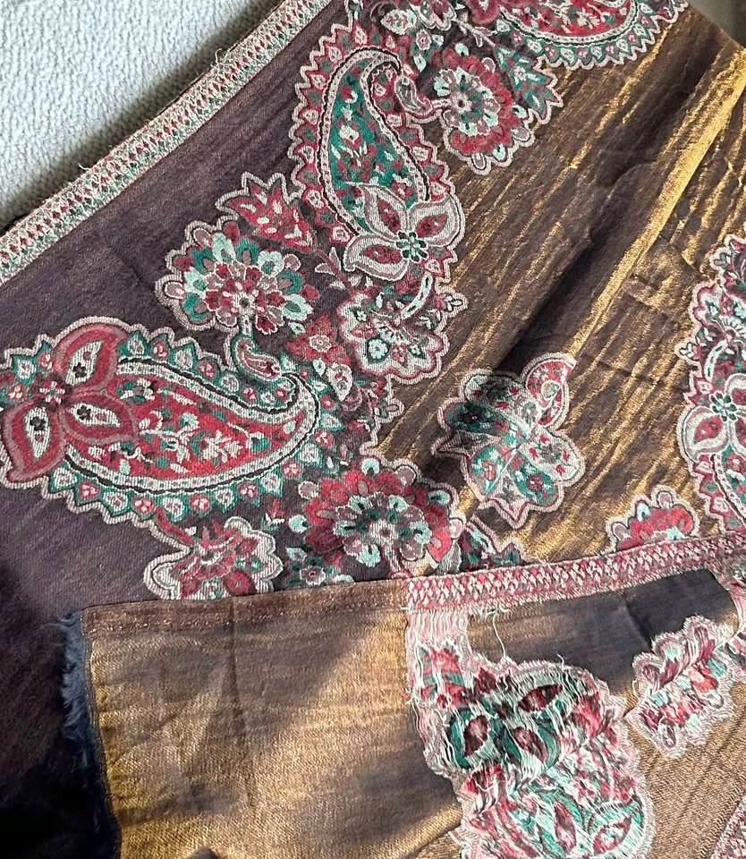 Kaani Moonlight Shawl on soft woollen pashmina. The Moonlight gold effect has been created by weaving fine Zari tissue onto the woollen pashmina base! It’s in unique colour combination . Unmatched beauty, this kani woven moonlight shawl is a showstopper. It Soft and light yet warm shawl. These are one off pieces so purchase now!