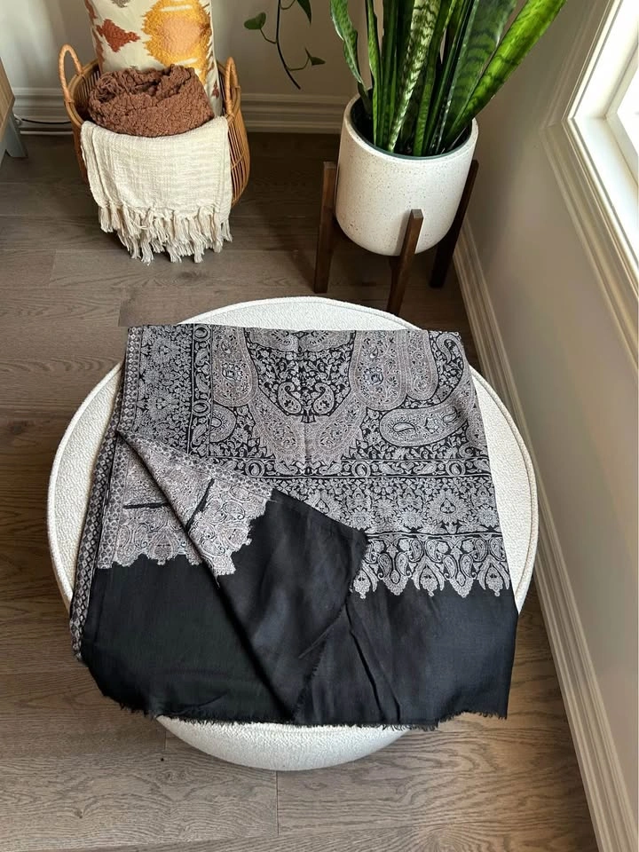 Made from pure, very fine pashmina (toosh quality). Decorated with kani weaving in paisley-pattern. Extremely lightweight yet warm, with a soft drape and rich traditional look. Perfect for gifting or adding a touch of elegance to your own.