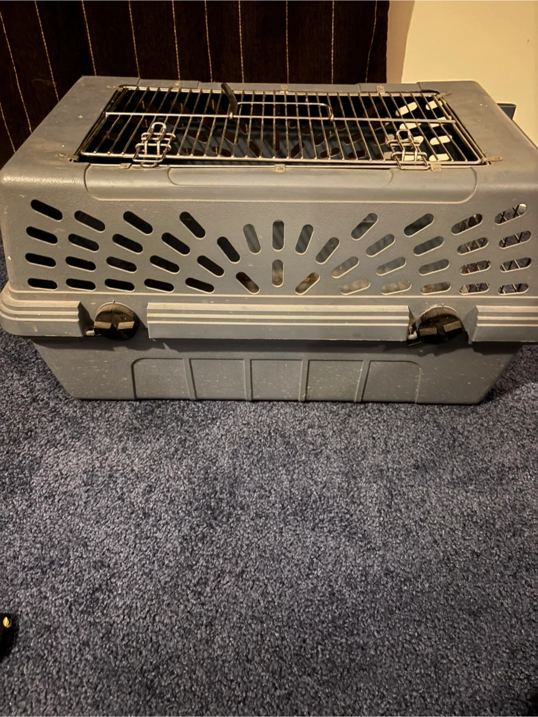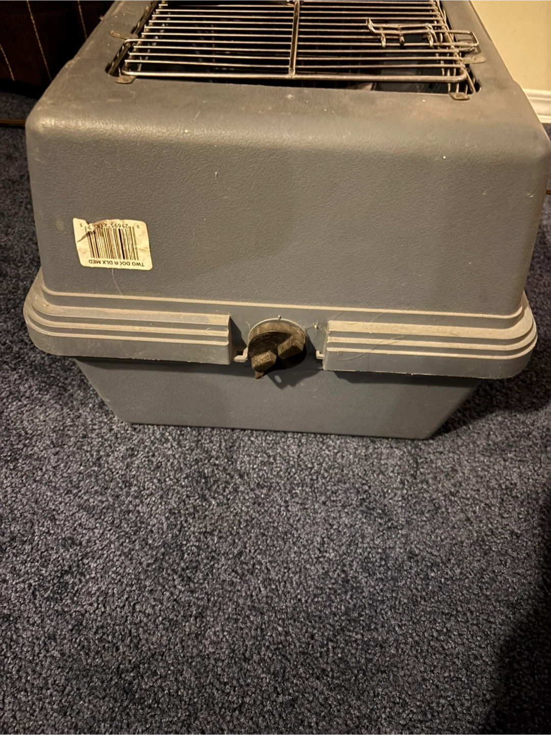 Selling a used 2-Door Deluxe pet carrier. It's in good condition and perfect for transporting your furry friend safely and comfortably! It features a sturdy construction and a secure latching system.