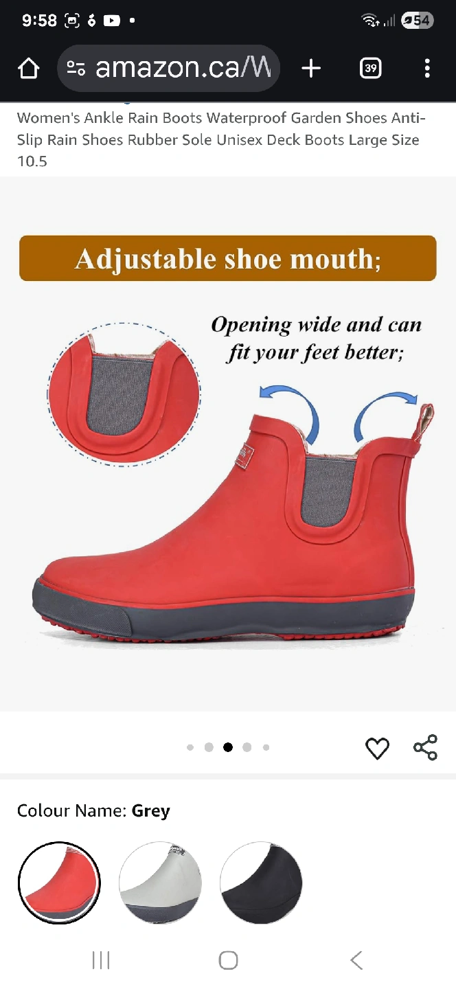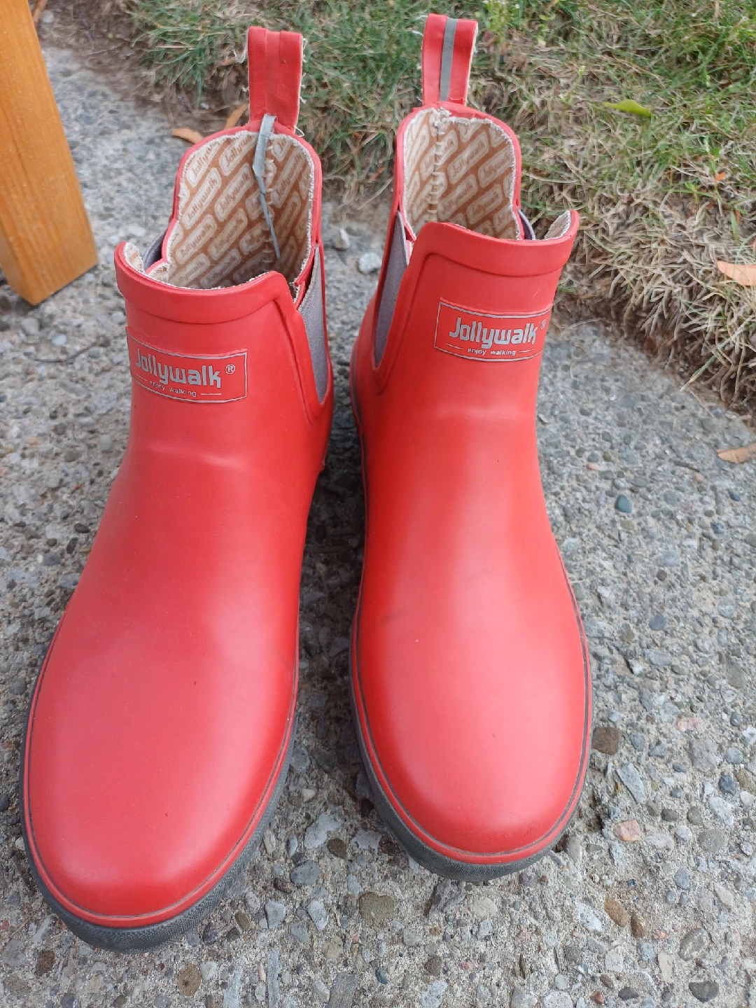 These RED Jollywalk ankle rain boots are perfect for gardening or just running errands on a rainy day! They're a women's size 6.5. The waterproof material makes them quick and easy to clean. Originally bought for $87.