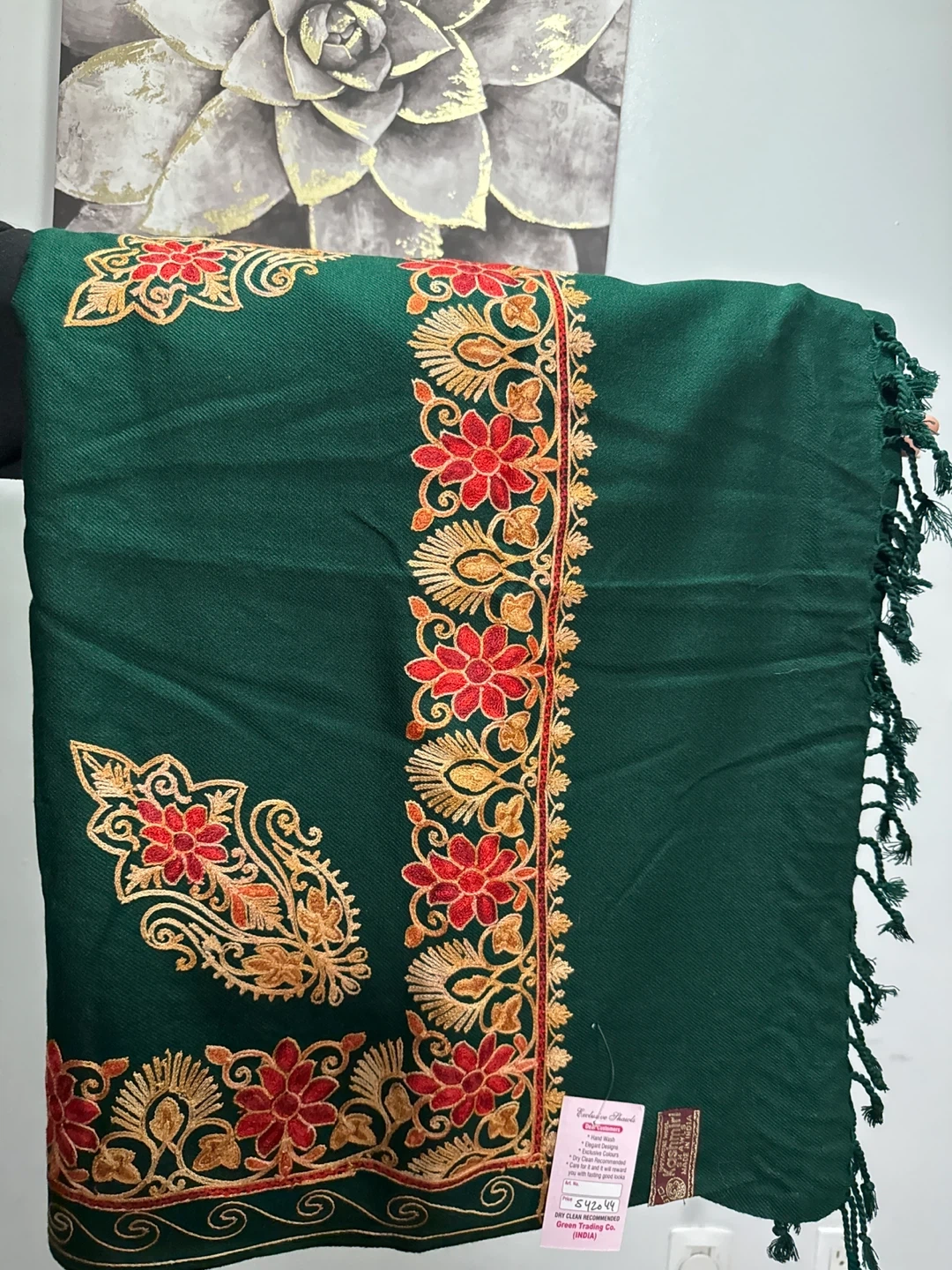 This is a beautiful green Kashmiri shawl with intricate embroidery! It's made of pure wool and is brand new in its original. It's an elegant and hand-washable shawl that would make a lovely addition to your wardrobe