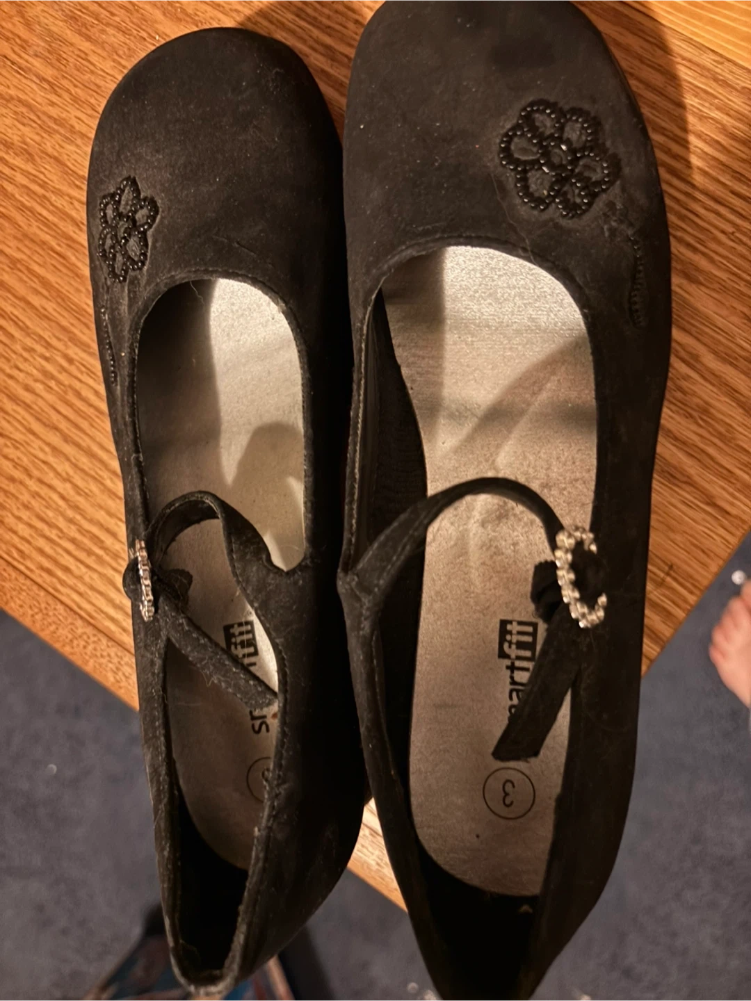 Cute pair of Smartfit girls black dress shoes in a size 3. They have a small heel and a delicate flower design on the top. Perfect for special occasions or dressing up!