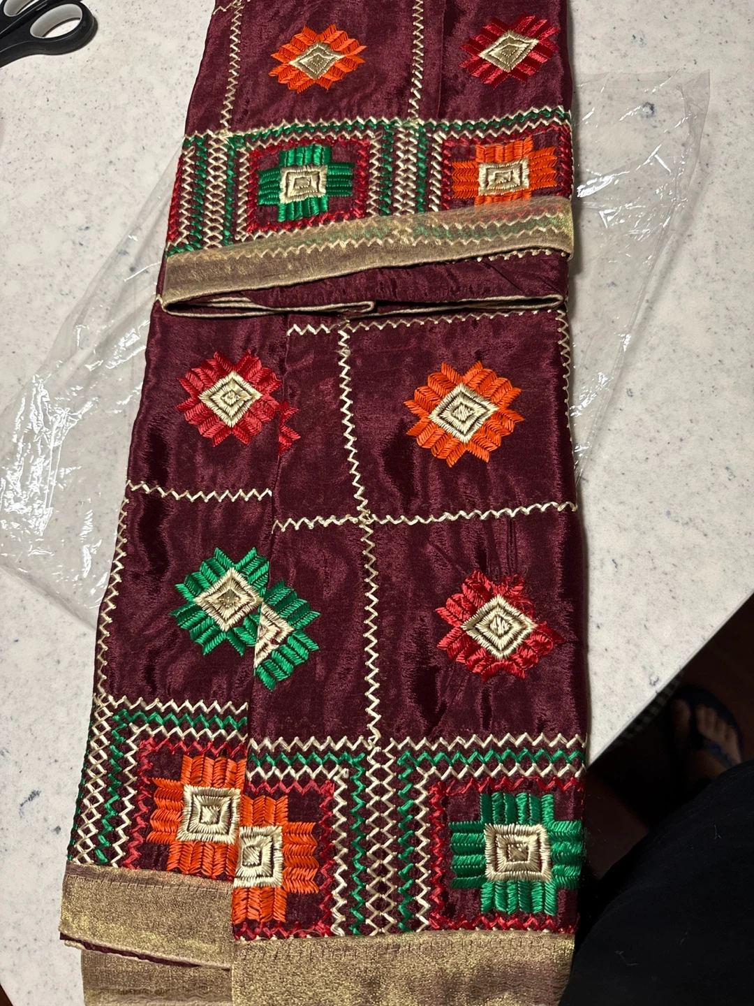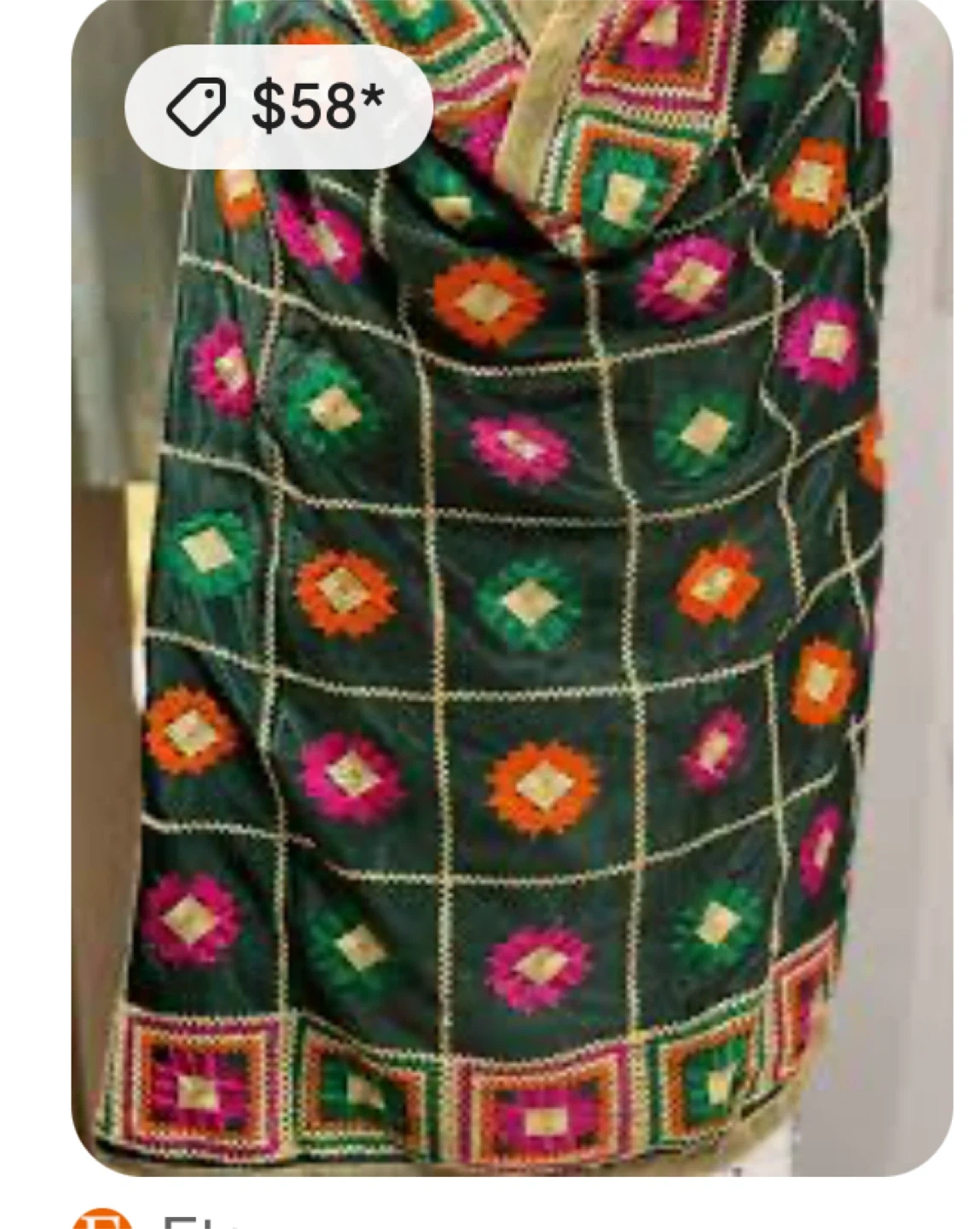 Selling a beautiful maroon Phulkari dupatta with colourful embroidery! It features a traditional design with geometric patterns and vibrant colours like orange, red, and green. It's in great condition and perfect for adding a touch of cultural flair to any outfit