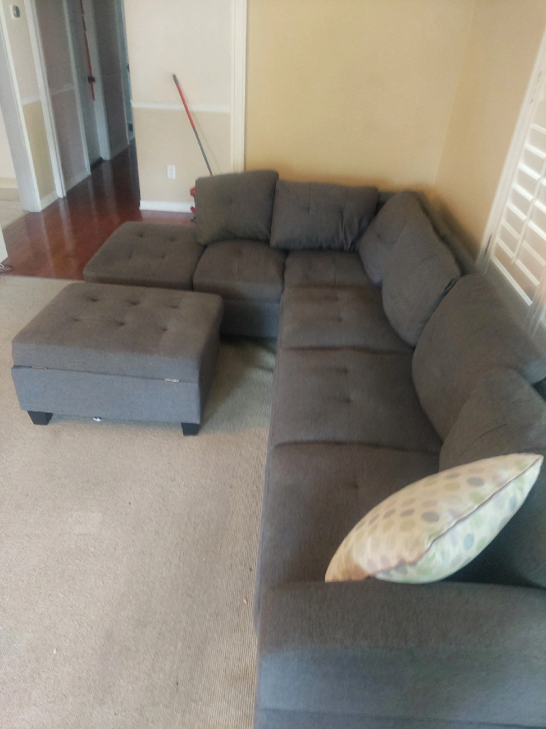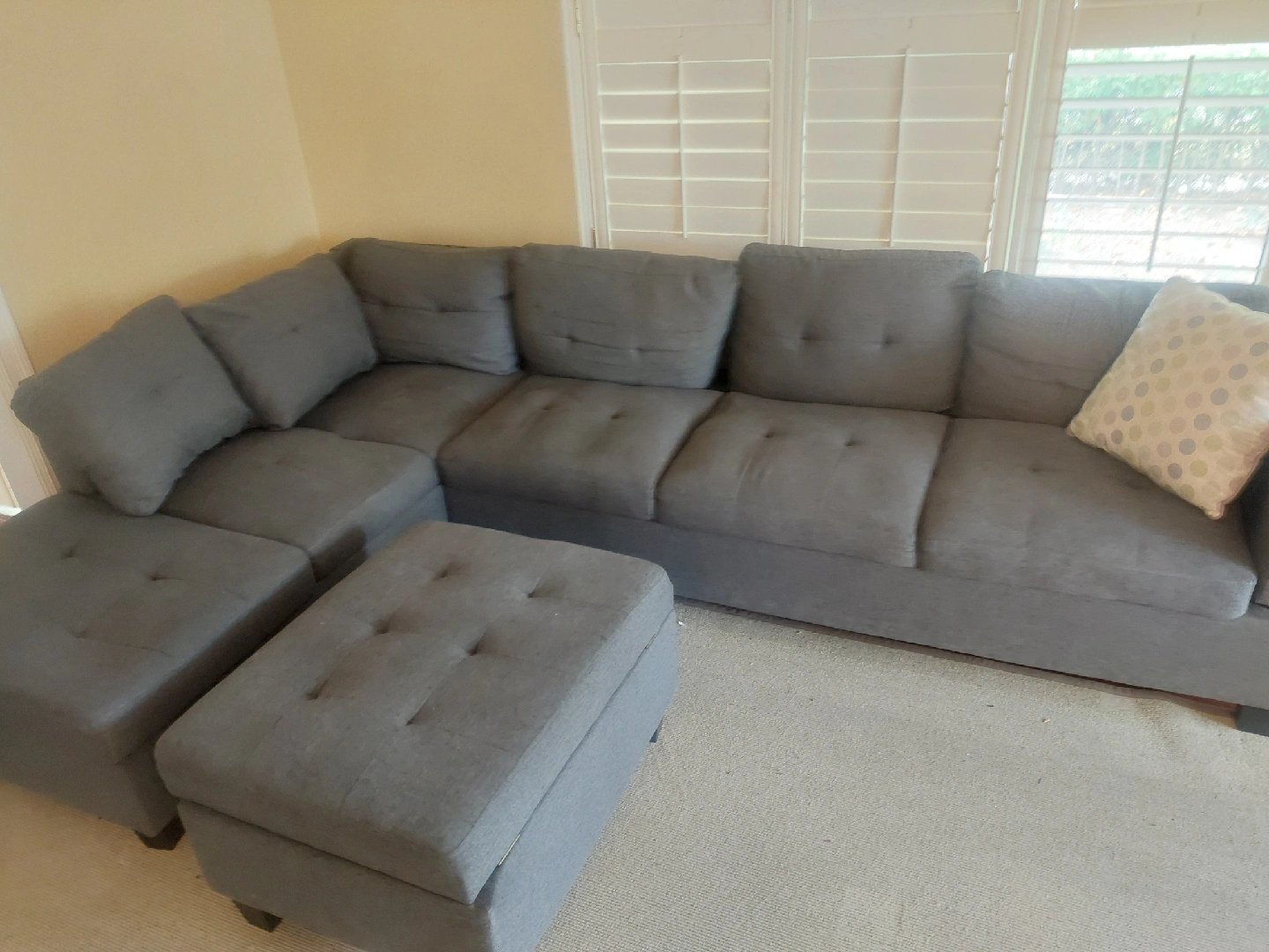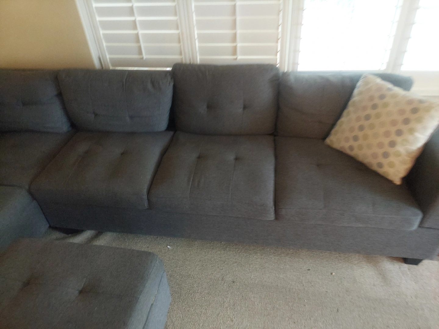 Selling a comfy grey sectional sofa that comes with an ottoman. It's in good condition and would be a great addition to any living room or den. The sectional is a versatile piece that can be arranged in different configurations to suit your space. Perfect for lounging and relaxing after a long day!