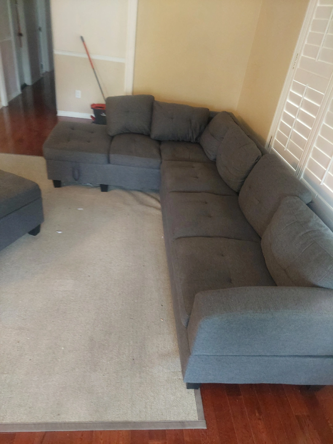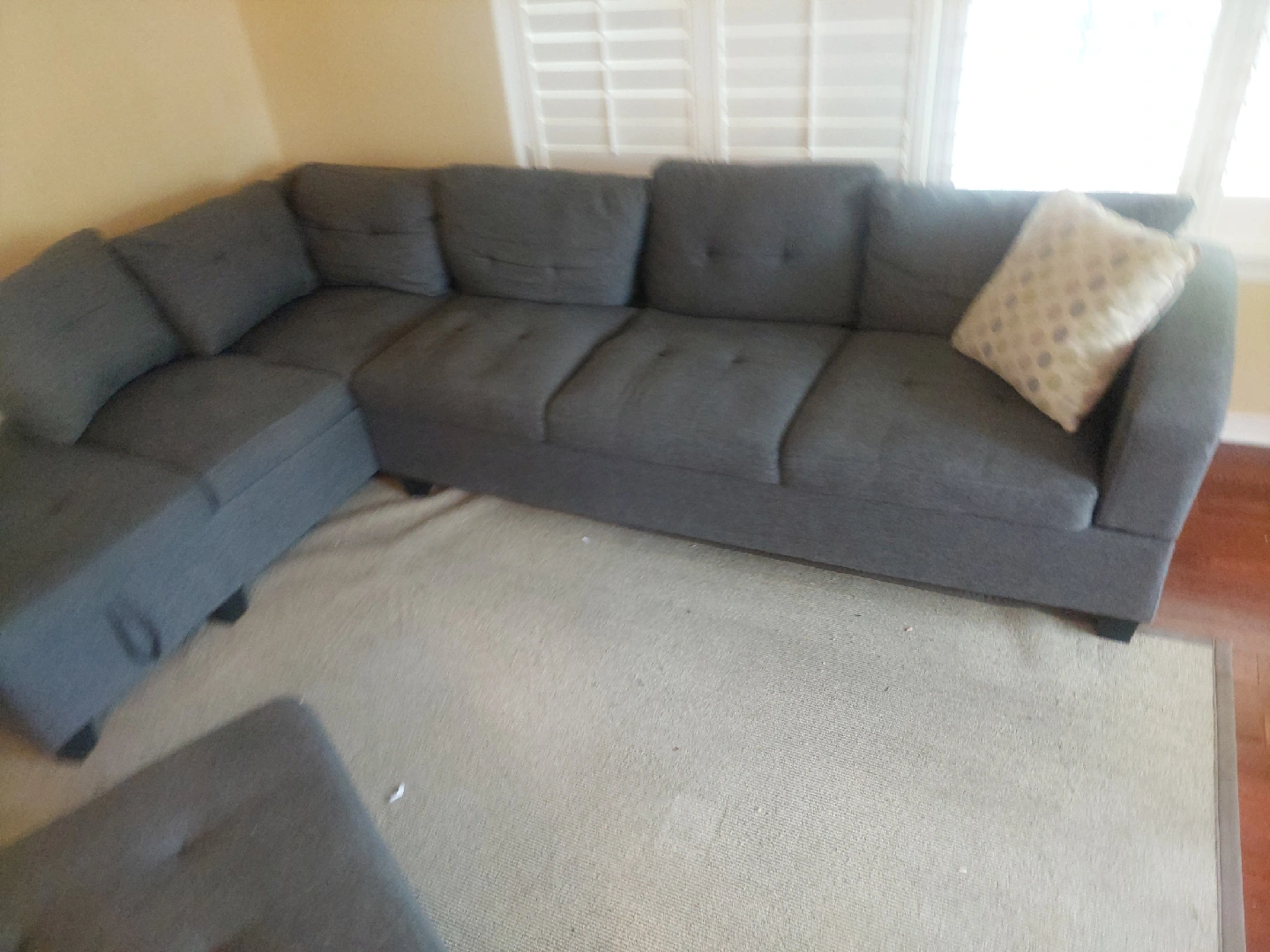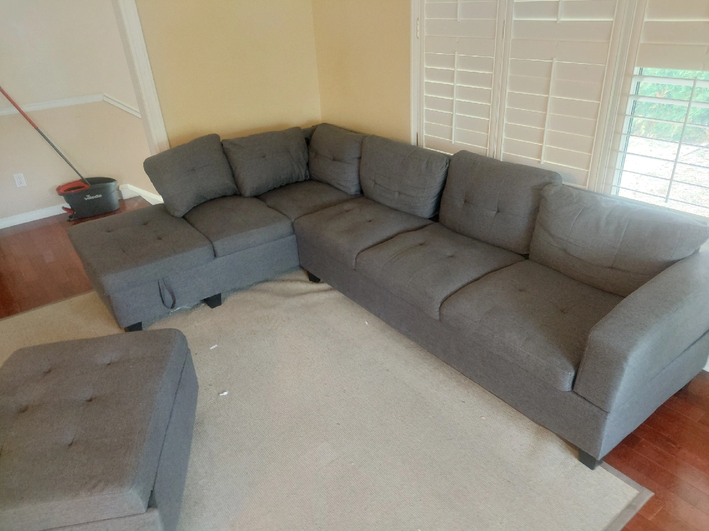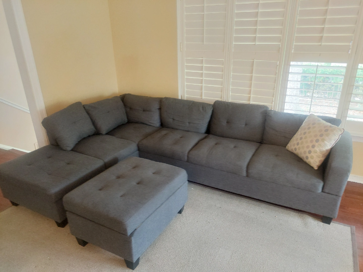 Selling a comfy grey sectional sofa that comes with an ottoman. It's in good condition and would be a great addition to any living room or den. The sectional is a versatile piece that can be arranged in different configurations to suit your space. Perfect for lounging and relaxing after a long day!