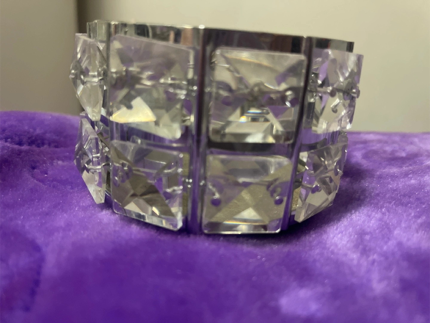 Selling a crystal candle holder! It's in good condition and would look great on a table or shelf. It's made of metal and has crystal accents.