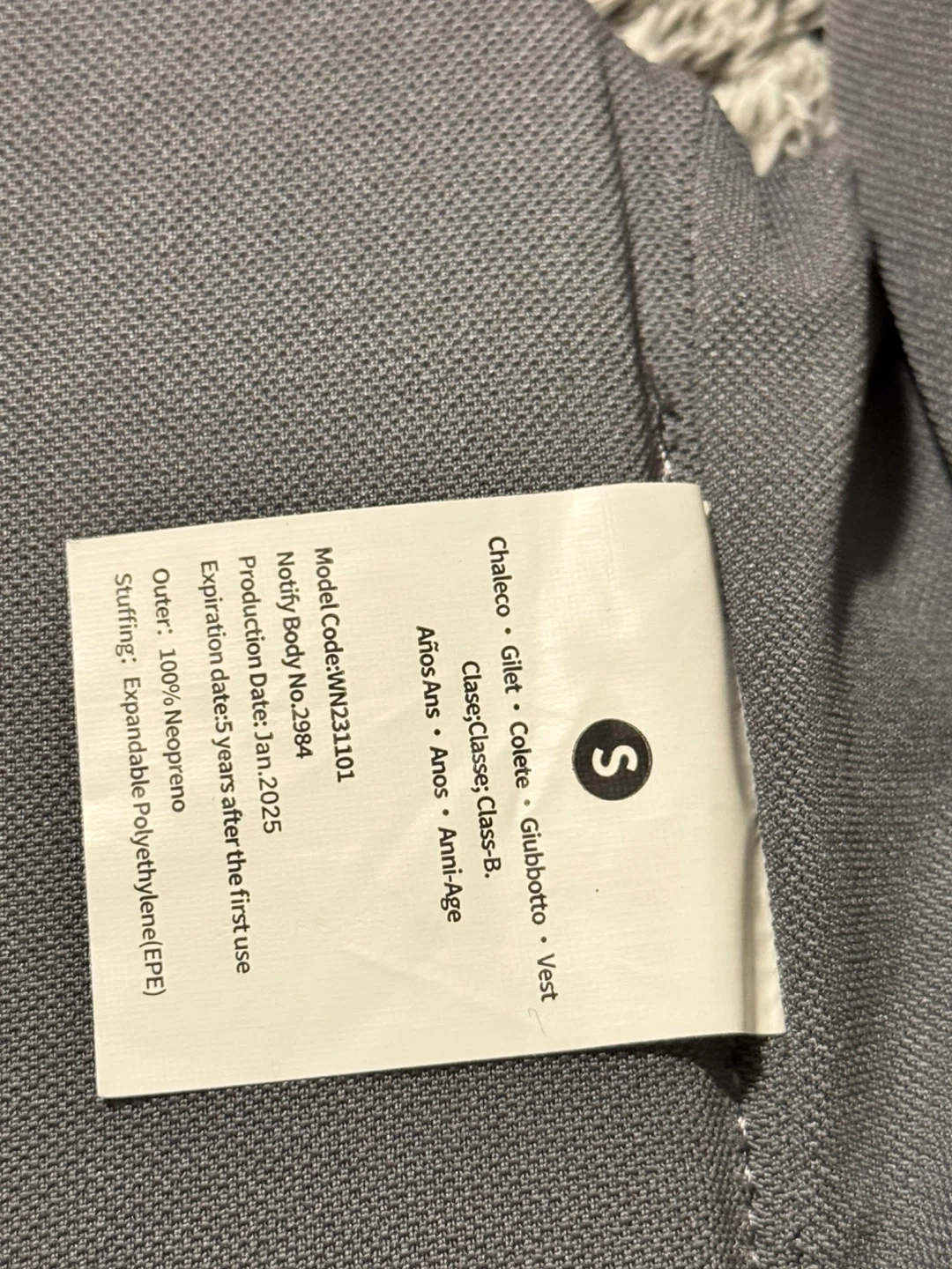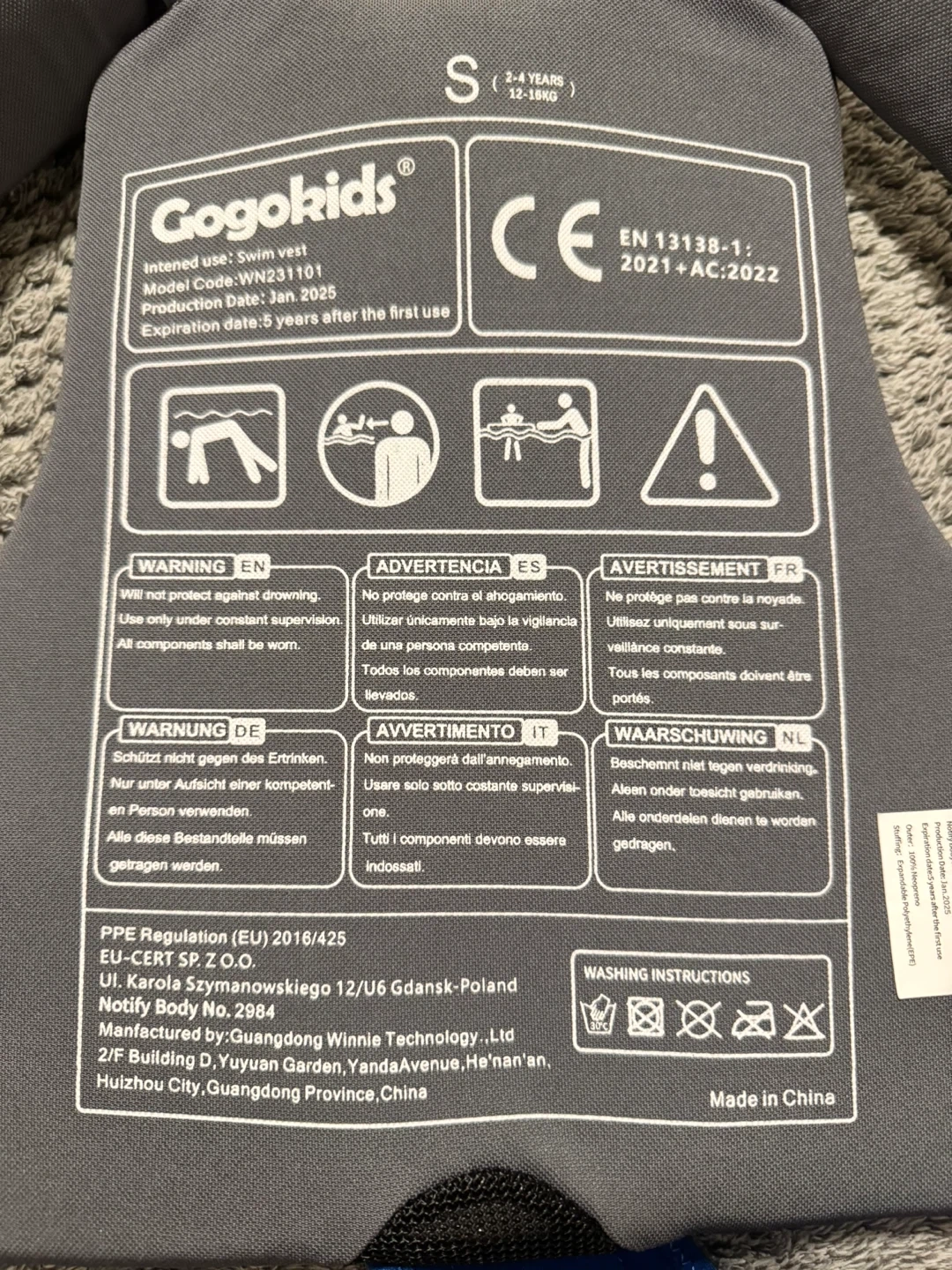 GogoKids swim vest in size small, perfect for little ones aged 2-4 years (12-18kg). The model code is WN231101. It's made with high-grade 2.5mm neoprene fabric and features a high-quality front zipper and two buckles to adjust for a snug fit. The vest also has crotch straps to ensure a secure fit while your child enjoys the water