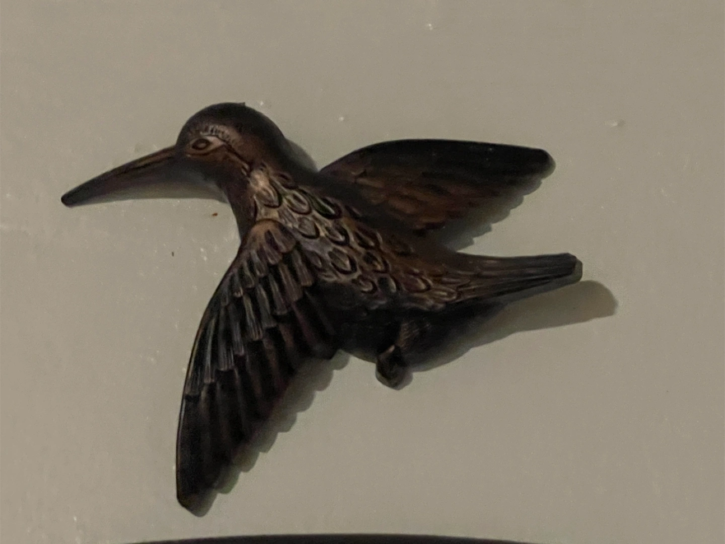 A lovely hummingbird figurine, perfect for adding a touch of nature to your home decor! It has a beautiful bronze-like finish and intricate details on the wings and feathers