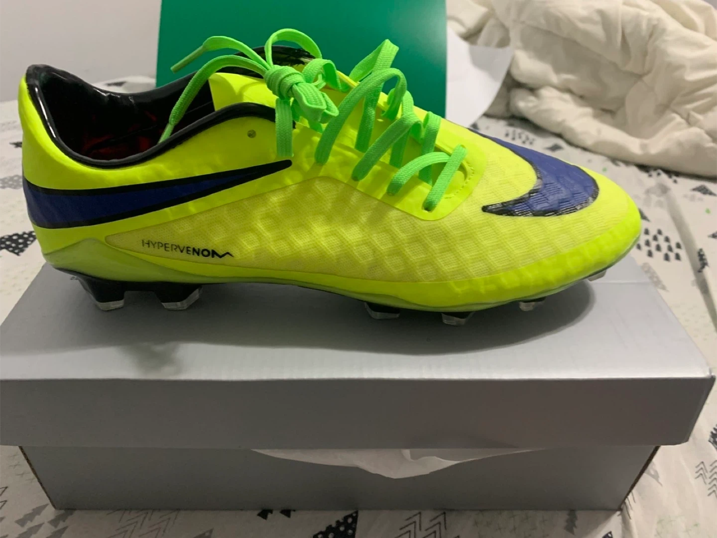Selling a pair of Nike Hypervenom soccer cleats in US size 10! They come in a vibrant yellow and blue colourway and are brand new. The box is included!, size 11 fits 9.5-10