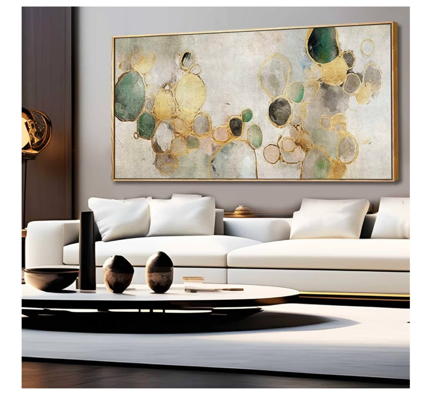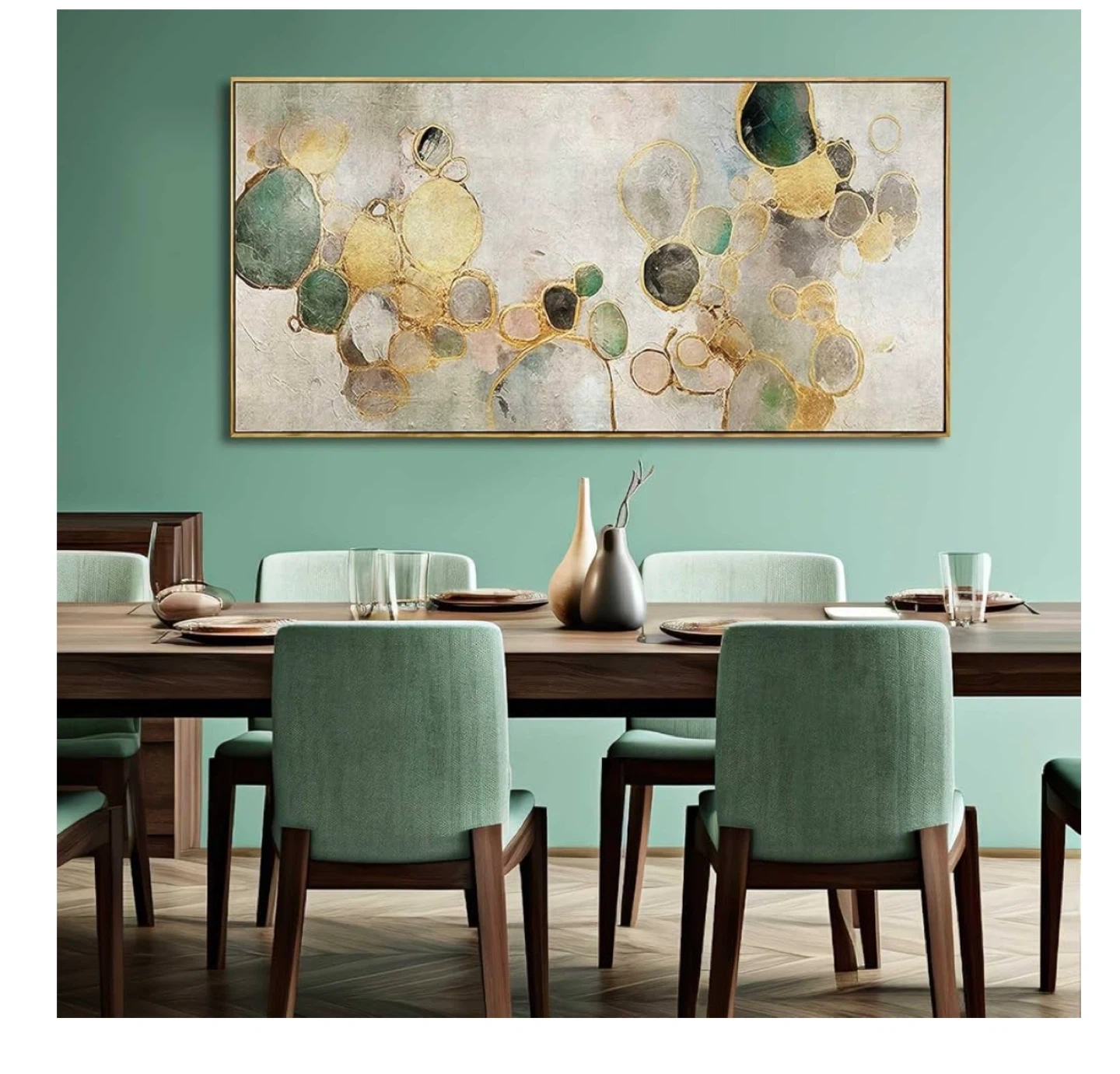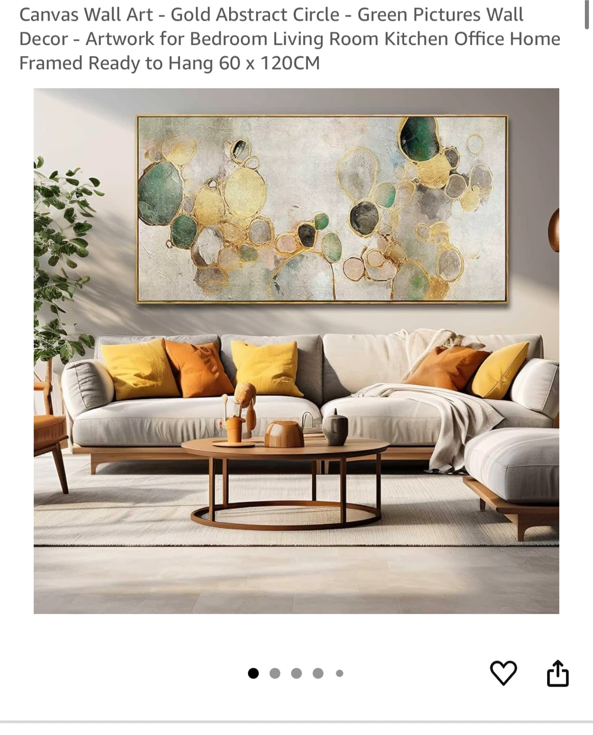 This is a beautiful canvas wall art piece featuring a gold abstract circle and green design. It's ready to hang and would look great in a living room, kitchen, or office. The dimensions are 60 x 120 cm