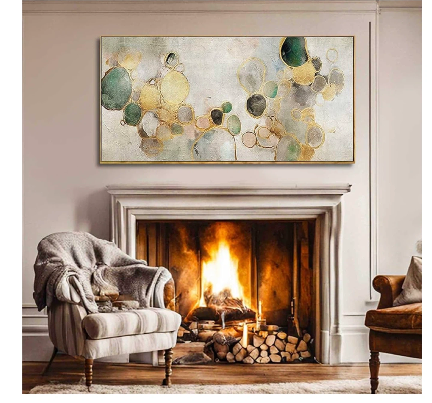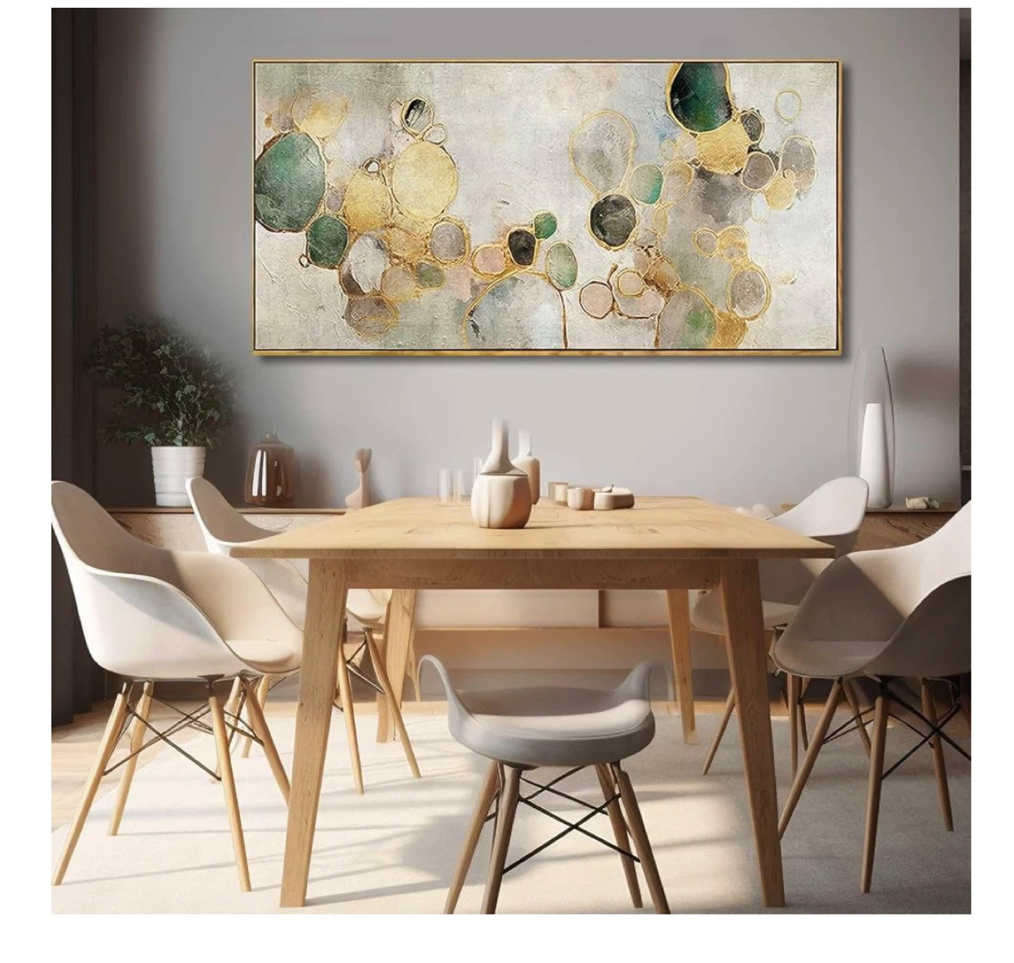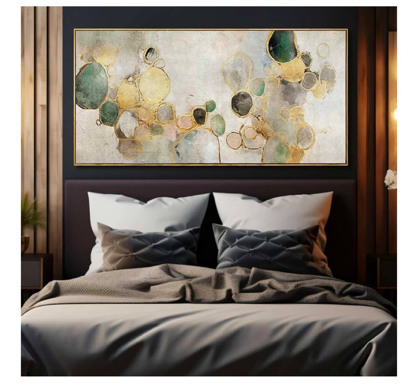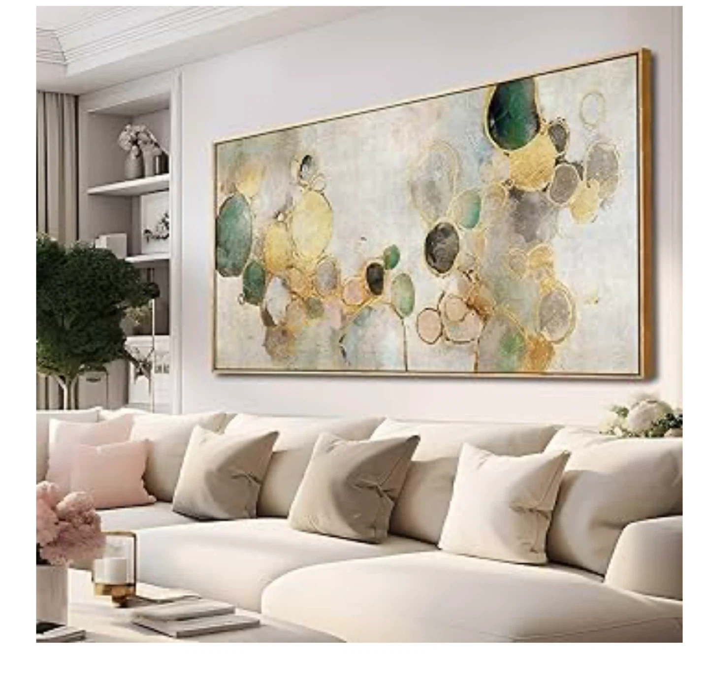 This is a beautiful canvas wall art piece featuring a gold abstract circle and green design. It's ready to hang and would look great in a living room, kitchen, or office. The dimensions are 60 x 120 cm