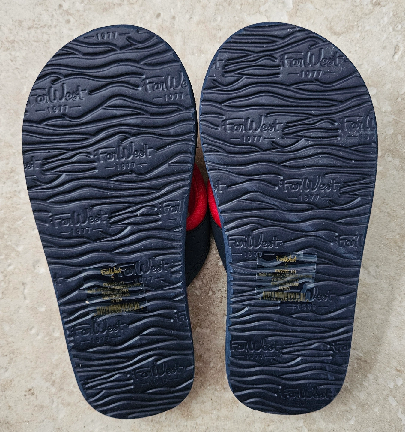New with tags, FarWest Summerland flip flops. Youth size 5 in navy blue and red. Milton pick up, cash only, no holds.