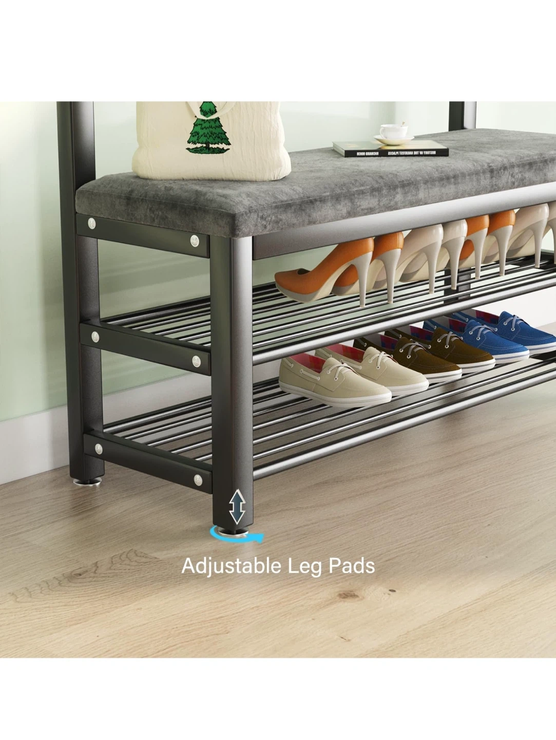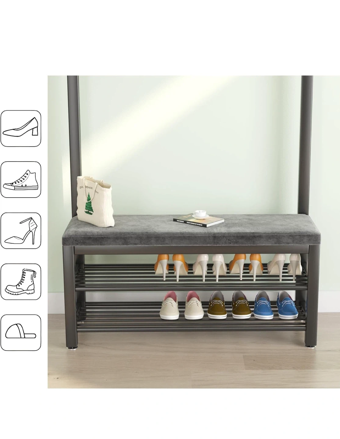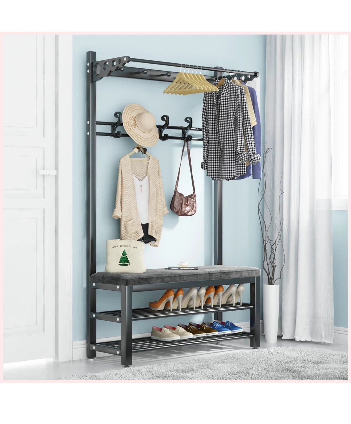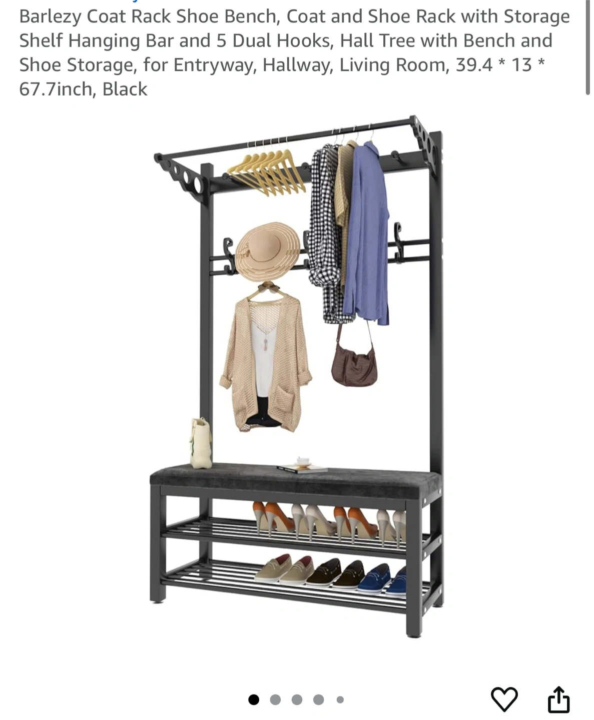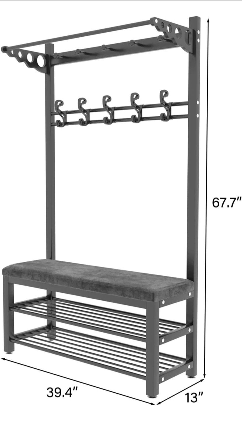 I'm selling a black Barlezy coat rack with a shoe bench! It features a storage shelf, hanging bar, and 5 dual hooks. Perfect for an entryway, hallway, or living room. Dimensions are 39.4" x 13" x 67.7"