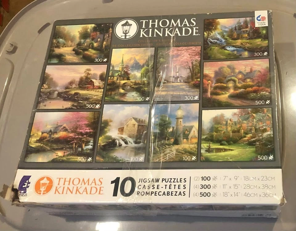 A box of 10 different Thomas Kinkade puzzles. I got this from Goodwill and never ended up using it. Asking $10 — works out to $1/puzzle. Newton, NE. Cash only. Can sometimes meet. No automated messages.