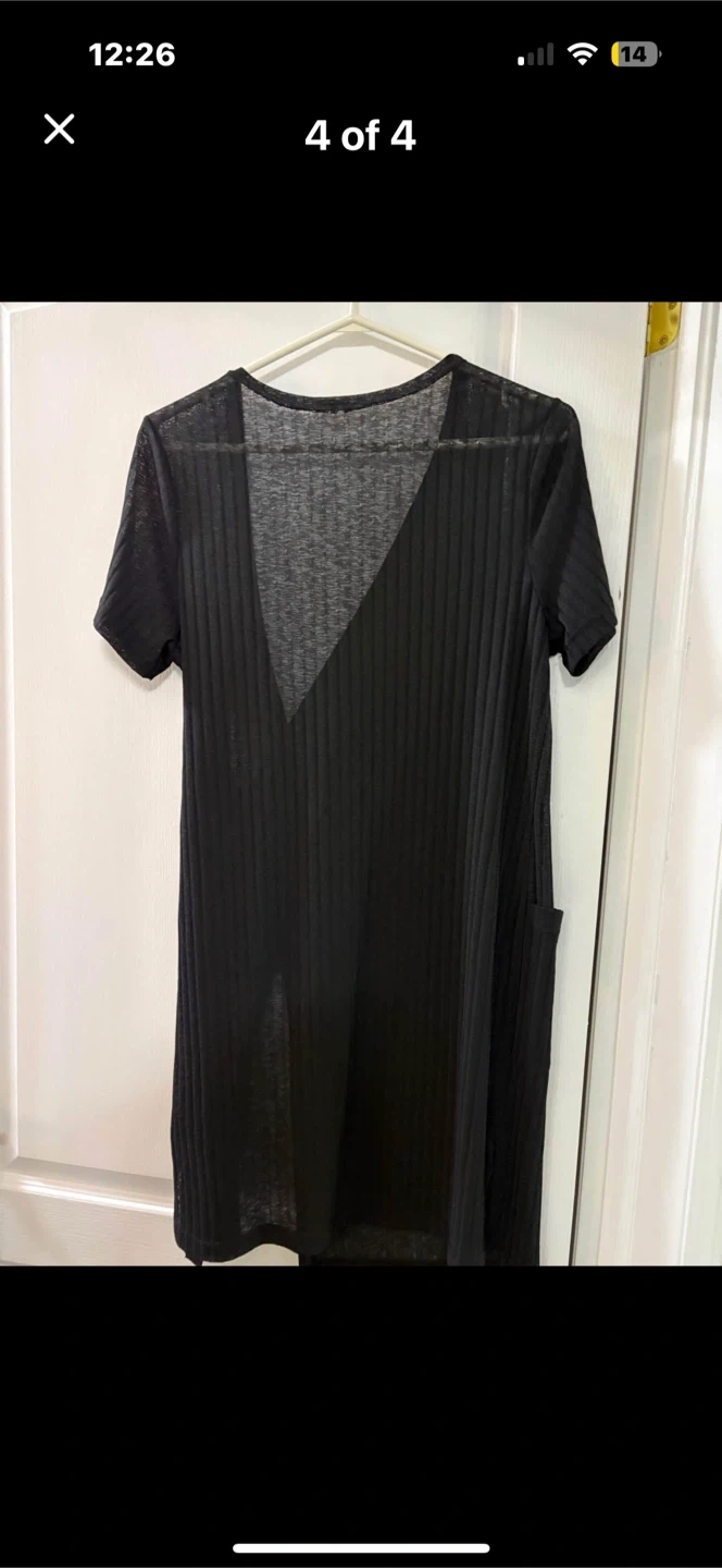Selling a cute black ribbed dress! Size medium. It has short sleeves, a V-neck, and a unique wrap detail with a ring accent. Perfect for a casual day out or dressed up for an evening event Pickup in Brampton📍 Please checkout my other listings ℹ thanks 😊