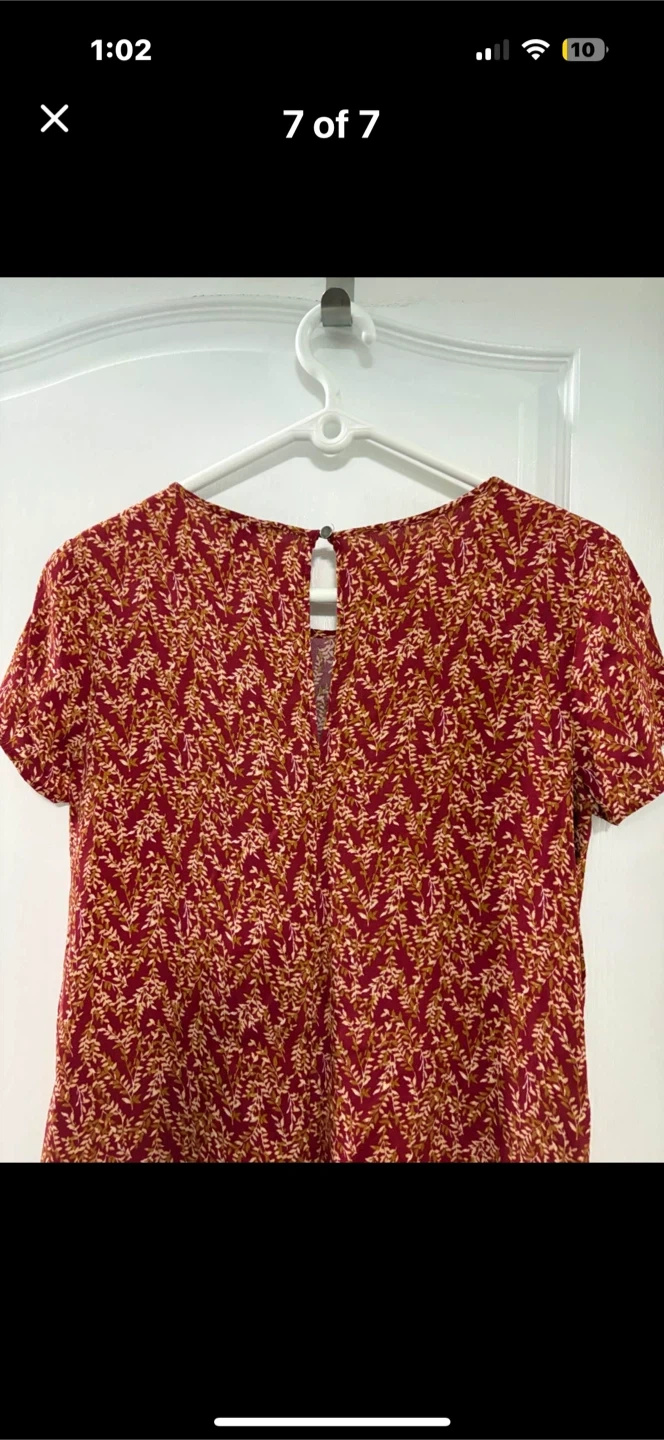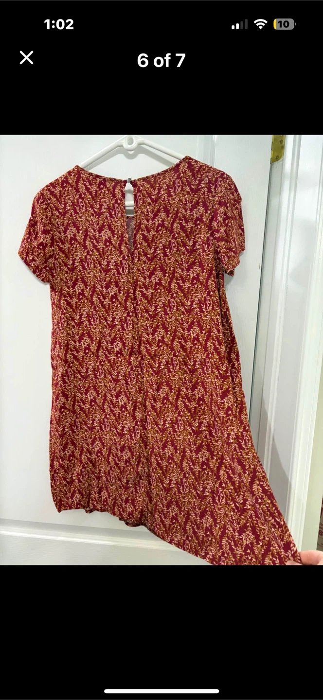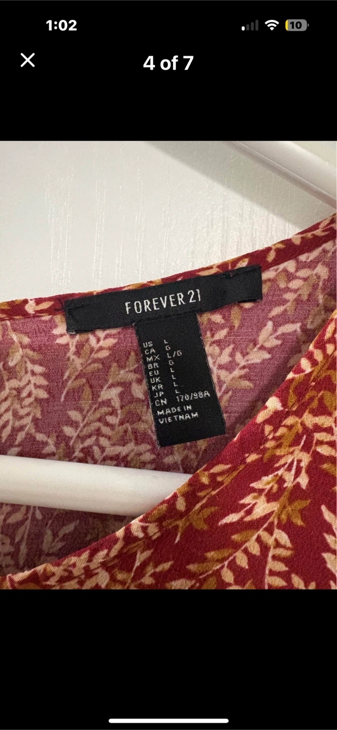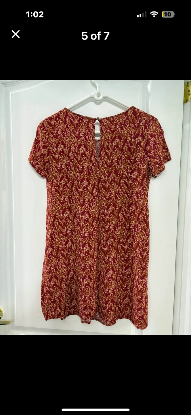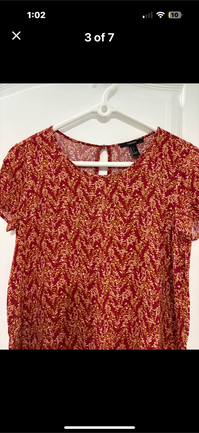 Selling a cute Forever 21 dress in size large! It features a red and gold leaf-like pattern. Perfect for a casual day out or dressing up for an evening event. In great condition! Pickup in Brampton📍 Please checkout my other listings ℹ thanks 😊