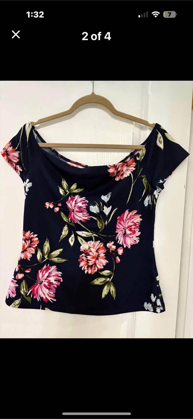 Selling a cute Jo&Co floral off shoulder top in size large! The dark blue background with a colourful floral pattern is really eye-catching. It's in great condition and ready for a new home Pickup in Brampton📍 Please checkout my other listings ℹ thanks 😊