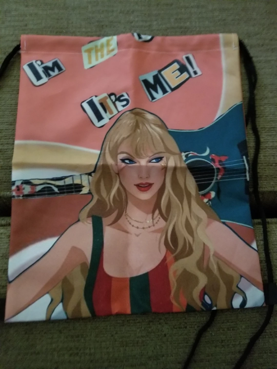 Drawstring bag featuring a portrait. Pink background. The bag has black drawstrings. A fun item to carry your things. Brand new