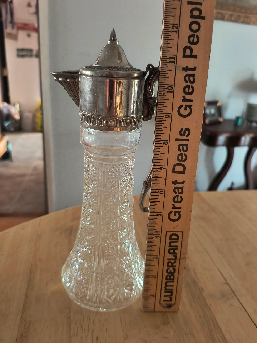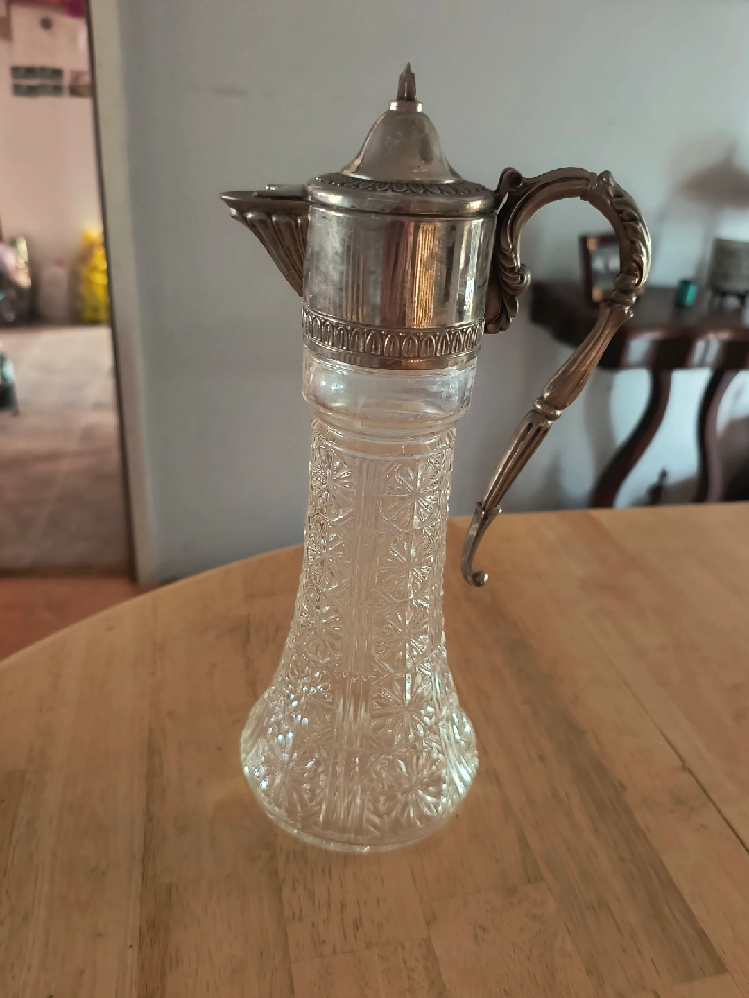 Selling a vintage a Primrose wine decanter with a silver-plated top and a beautiful crystal glass base. It's approximately 12 inches tall. It would make a lovely addition to any dining table or collection