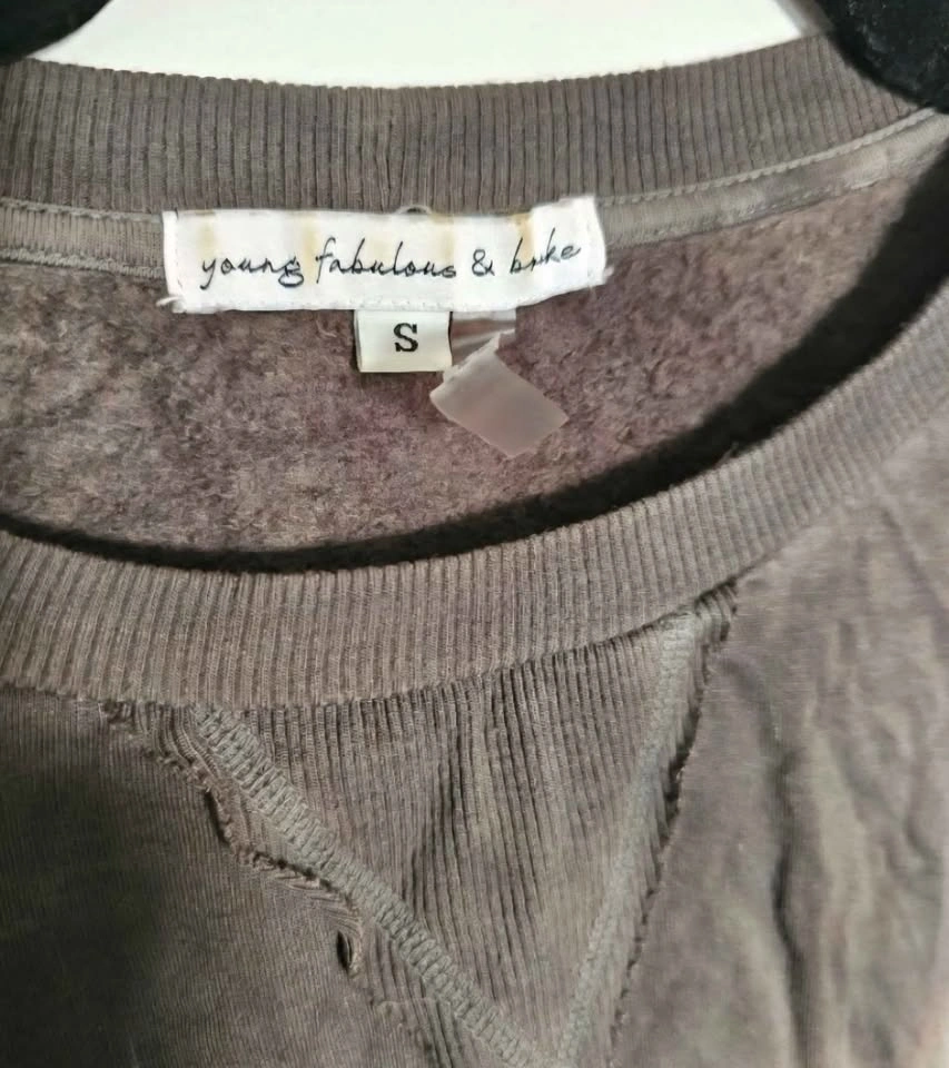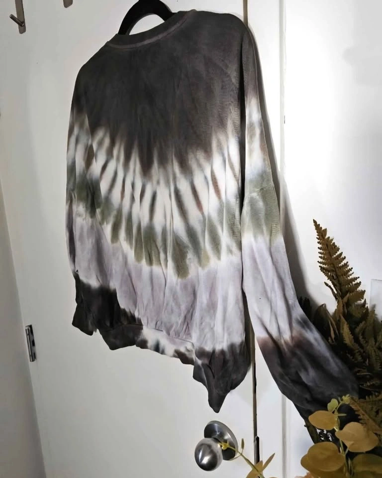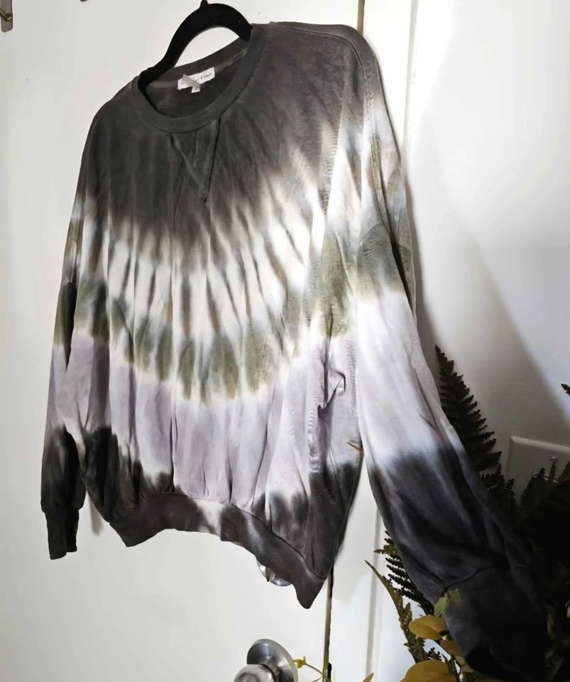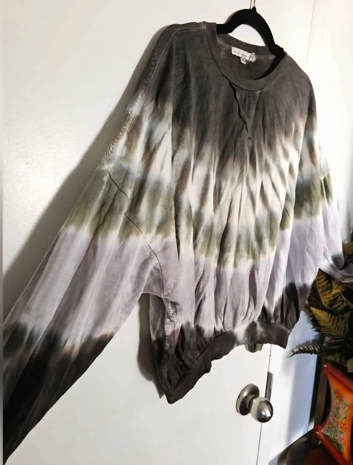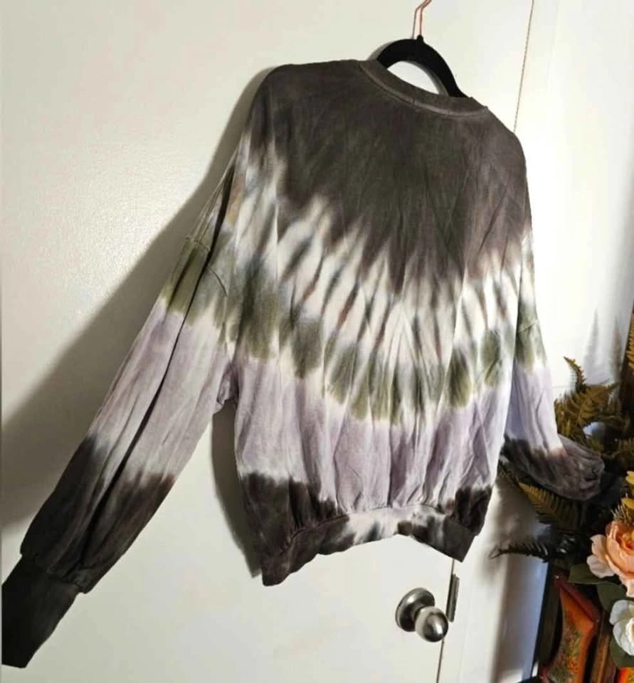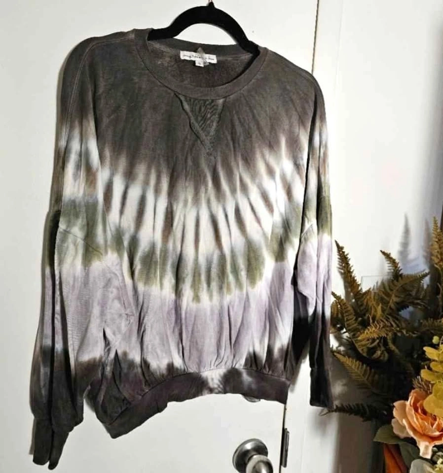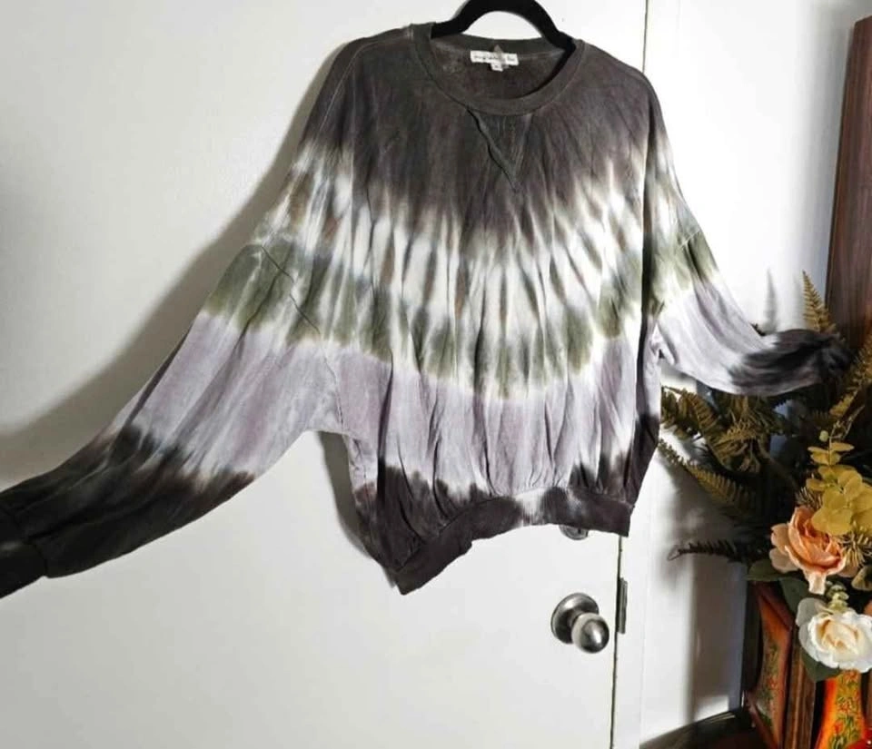 Cute lightweight sweatshirt or warm long sleeve top from Young Fabulous & Broke. Top is tie dyed in a charcoal grey, pale green, and a light grey-ish lavender purple, on a white base material. Top is thin but lined with fleece so it's very soft, comfortable, and cozy. Size small but it's an oversized fit so would easily work for a medium as well. Ribbed cuffs and waistband and a crew neck. No pit to pit measurement because the dolman sleeve style means the 'armpit' seams are actually at the elbow, dolman style. Across the waistband measures about 17" and shoulder to bottom hem measures about 23.5". It is in excellent used condition. Made of 95% rayon and 5% spandex.