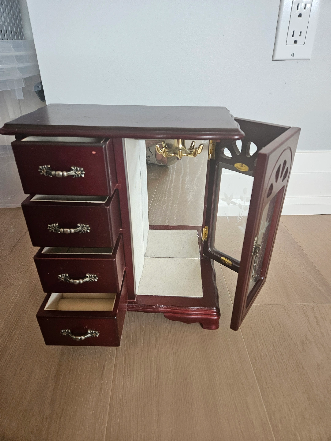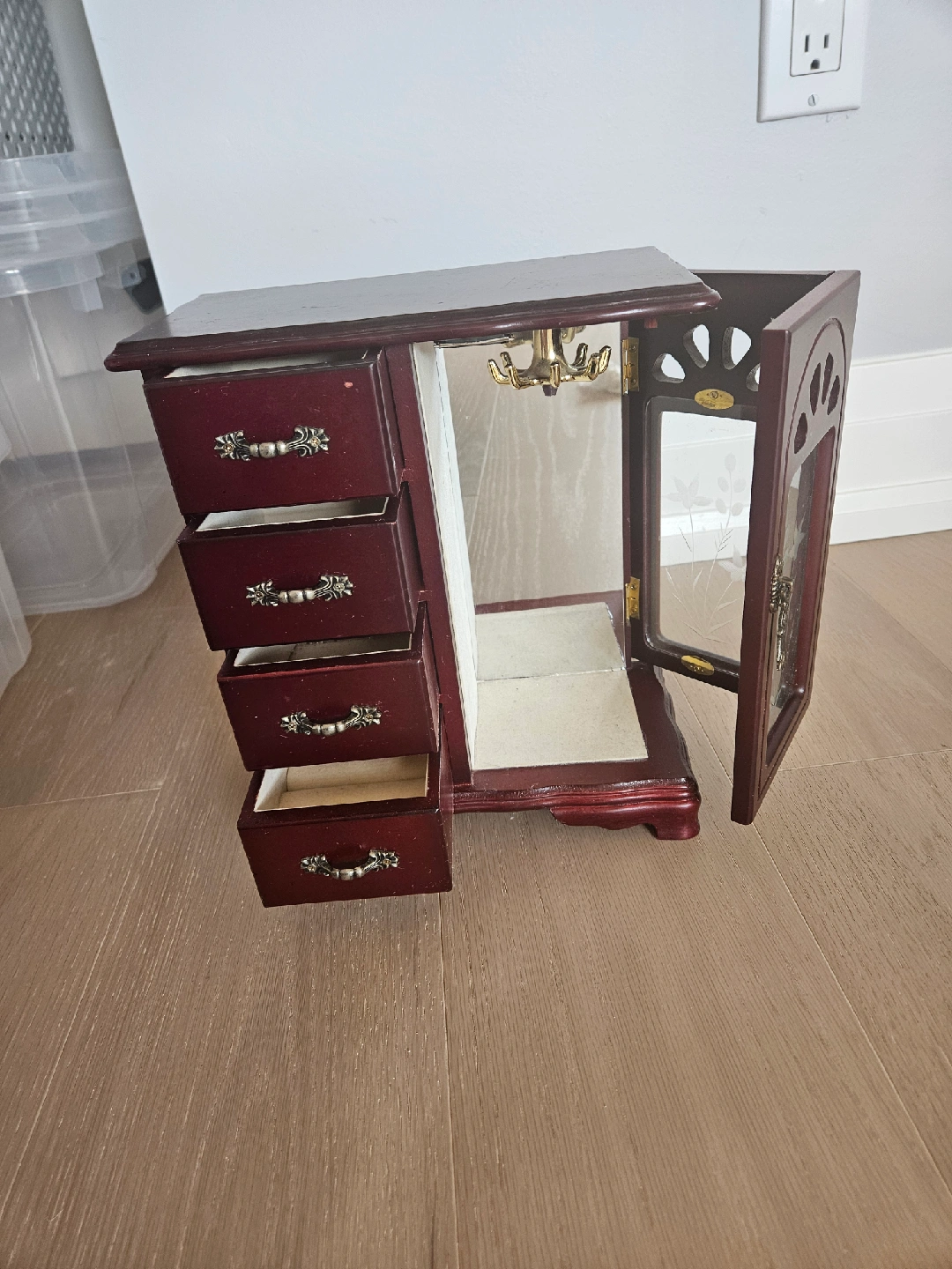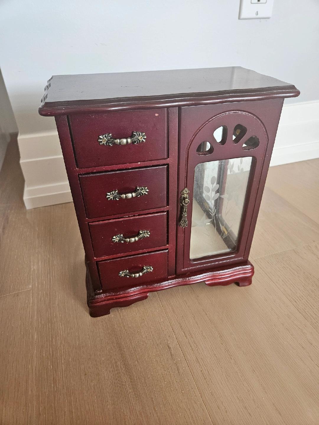 A lovely burgundy jewellery box with multiple drawers and a side door for hanging necklaces or bracelets. It's in great condition and perfect for keeping your precious items organized and safe! 9.5 x4.5 inch x 10.5 inch tall