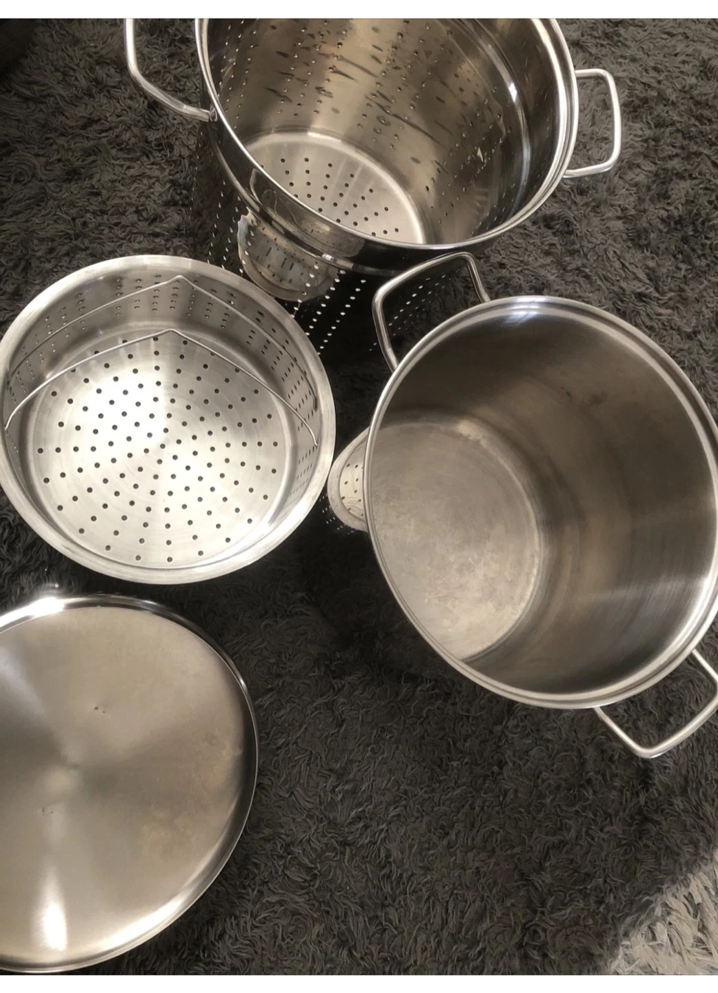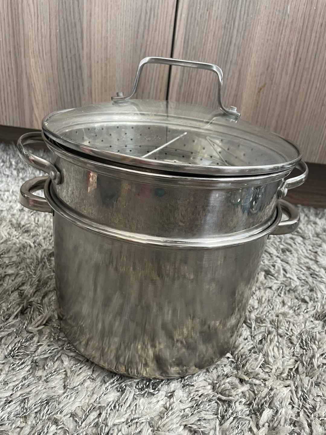 Selling a stainless steel steamer pot with a glass lid. It's in good condition and ready for your next meal prep! Perfect for steaming veggies, dumplings, or anything else you like