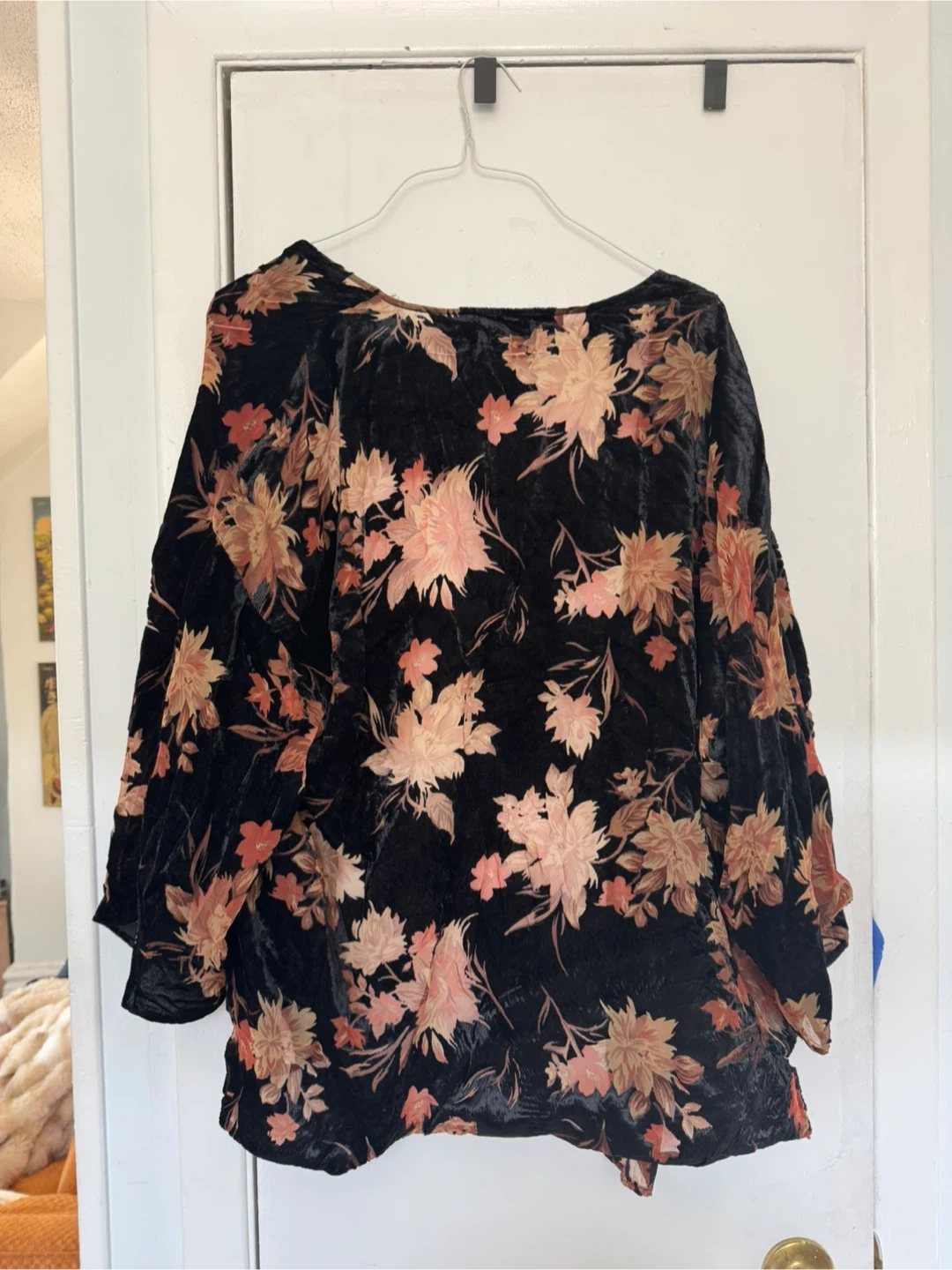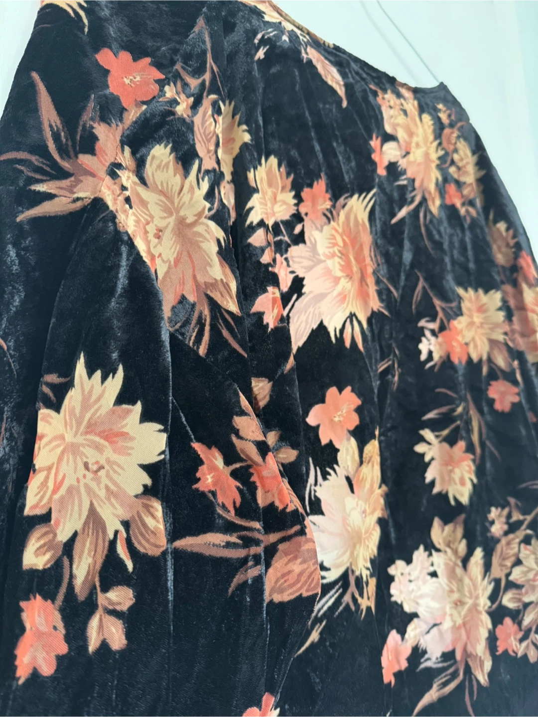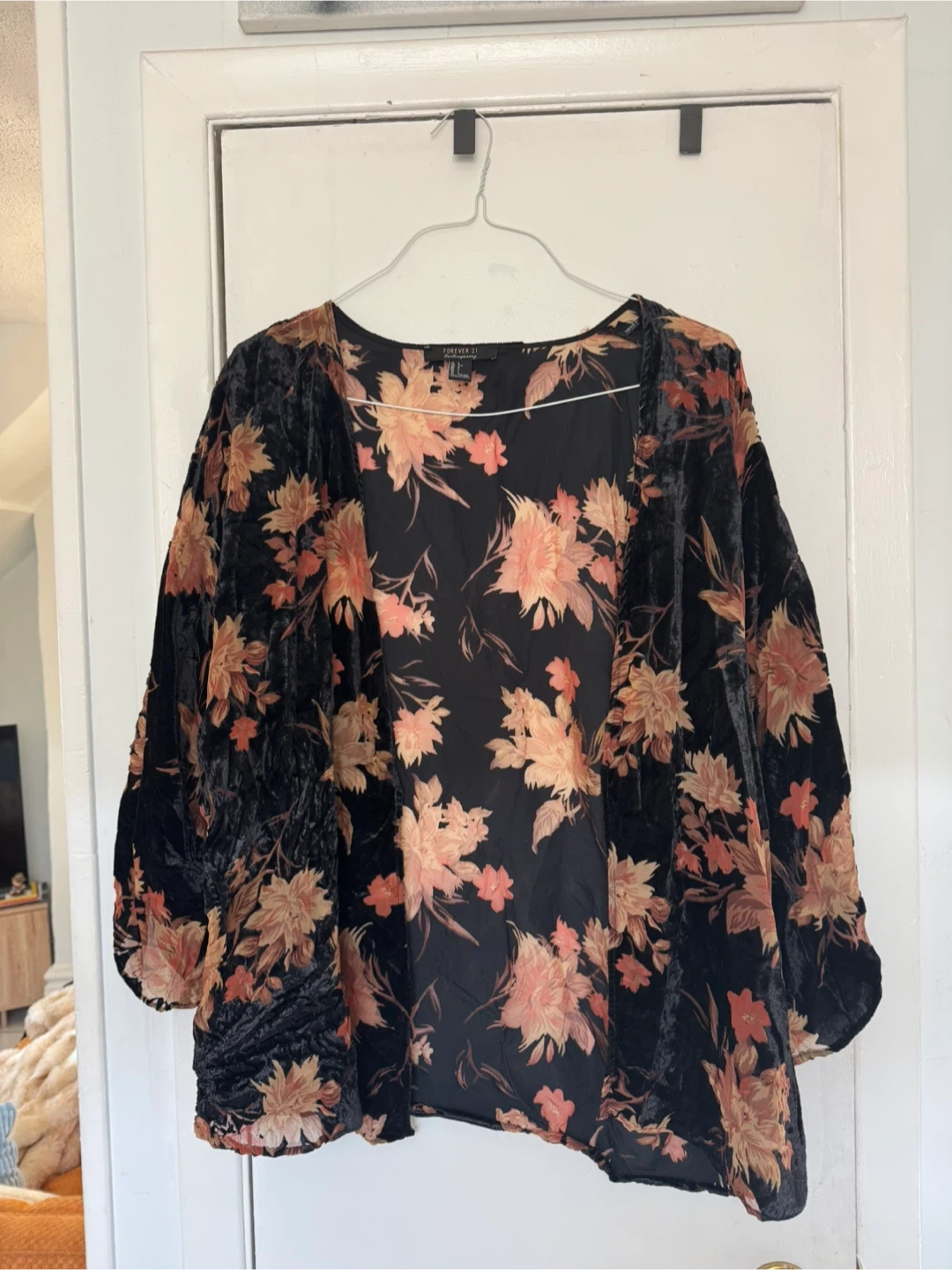 Velvet floral kimono style cardigan, size large but fits best as an oversized medium